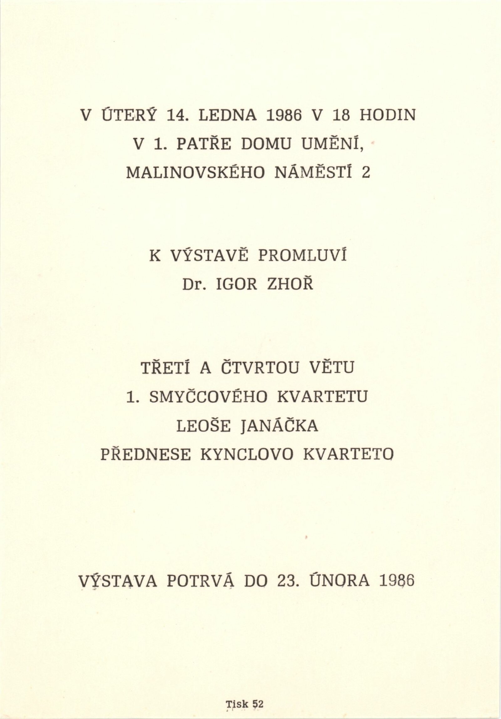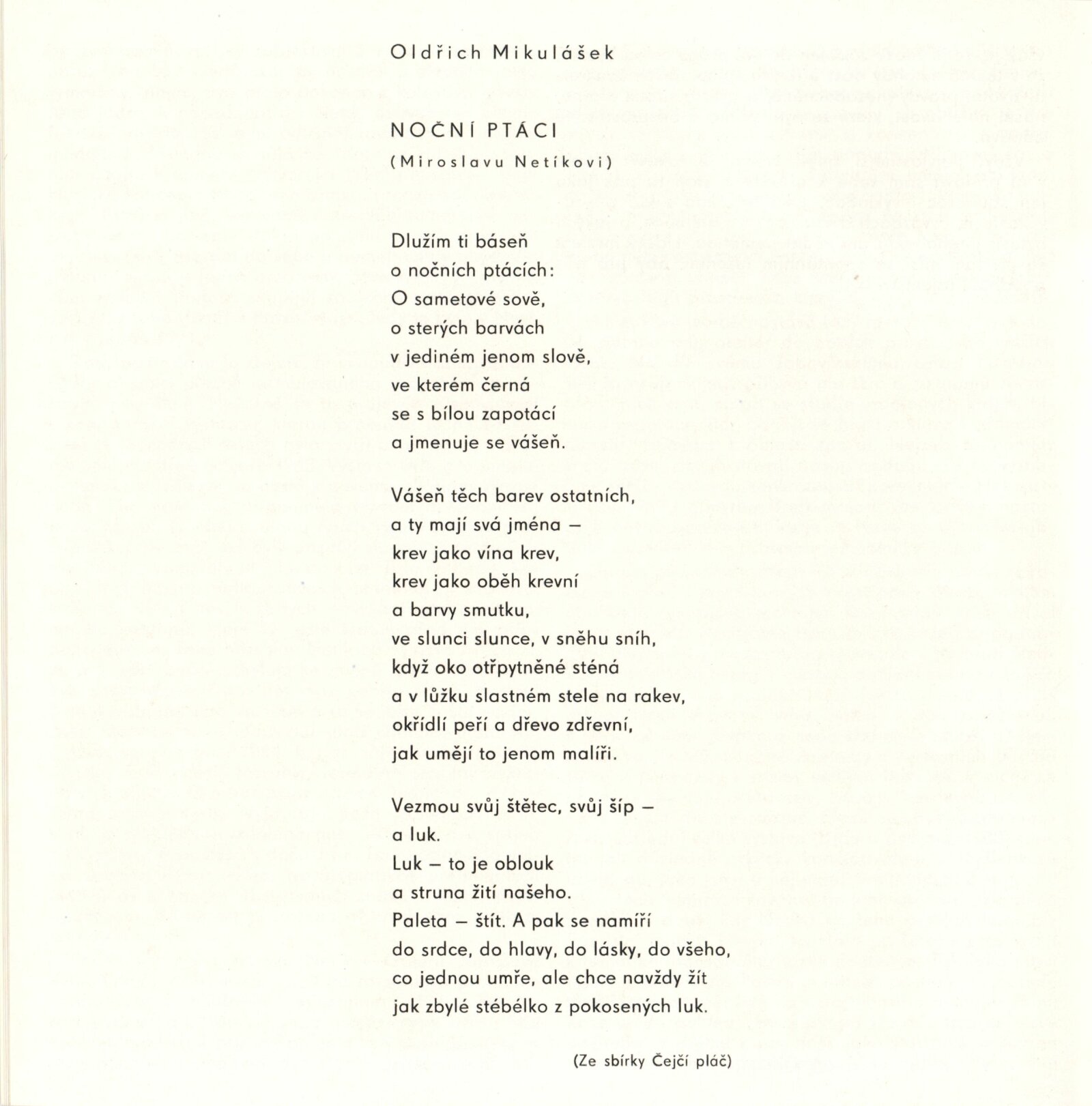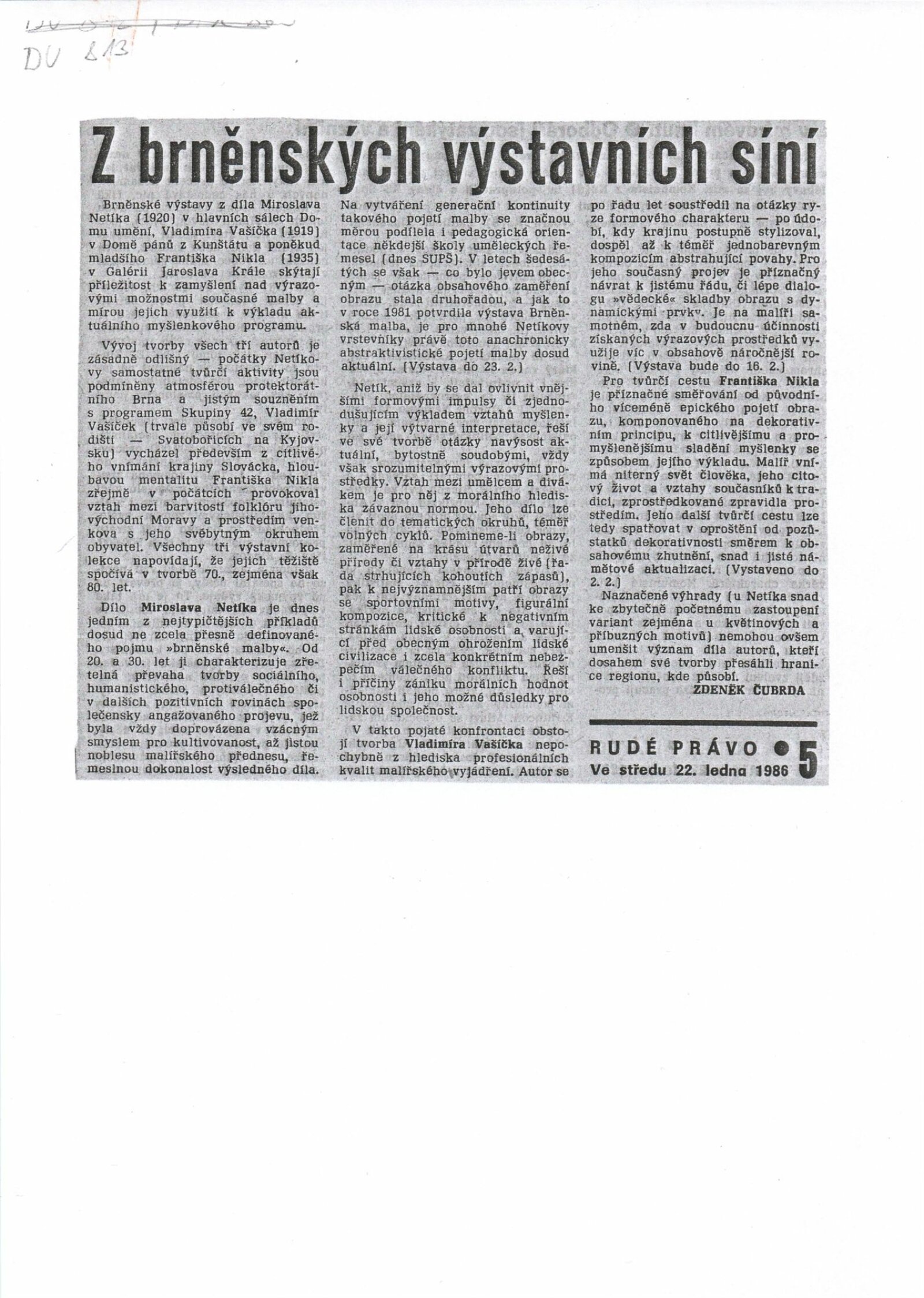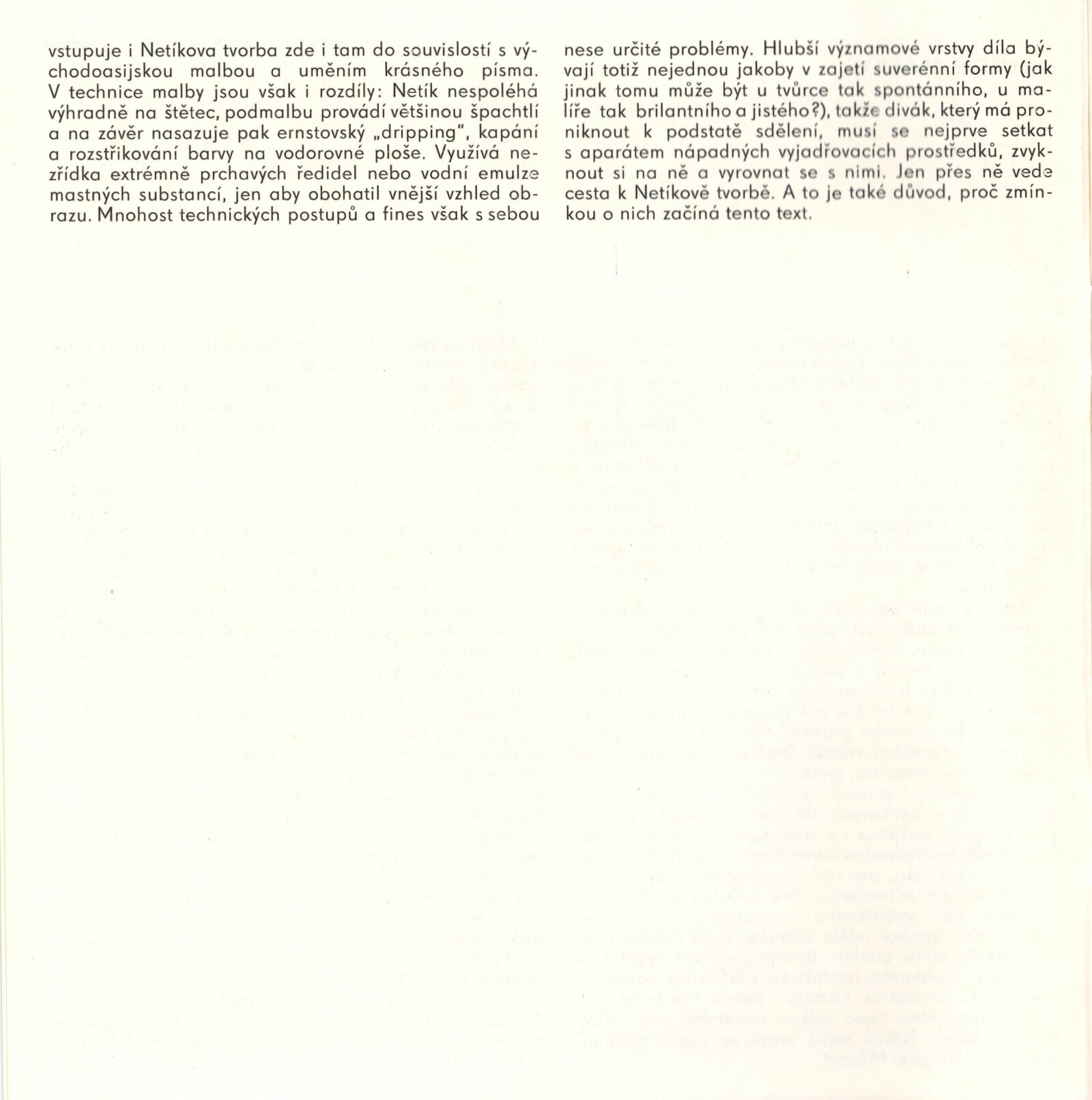 Miroslav Netík. Obrazy: Dům umění města Brna, 14. 1. – 23. 2. 1986 / Text: Igor Zhoř, báseň Oldřich Mikulášek. – Brno: DUmB, 1986. – [28] s., obr., seznam vystavených prací [1] s., životní data, studijní cesty, výstavy, realizace ve spojení s architekturou, zastoupení ve sbírkách, DU 813. – MG; MMB