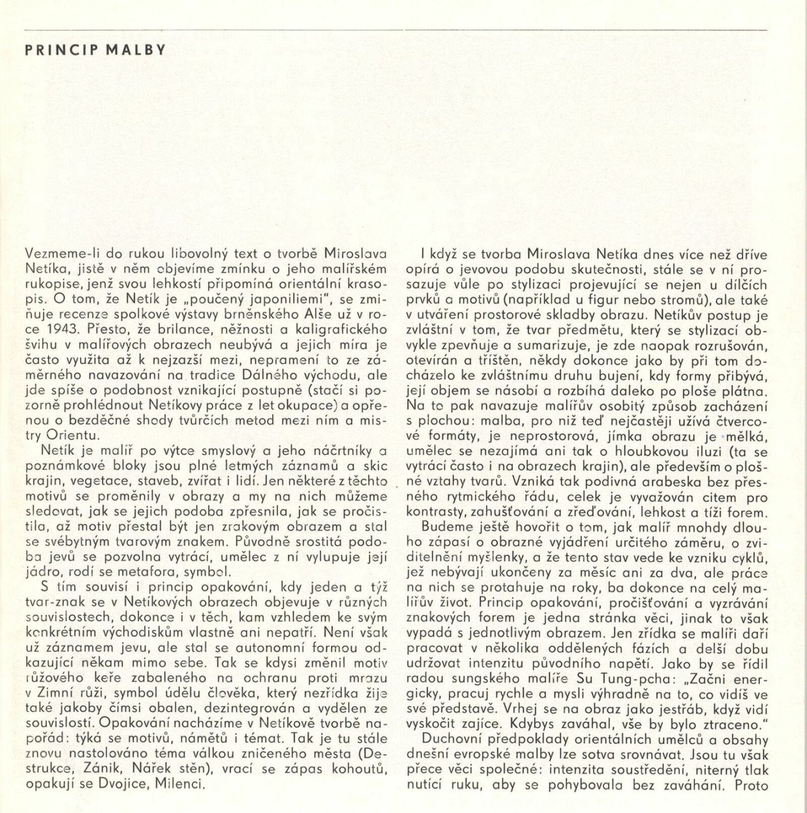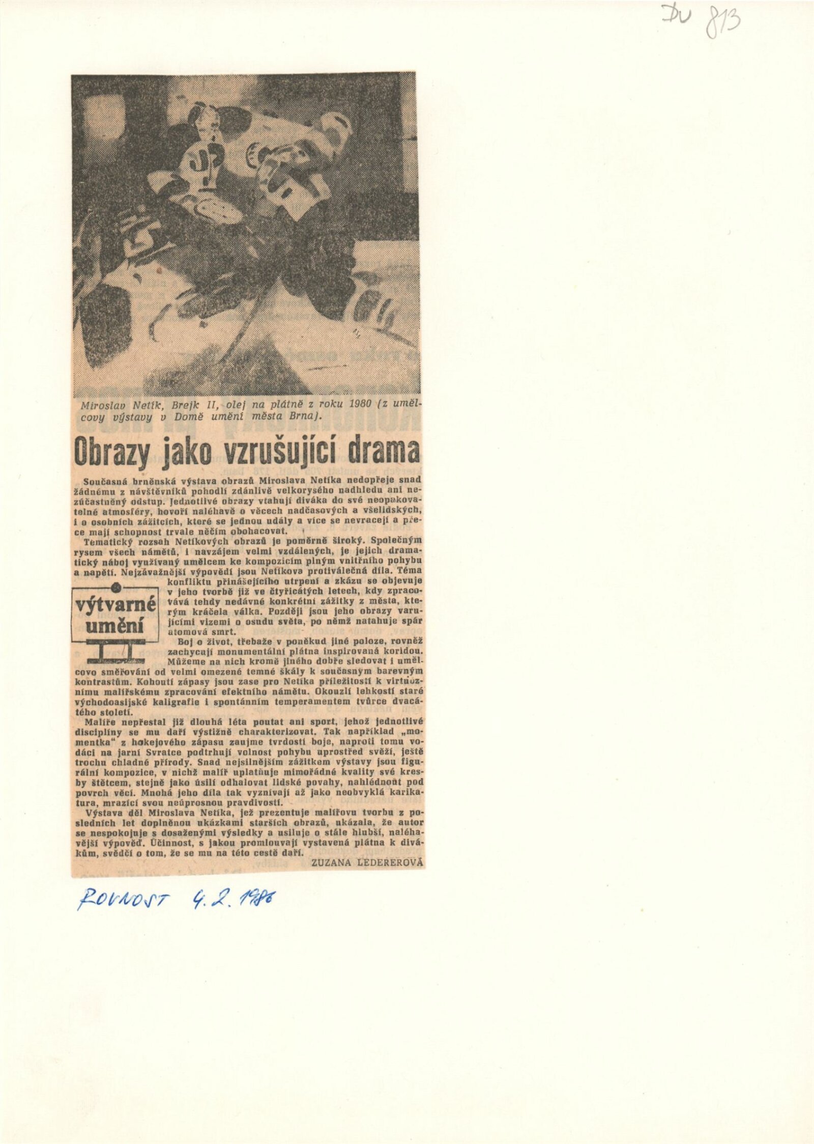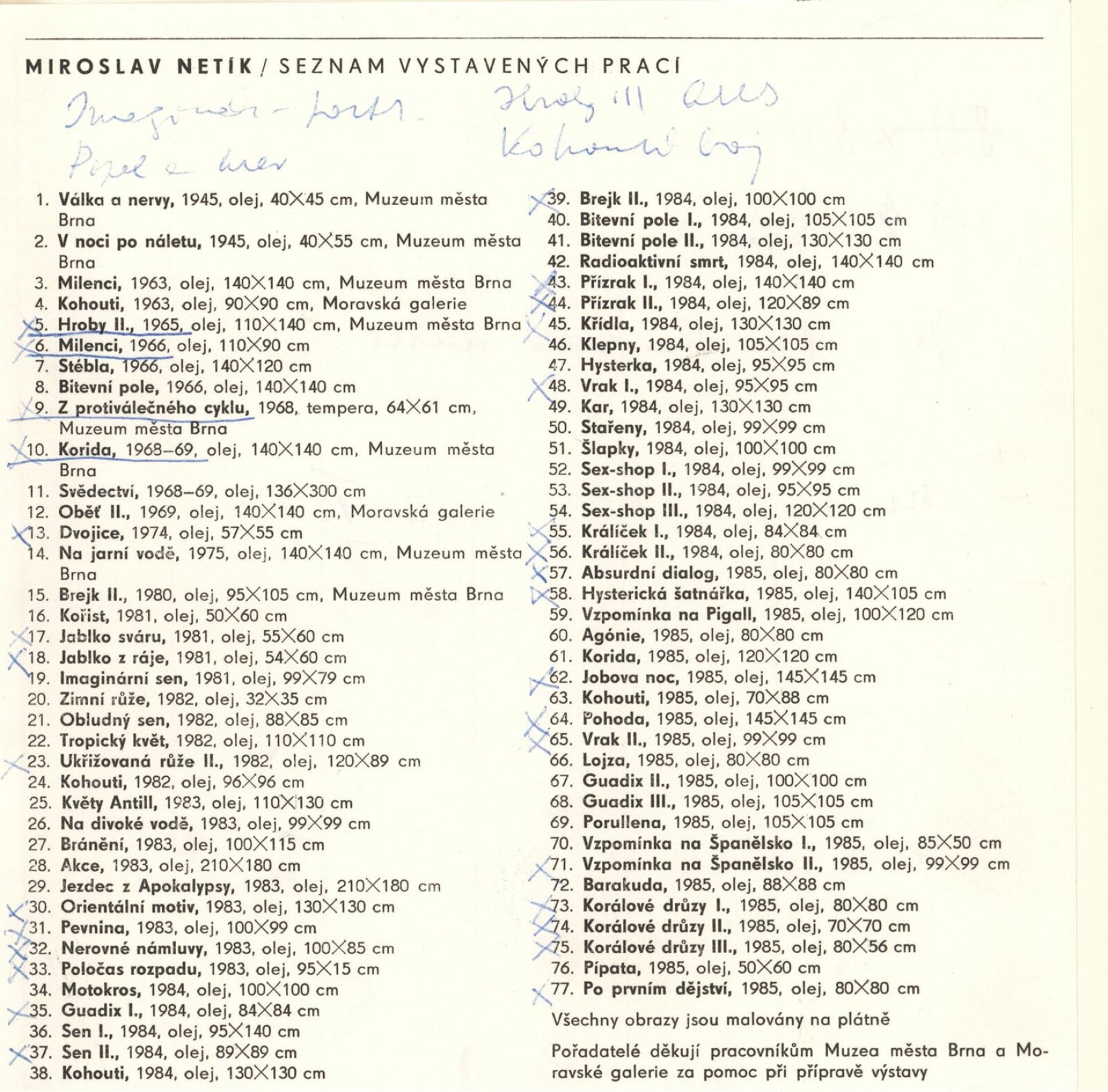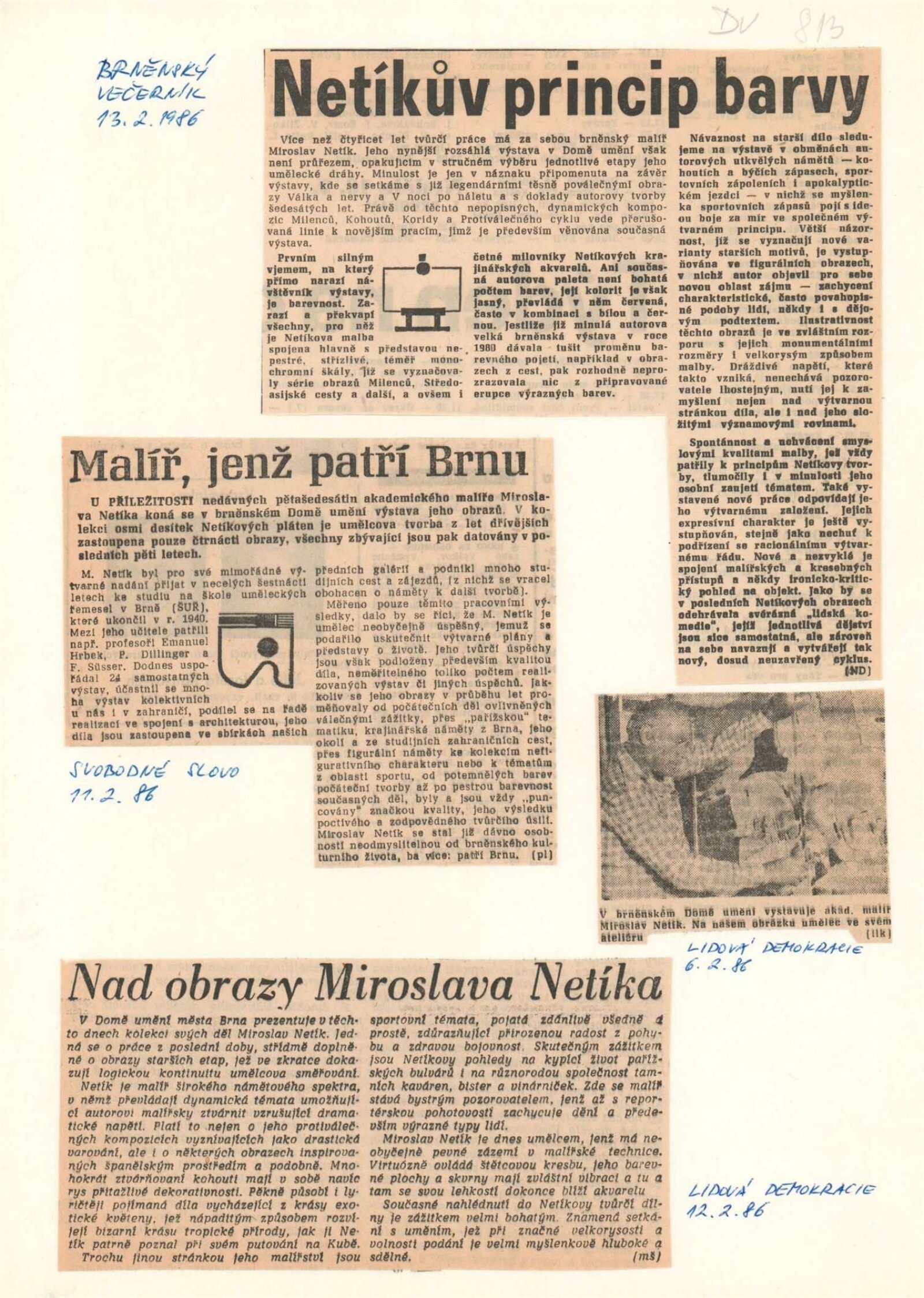 pozvánka, katalog a strojopis, seznam vystavených děl, fotografie děl, provozní korespondence, hospodářská smlouva, žádost o schválení textu katalogu, zápisy o převzetí a smlouvy o výpůjčce, žádost o výstavní termín Miroslava Netíka, žádost o povolení výstavy, recenze v tisku, pozvánka na výstavu M. Netíka ve Velkém Meziříčí (1986)