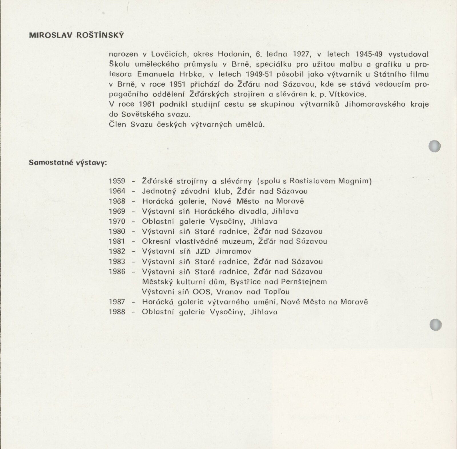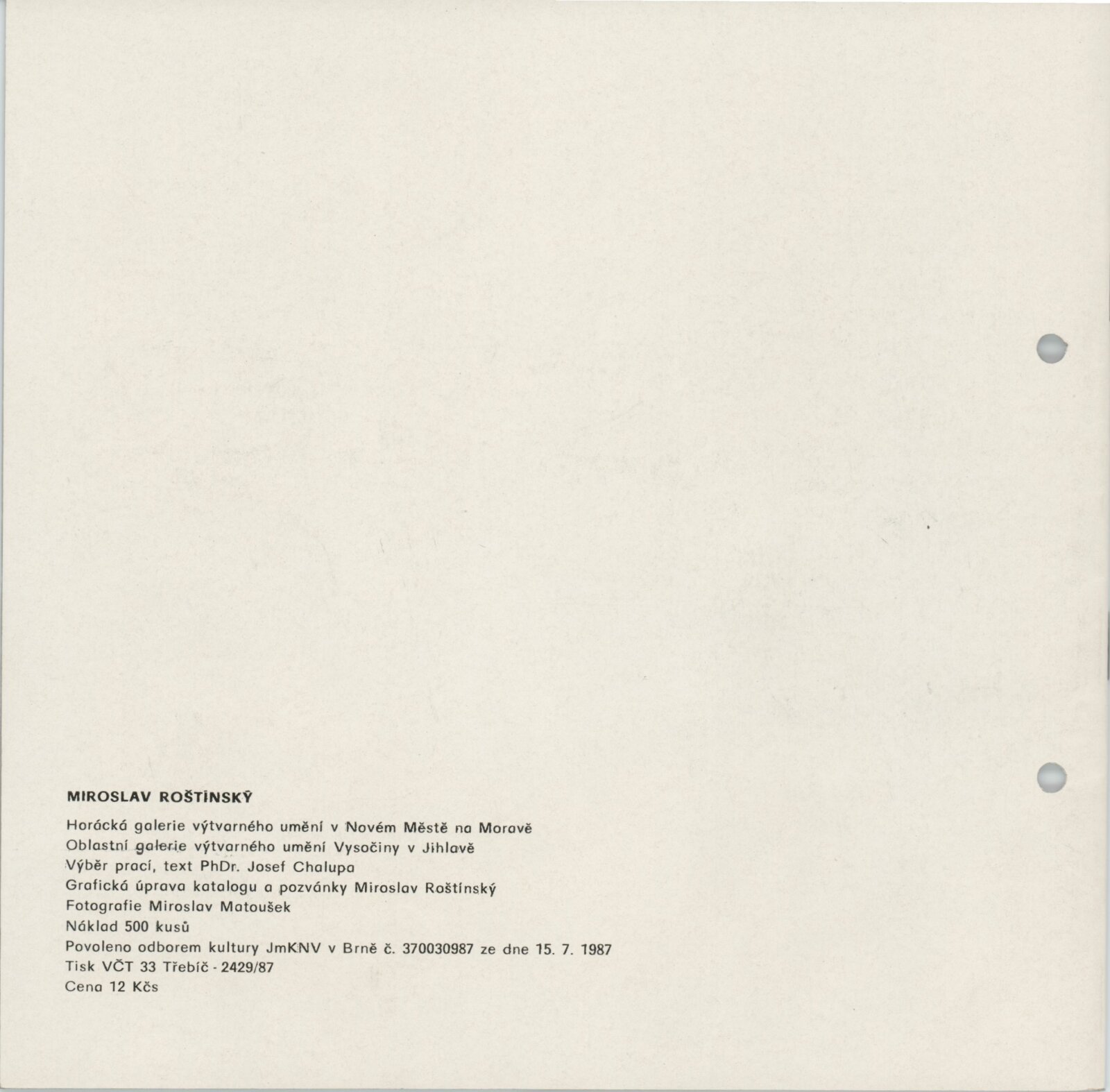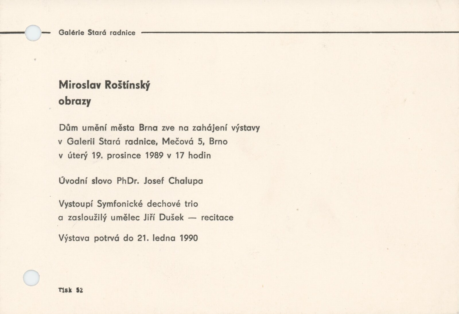 Miroslav Roštínský. Obrazy: Galerie Stará radnice , přízemí, 19. 12. 1989 – 21. 1. 1990 / Převzatý katalog Miroslav Roštínský. Text: Josef Chalupa. – Nové Město na Moravě: Horácká galerie výtvarného umění, 1989. – [20] s., obr., životní data, výstavy, realizace, zastoupení ve sbírkách, GSR 61. – MZK