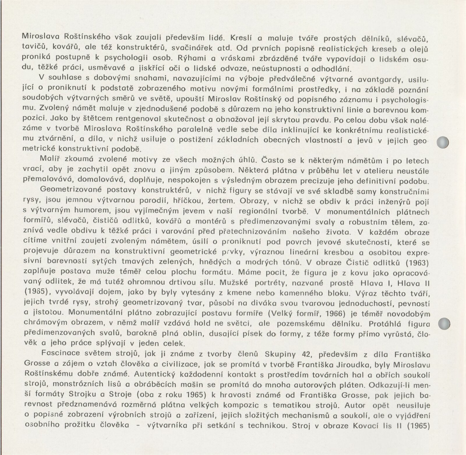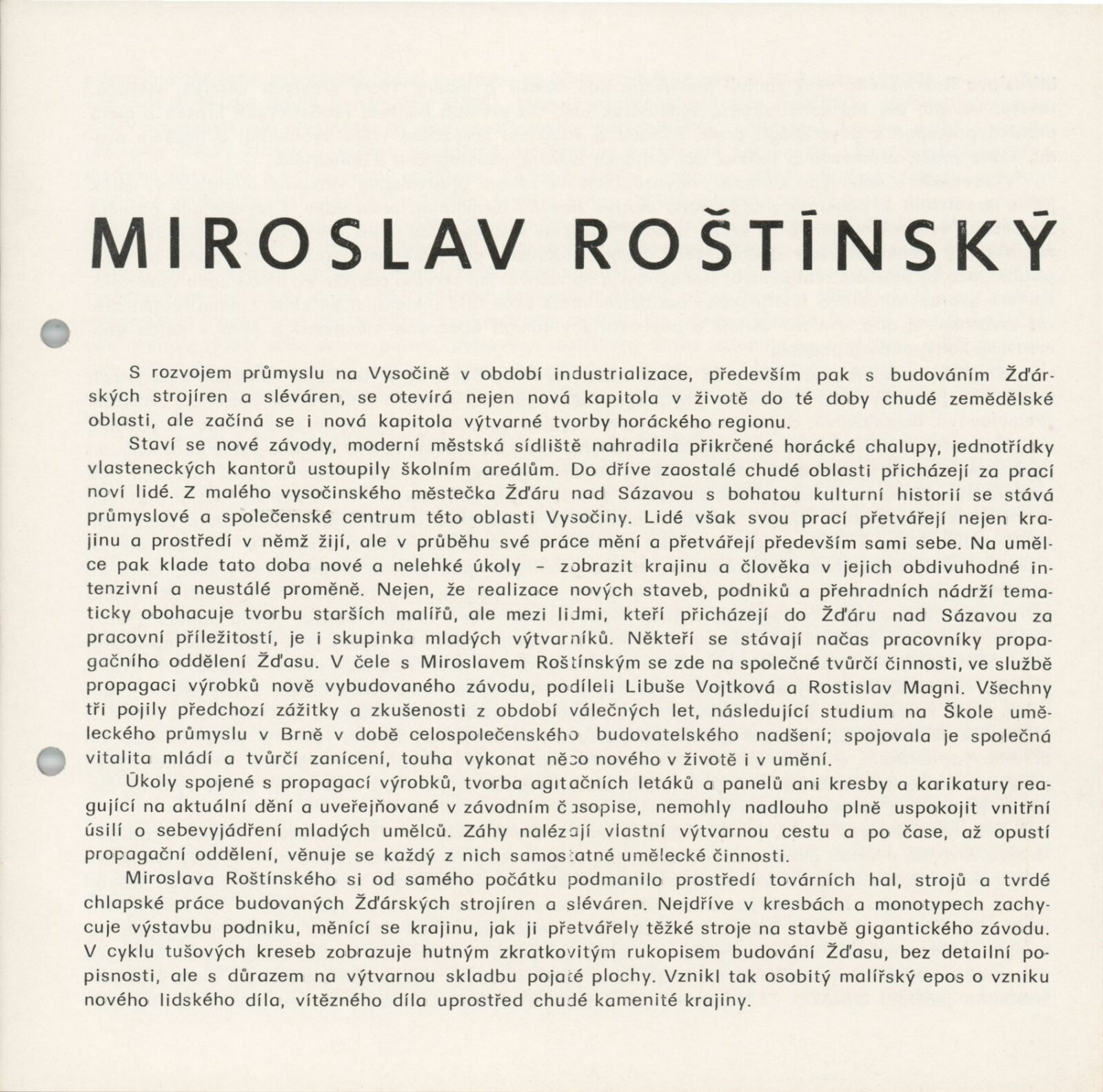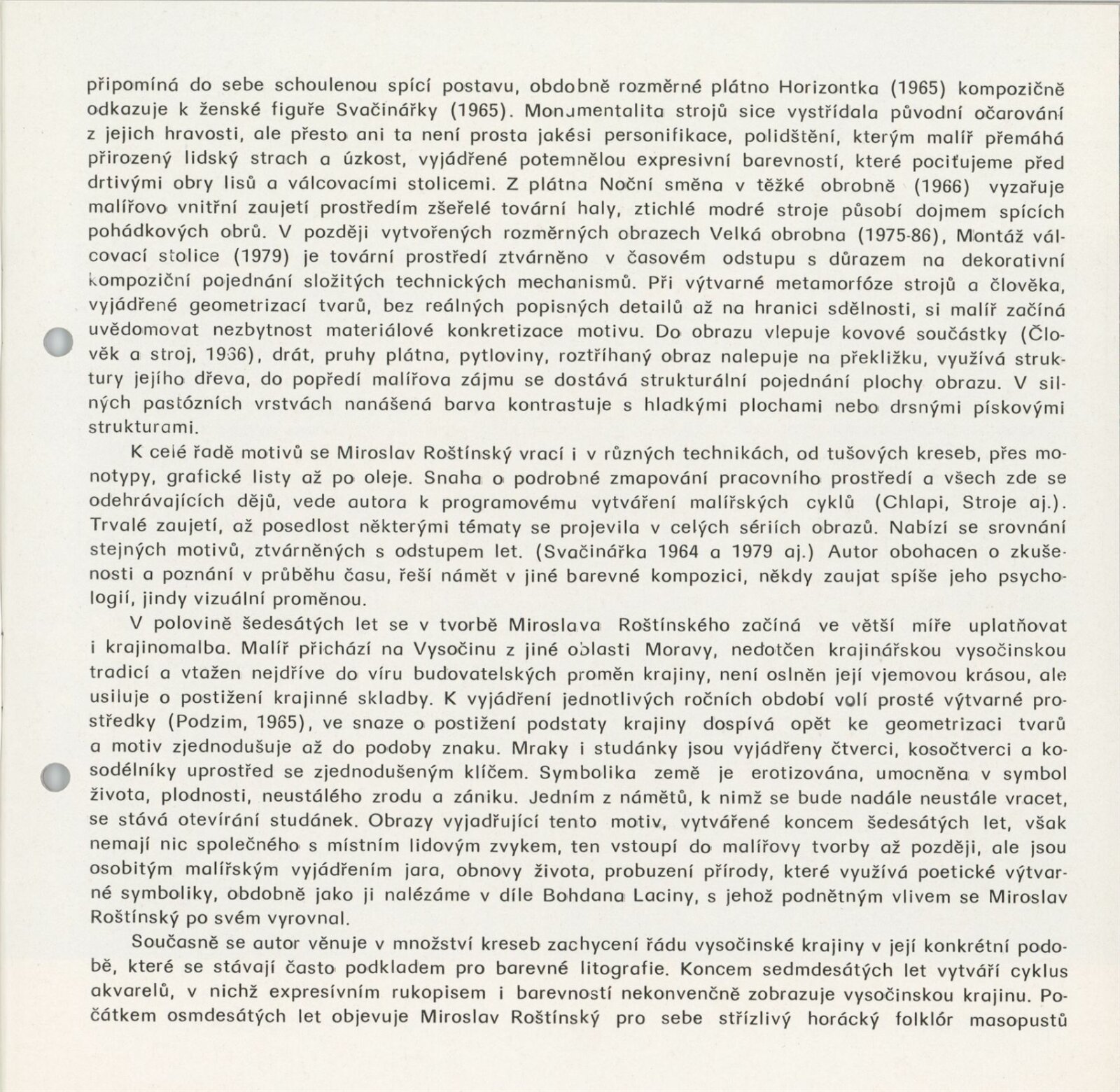 Miroslav Roštínský. Obrazy: Galerie Stará radnice , přízemí, 19. 12. 1989 – 21. 1. 1990 / Převzatý katalog Miroslav Roštínský. Text: Josef Chalupa. – Nové Město na Moravě: Horácká galerie výtvarného umění, 1989. – [20] s., obr., životní data, výstavy, realizace, zastoupení ve sbírkách, GSR 61. – MZK