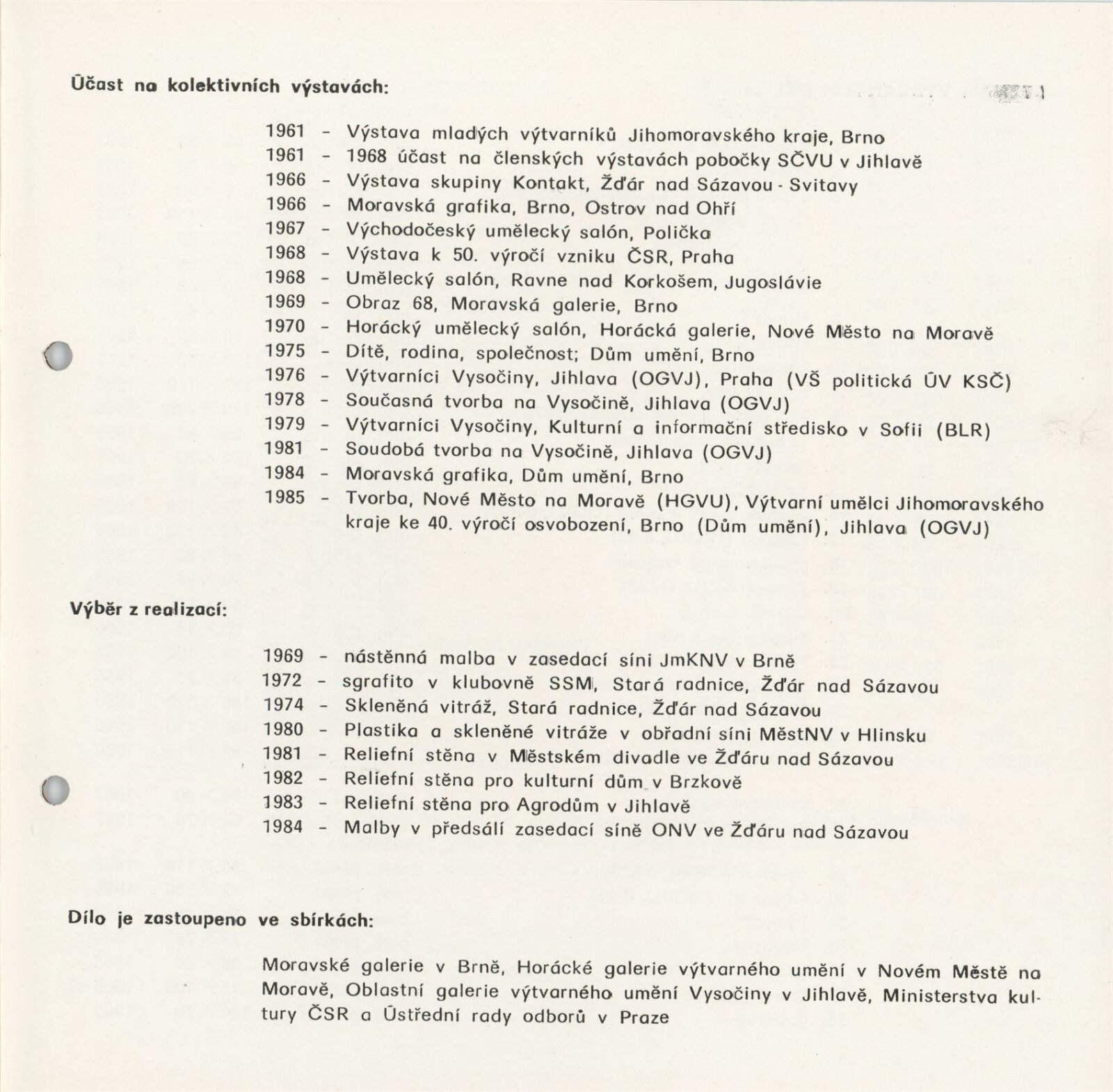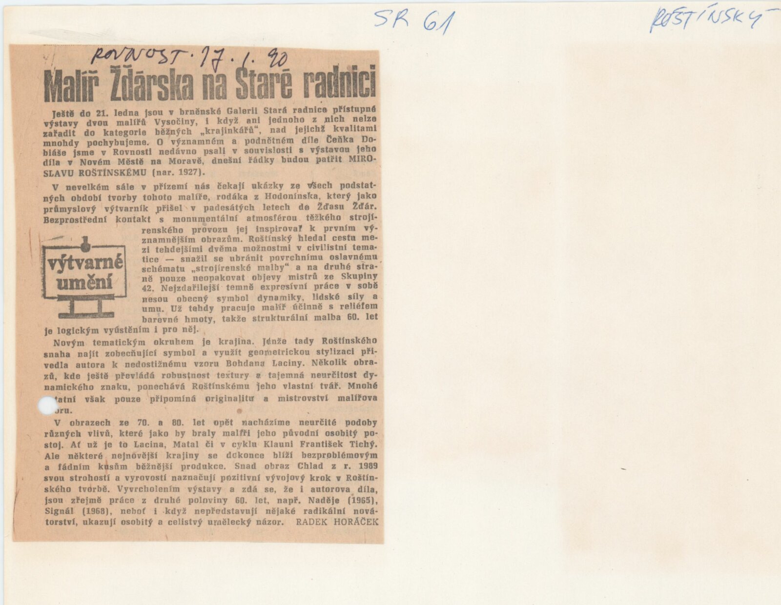 pozvánka, katalog, seznam vystavených děl, pojistný seznam, korespondence (1989), hospodářská smlouva, recenze v tisku, poznámky, propagační materiál (M. Roštínský)