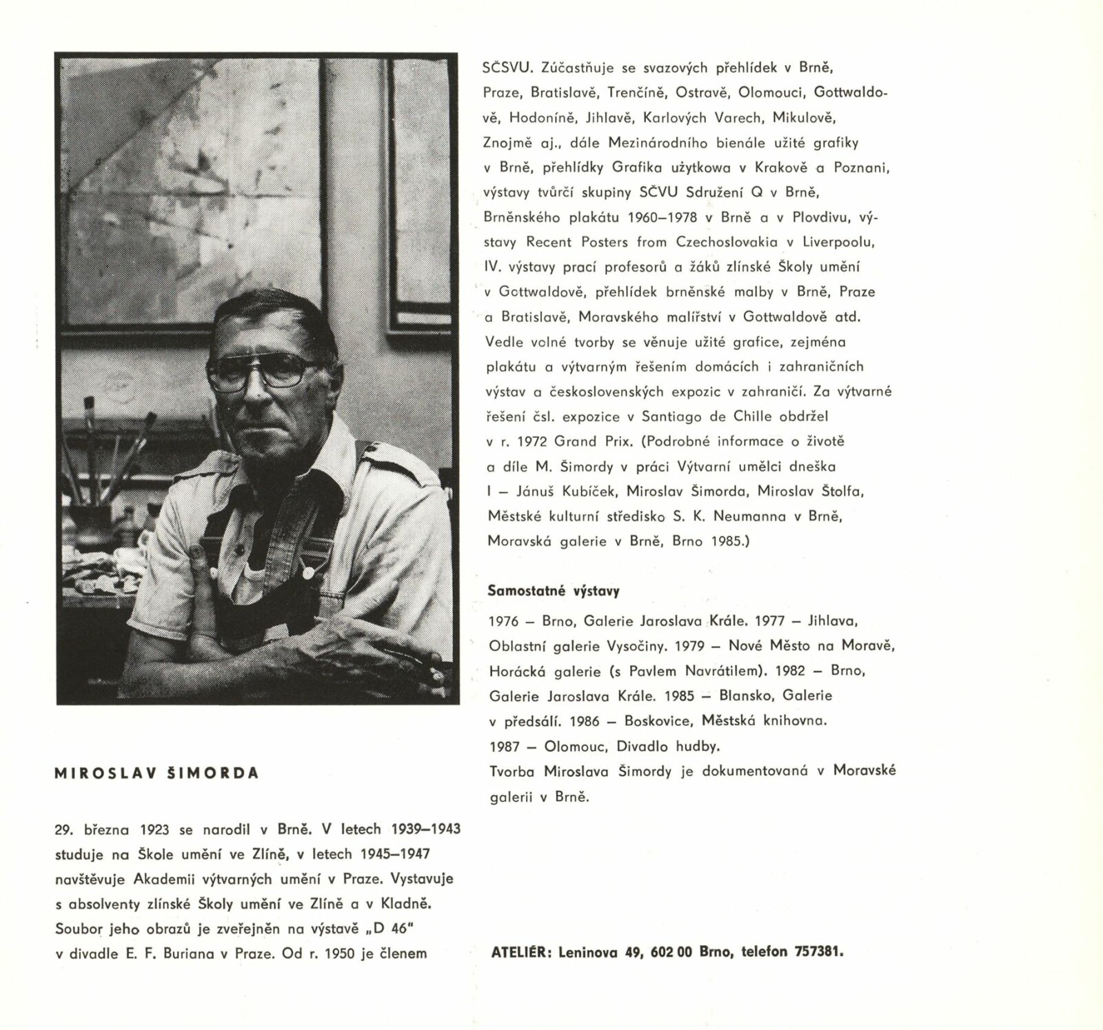 Miroslav Šimorda. Výběr z malířské tvorby: Dům umění města Brna, Galerie Jaroslava Krále, 6. 9. – 8. 10. 1989 / Text: Bronislava Gabrielová. – Hodonín: Galerie výtvarného umění, 1989. – [24] s., obr., portrét, životopis, výstavy, DU 871. – MZK; MG