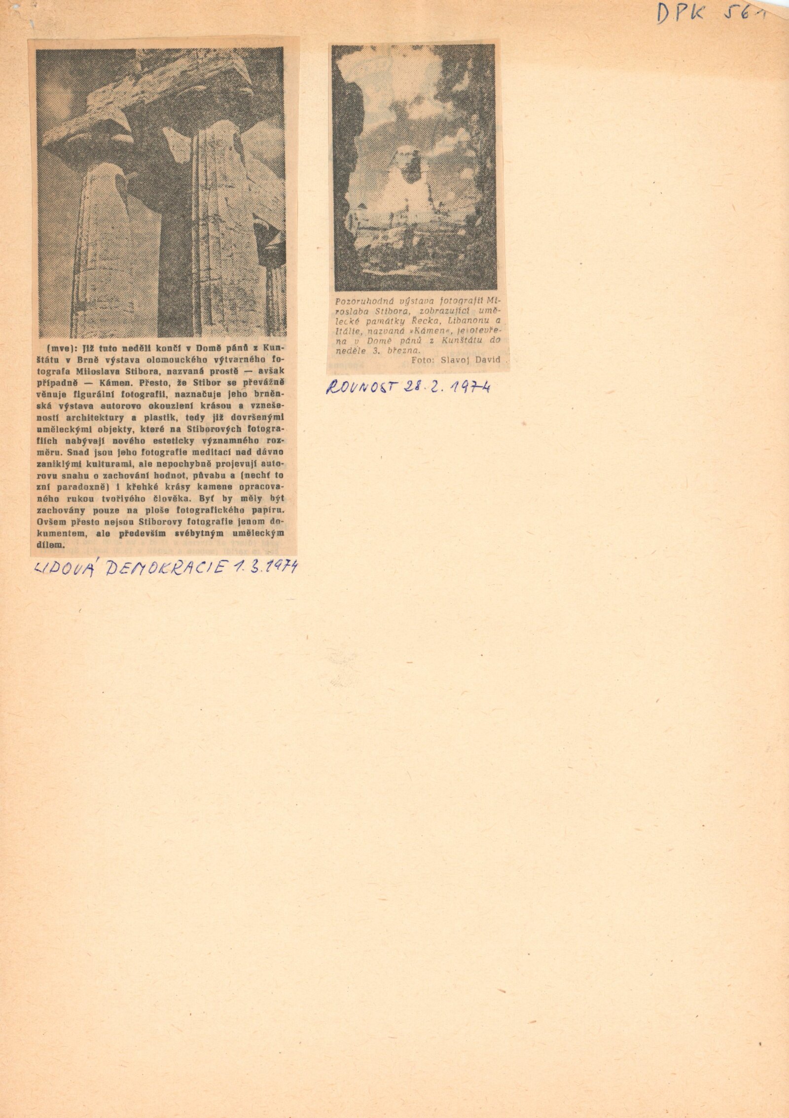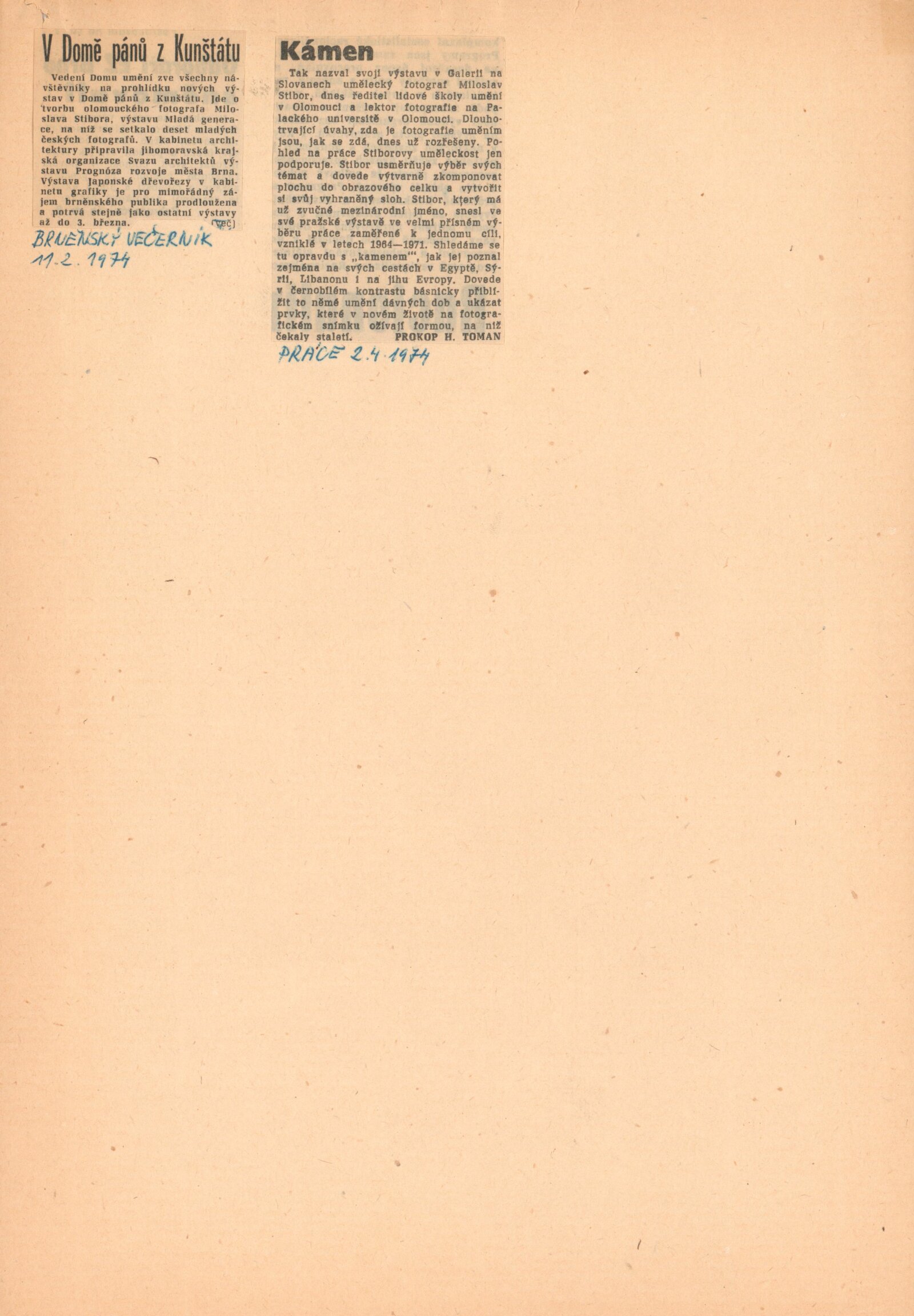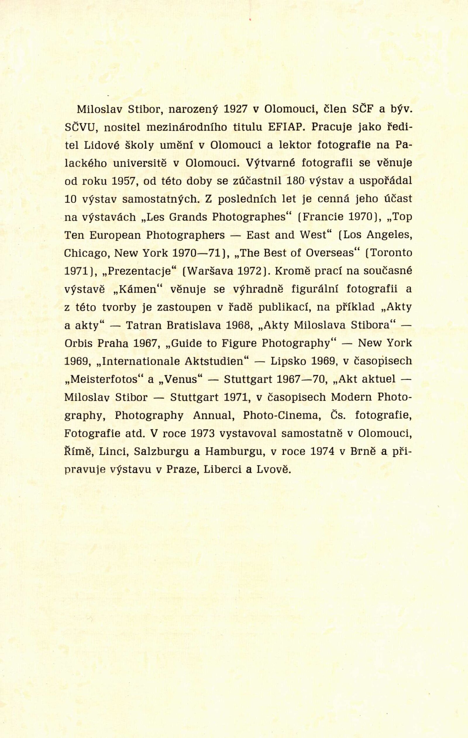 Kámen. Výstava fotografií Miloslava Stibora: Dům umění / Dům pánů z Kunštátu, 8. 2. – 3. 3. 1974 / Text: Alena Nádvorníková. – Brno: DUmB, 1974. – skládačka 6 s., obr., DPK 561