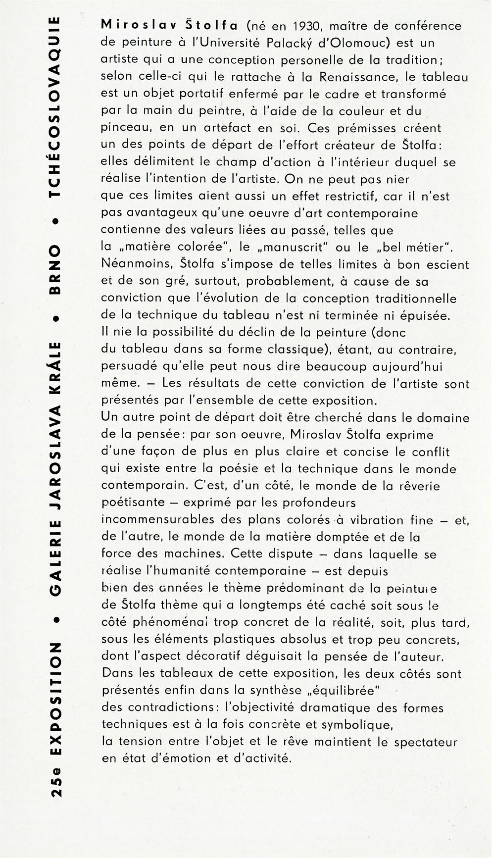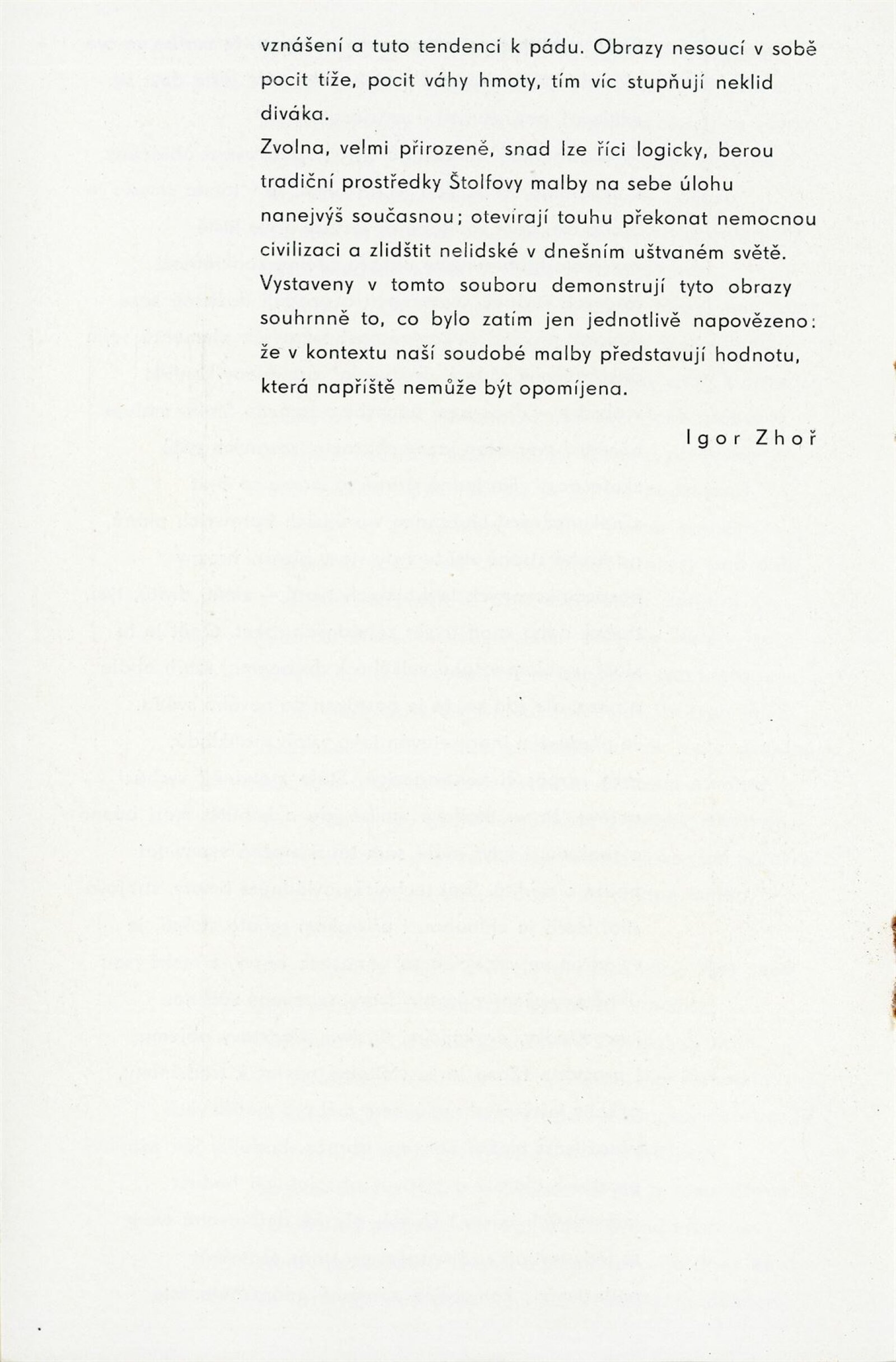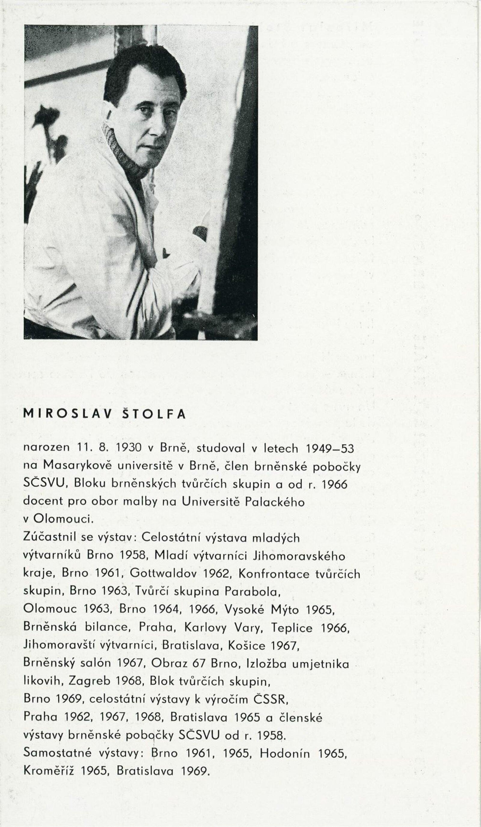 Miroslav Štolfa. Obrazy: Dům umění, 25. výstava v Galerii Jaroslava Krále, 4. 5. – 1. 6. 1969 / Text: Igor Zhoř. – Brno: ČFVU, 1969. – 10 s., obr., portrét, životopis, DU 521. – MZK; MG; MMB