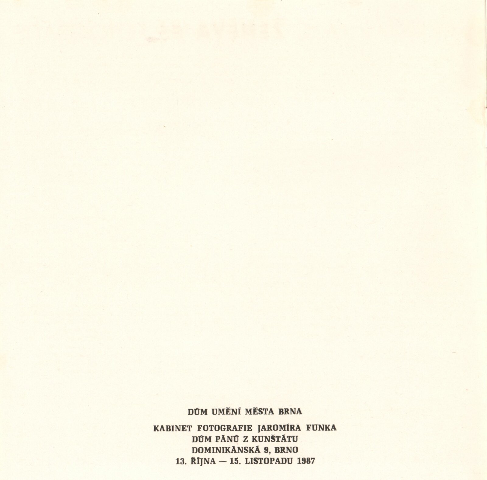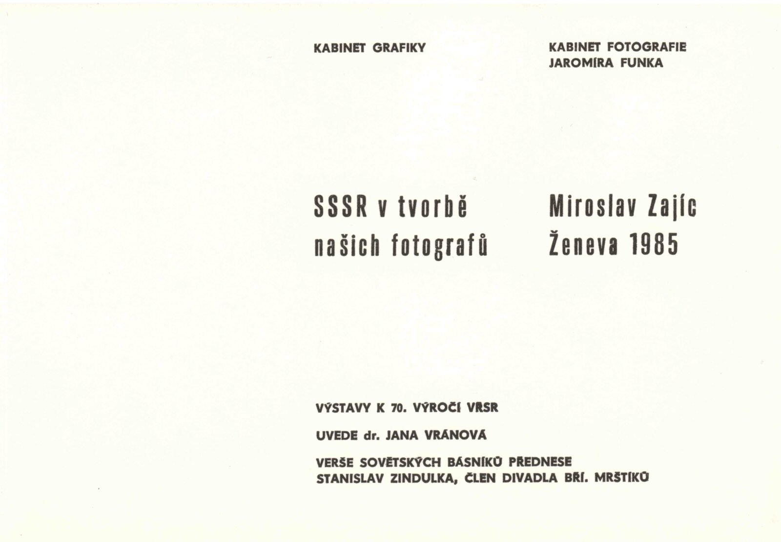 Miroslav Zajíc. Ženeva 85. Fotografie: Dům umění / Dům pánů z Kunštátu, Kabinet fotografie Jaromíra Funka, 13. [spr. 21.] 10. – 15. 11. 1987 / Text: anonymní. – Brno: DUmB, 1987. – [12] s., obr., DPK 899. – MZK; MG