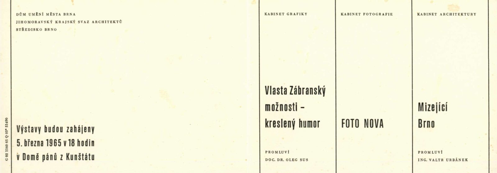 Mizející Brno. Materiál ze studijního úkolu Ing. arch. Otakara Máčela: Dům umění města Brna / Dům pánů z Kunštátu, Kabinet architektury Svazu architektů ČSSR, 5. 3. – 28. 3. 1965. – Brno: Svaz architektů ČSSR, 1965. – 4 s., obr., DPK 261