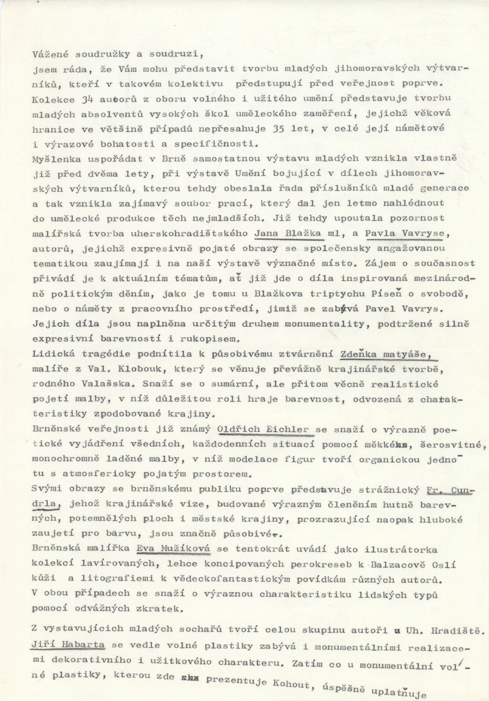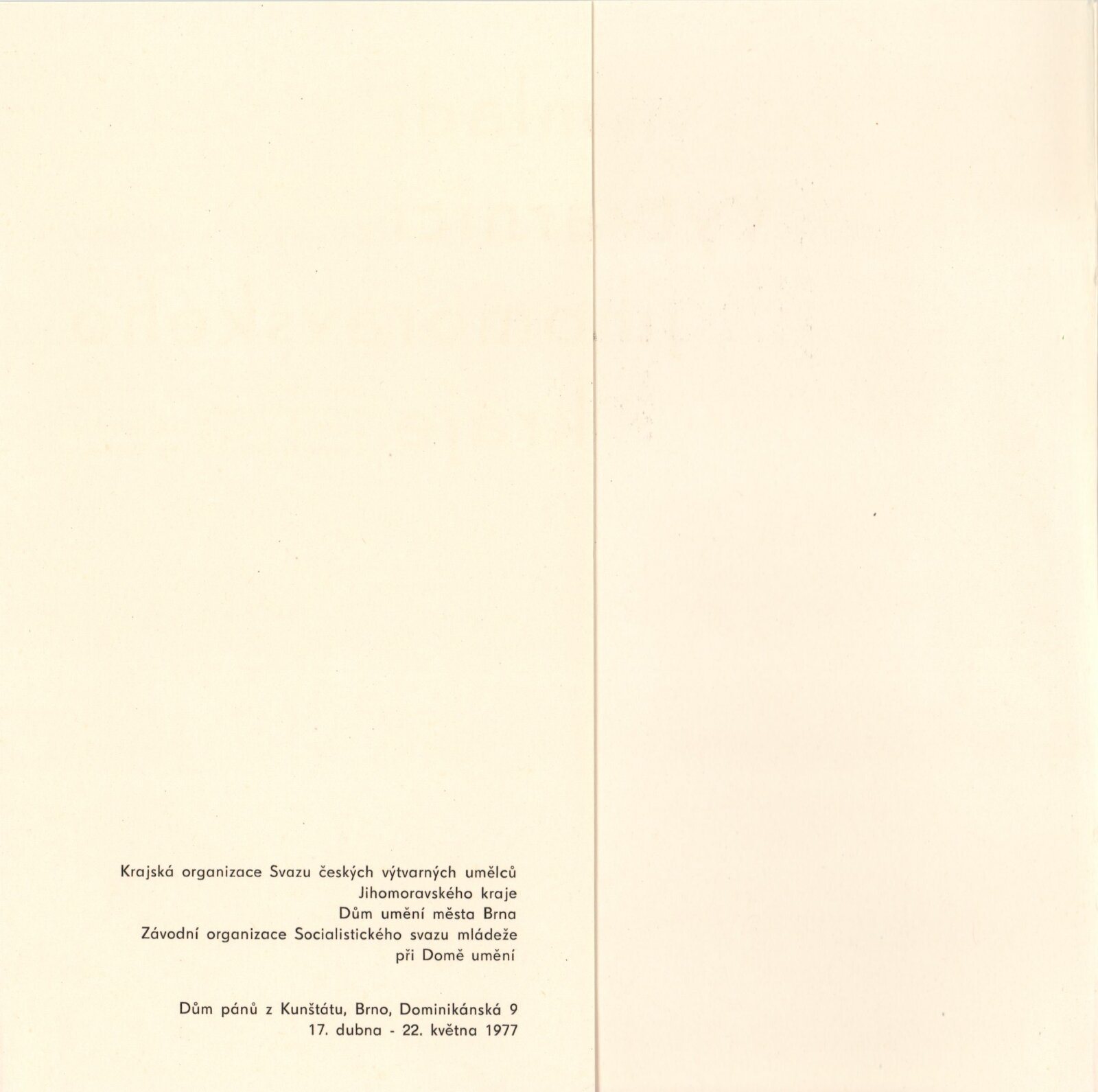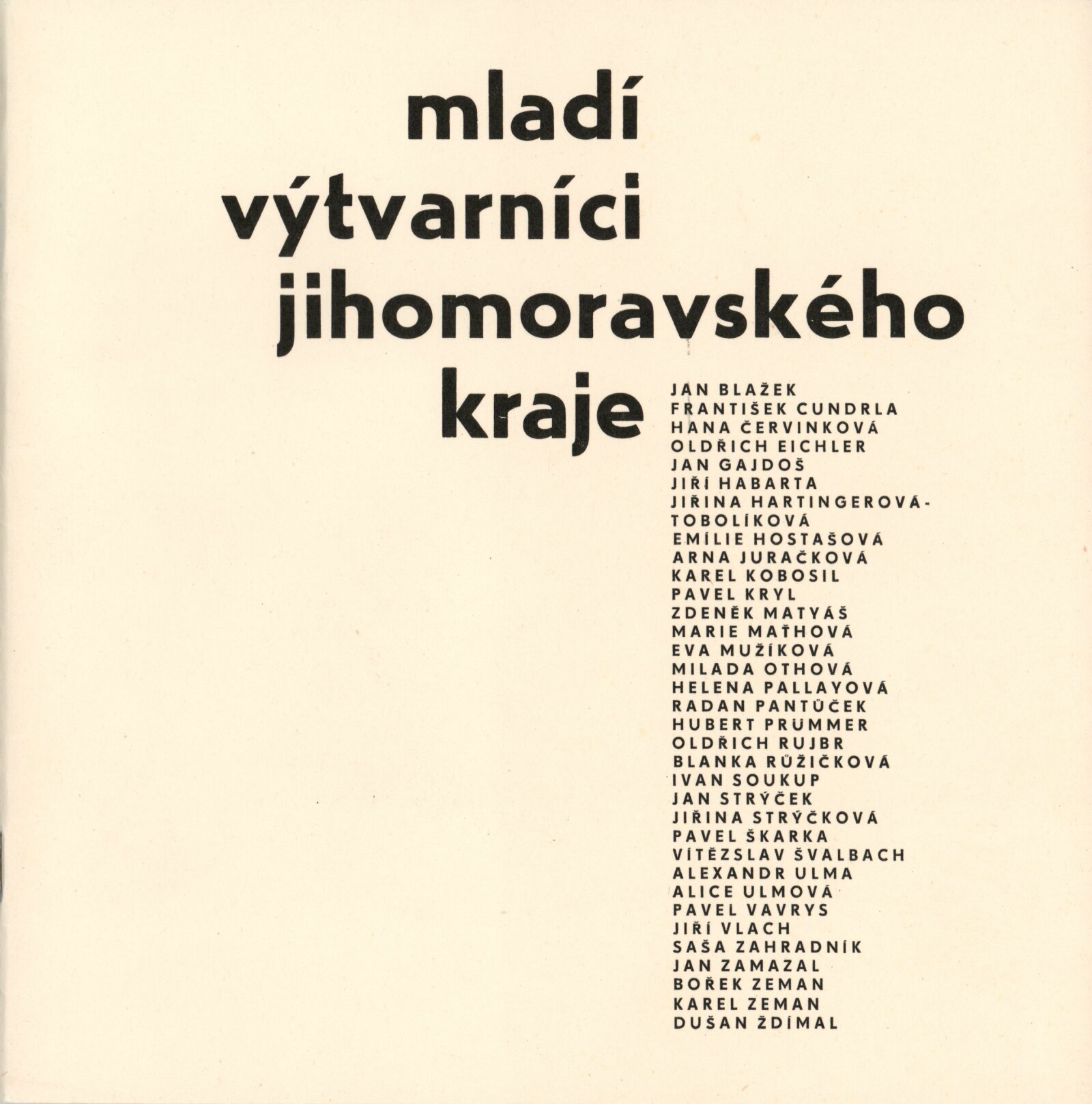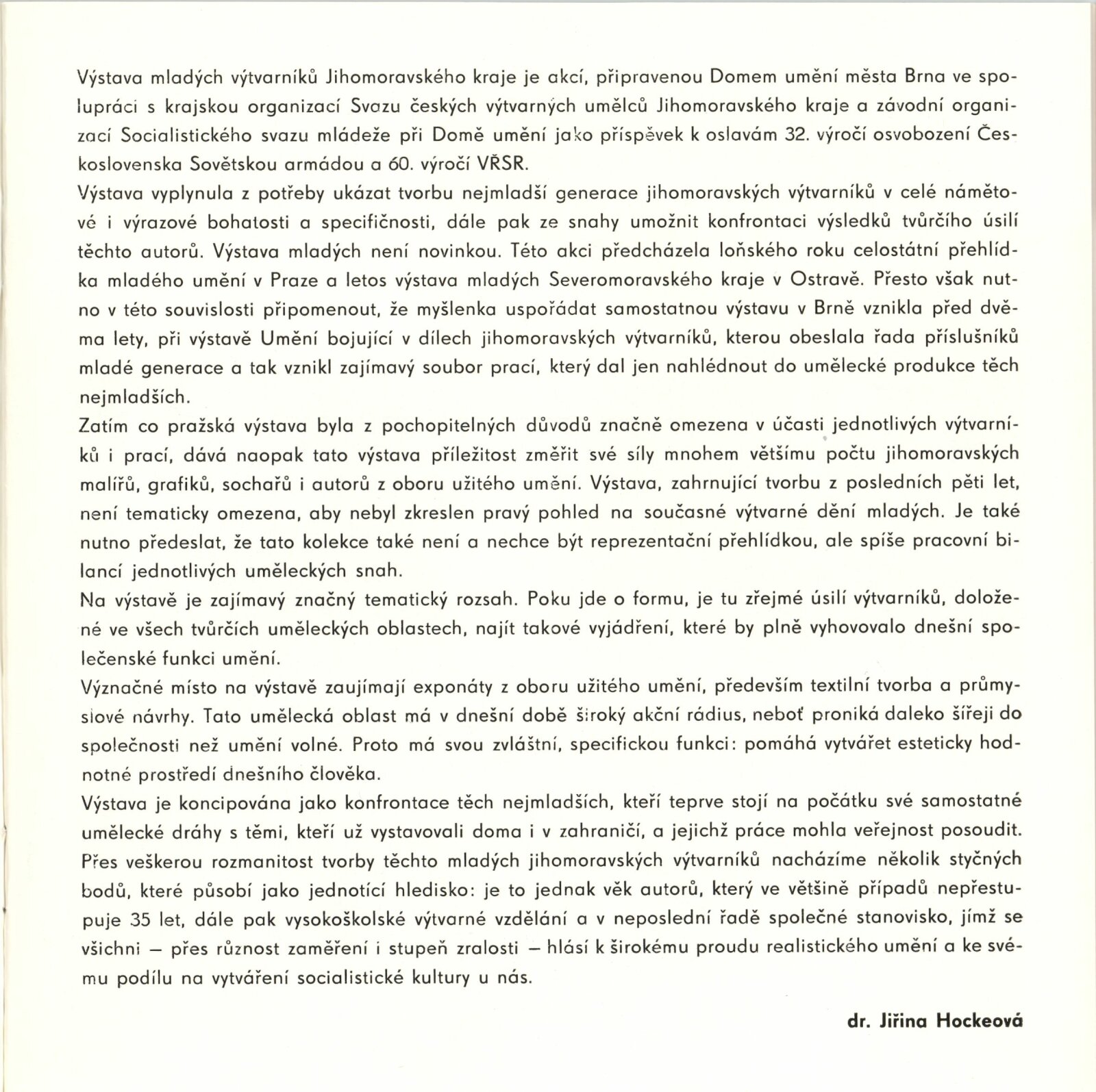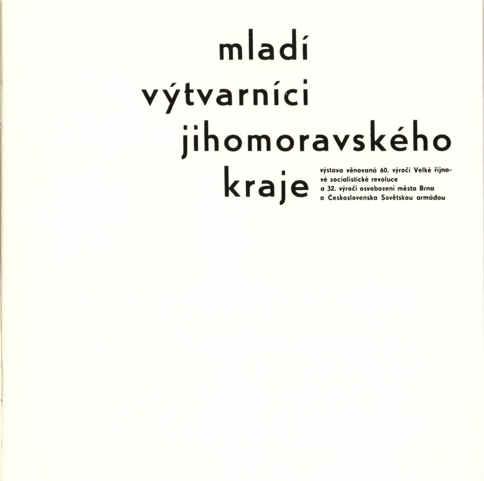 Mladí výtvarníci Jihomoravského kraje. Výstava věnovaná 60. výročí Velké říjnové socialistické revoluce a 32. výročí osvobození města Brna a Československa Sovětskou armádou: Dům umění / Dům pánů z Kunštátu, 17. 4. – 22. 5. 1977 / Text: Jiřina Hockeová. – Brno: DUmB, 1977. – 36 s., obr., seznam vystavených prací 2 s., životopisy, DPK 651. – MG