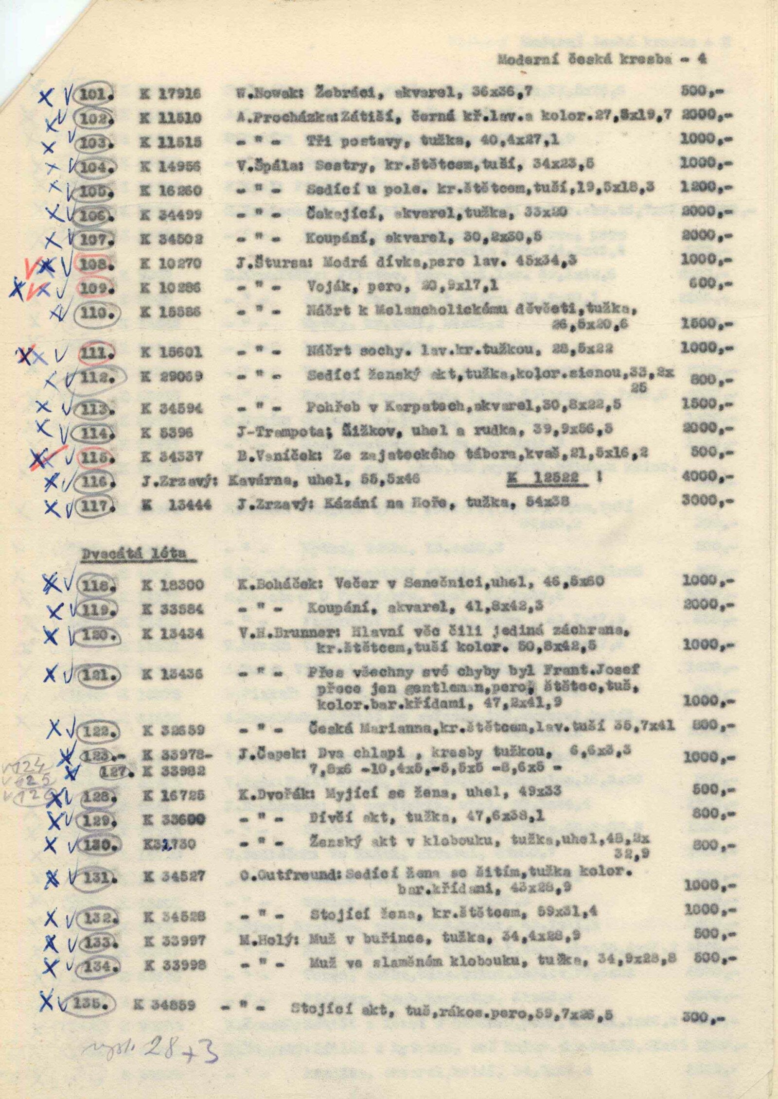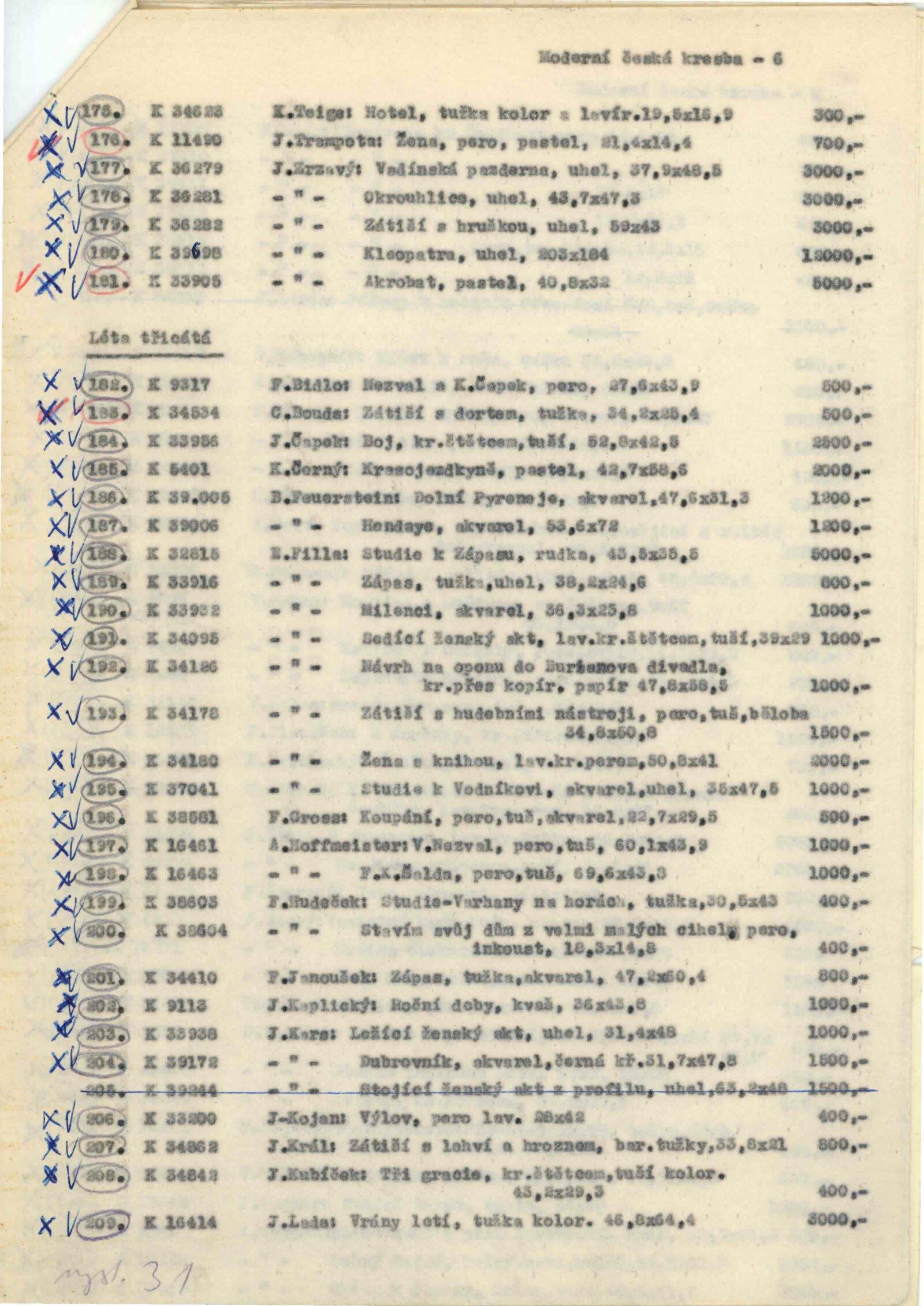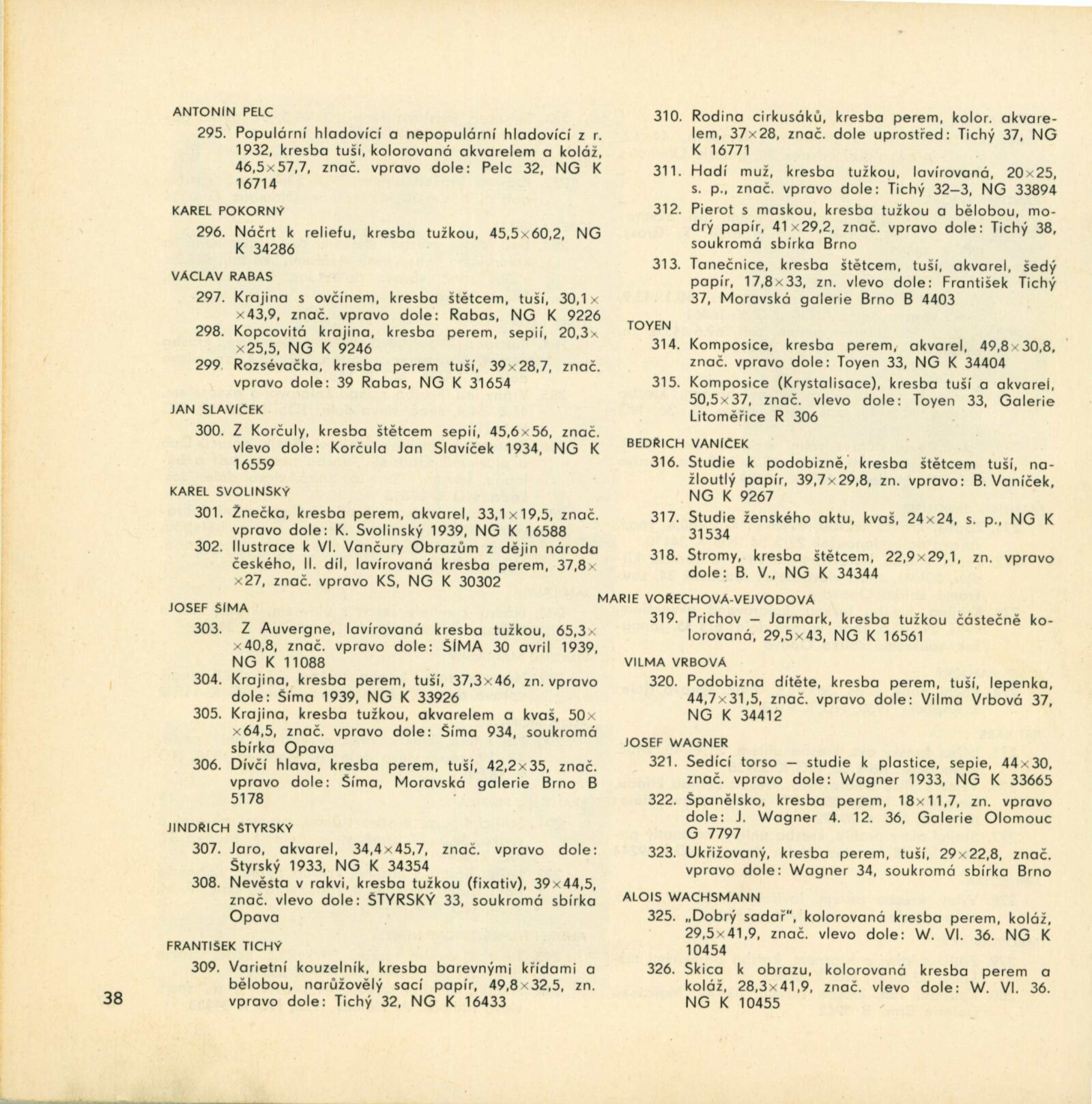 Moderní česká kresba: Dům umění, 12. 9. – 10. 10. 1965 / Převzatý katalog. Moderní česká kresba 1900–1950: Palác Kinských, Praha, květen–srpen 1965 / Text: Petr Spielmann. – Praha: Národní galerie, 1965. – 52 s., obr., DU 444. – MG