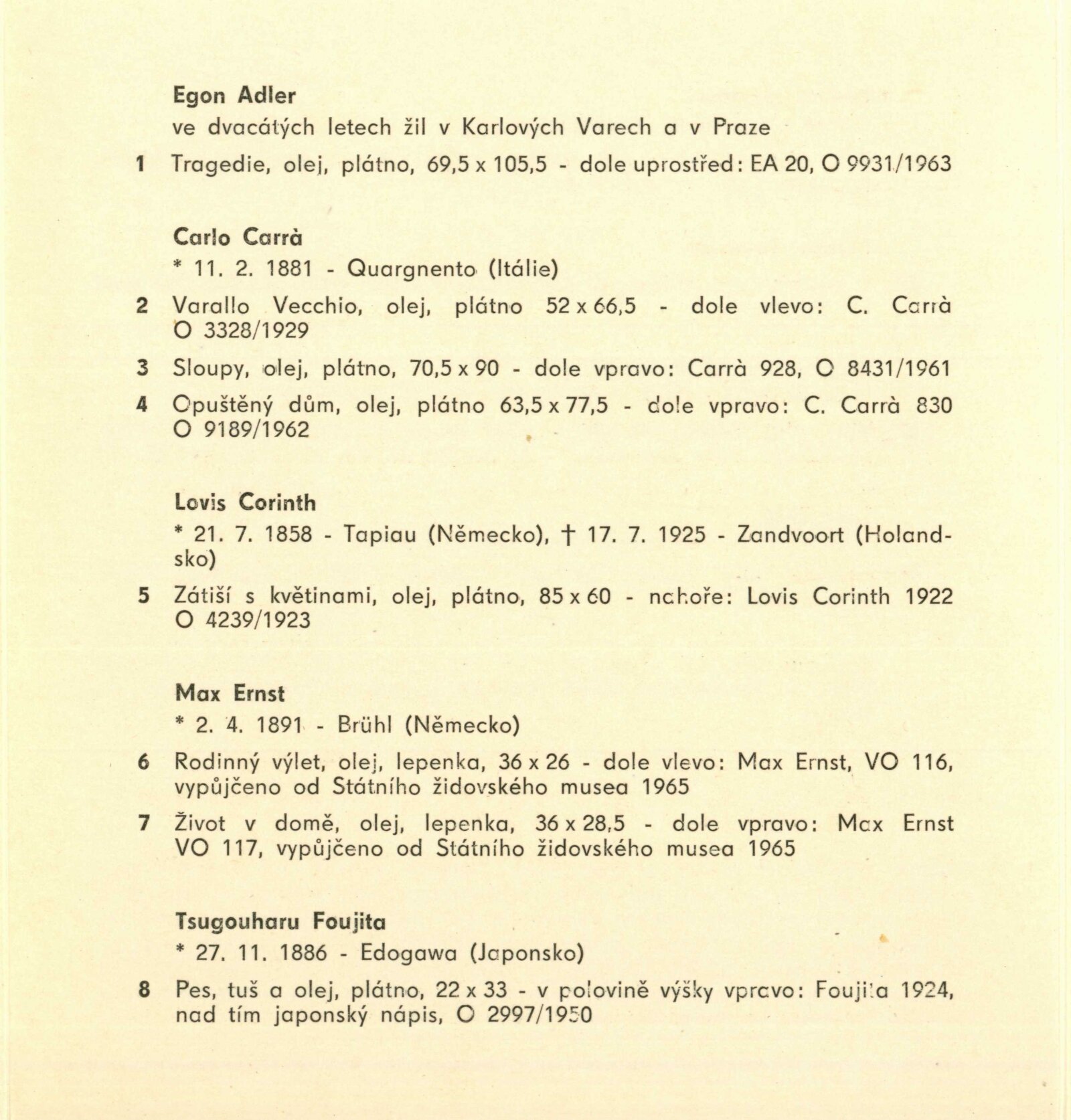 pozvánka, katalog, leták DU, úvodní slovo, zpráva o družbě DU a Stát. filharmonie Brno, seznam vystavených děl, provozní korespondence (dopisy NG a DU), reverzy, smlouva o výpůjčce výstavy, recenze v tisku (rozhovor s Adolfem Kroupou), pozvánky na výstavy v Praze, složka zahraničních přírůstků z depozitáře NG (spol. pozvánka DU 443–444, katalog, seznam vystavených děl, smlouva o výpůjčce výstavy), plakát (NG Praha)