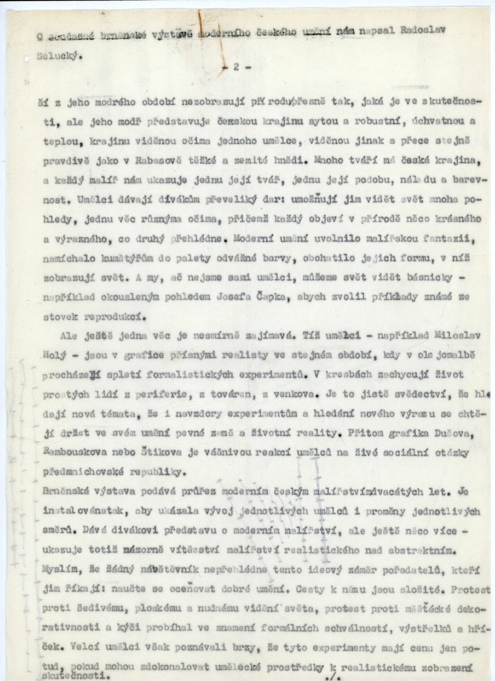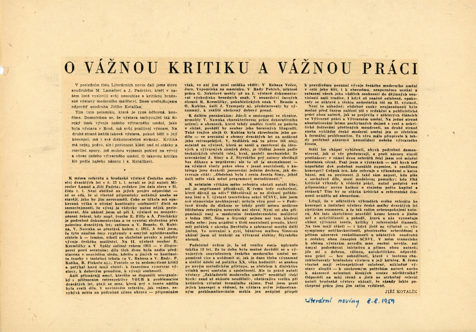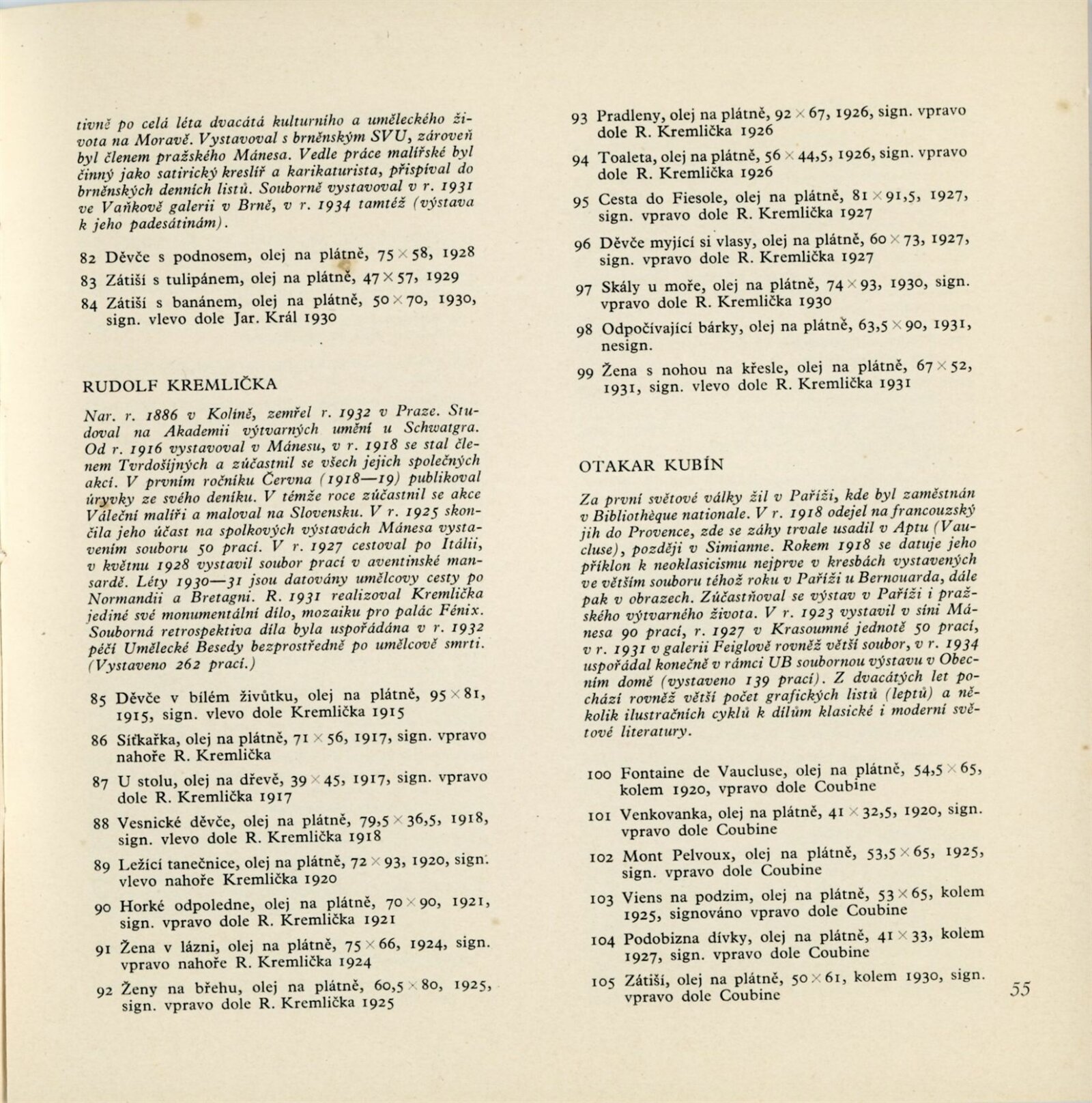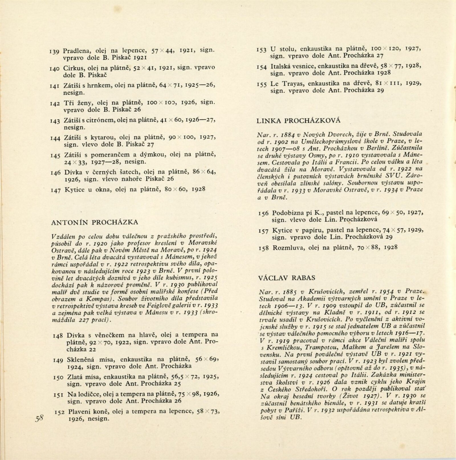 Moderní české malířství II. Léta dvacátá: Dům umění města Brna, 24. 5. – 12. 7. 1959 / Texty: Miroslav Lamač, Jiří Padrta. – Brno: DUmB, 1959. – 63 s., obr., DU 334 a DPK 40. – MZK; MG