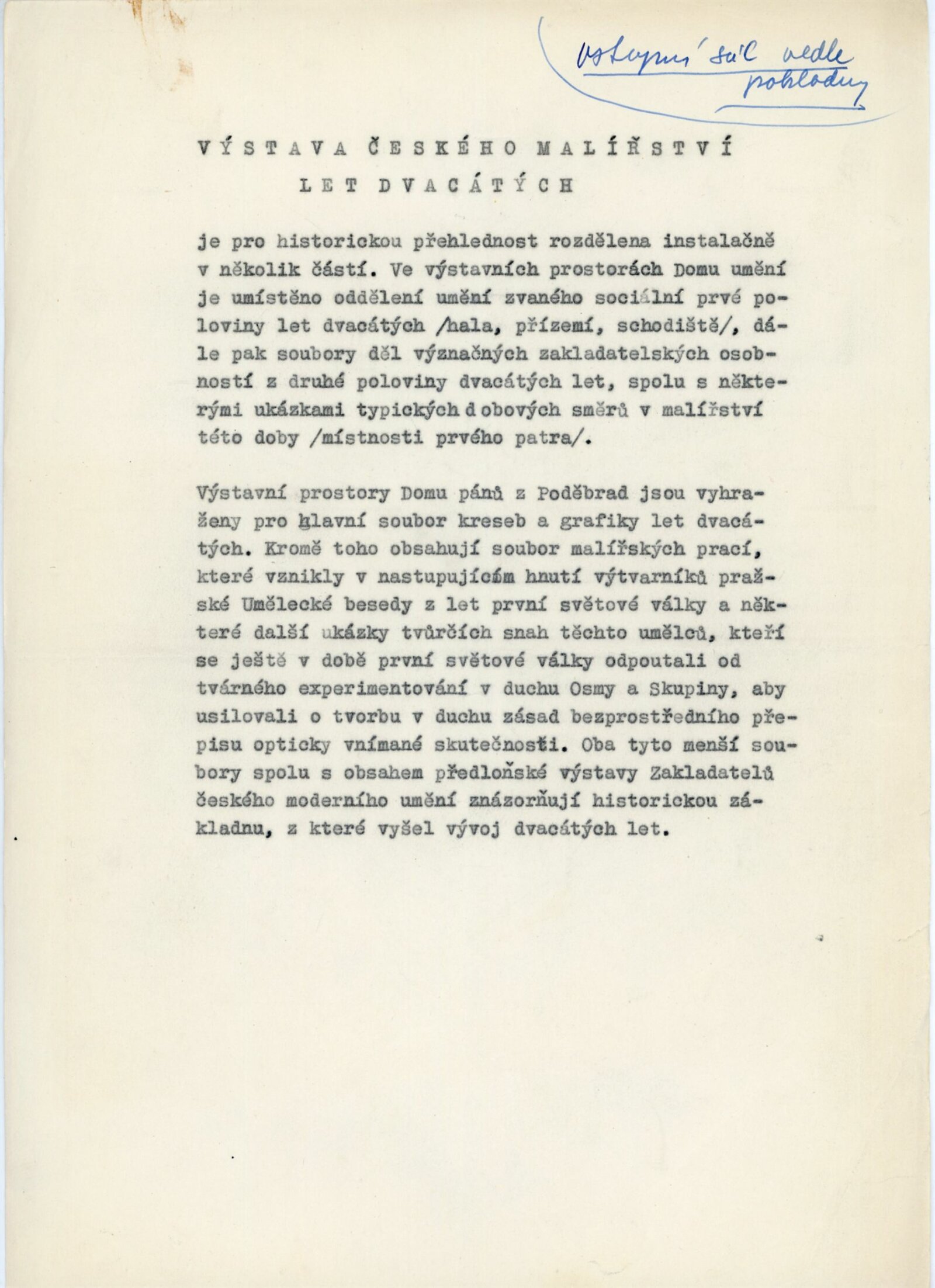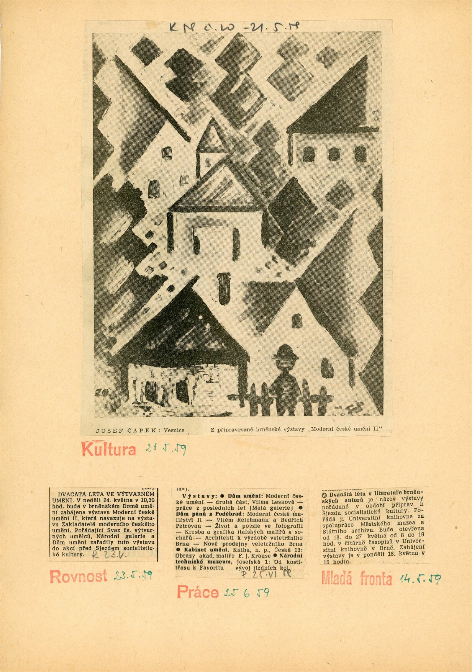 viz DU 334 (pozvánka, katalog, návrh koncepce výstavy, fotografie pro katalog, korespondence (o přípravě výstavy a zápůjčkách, dopis s koncepcí výstavy od Miroslava Lamače a Jiřího Padrty, rukopis Jiřího Padrty, dopis se souhlasem SČSVU s konáním výstavy, dopisy DU o realizaci výstavy, o poškozených dílech, o vracení exponátů z výstavy v rukopisech Antonína Pelce, Jana Zrzavého, Mary Durasové a Vojtěcha Sedláčka), seznam majitelů děl, reverzy soukromých majitelů (Zrzavý, Scheinpflugová, Duras, Nowak, Čapková a mn. dal.) a institucí, zápis komise ze dne 20. 5. 1959, žádosti o zapůjčení výstavy, prezenční list z tisk. konference, recenze v tisku, text R. Seluckého pro „Zrcadlo kultury“ (ČR)