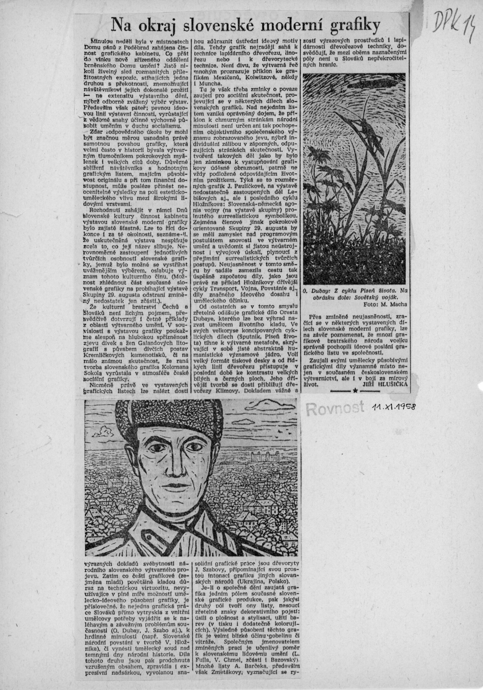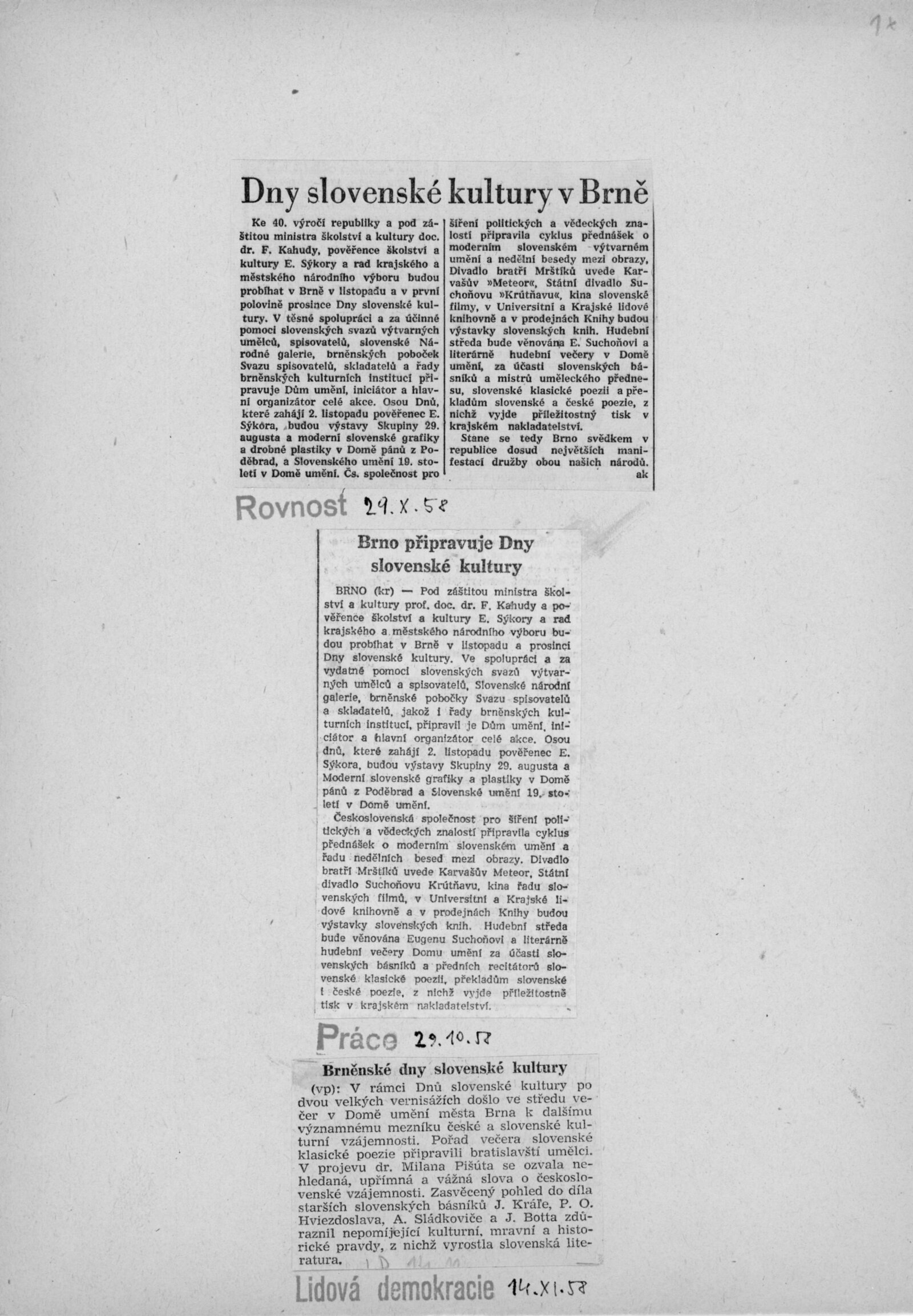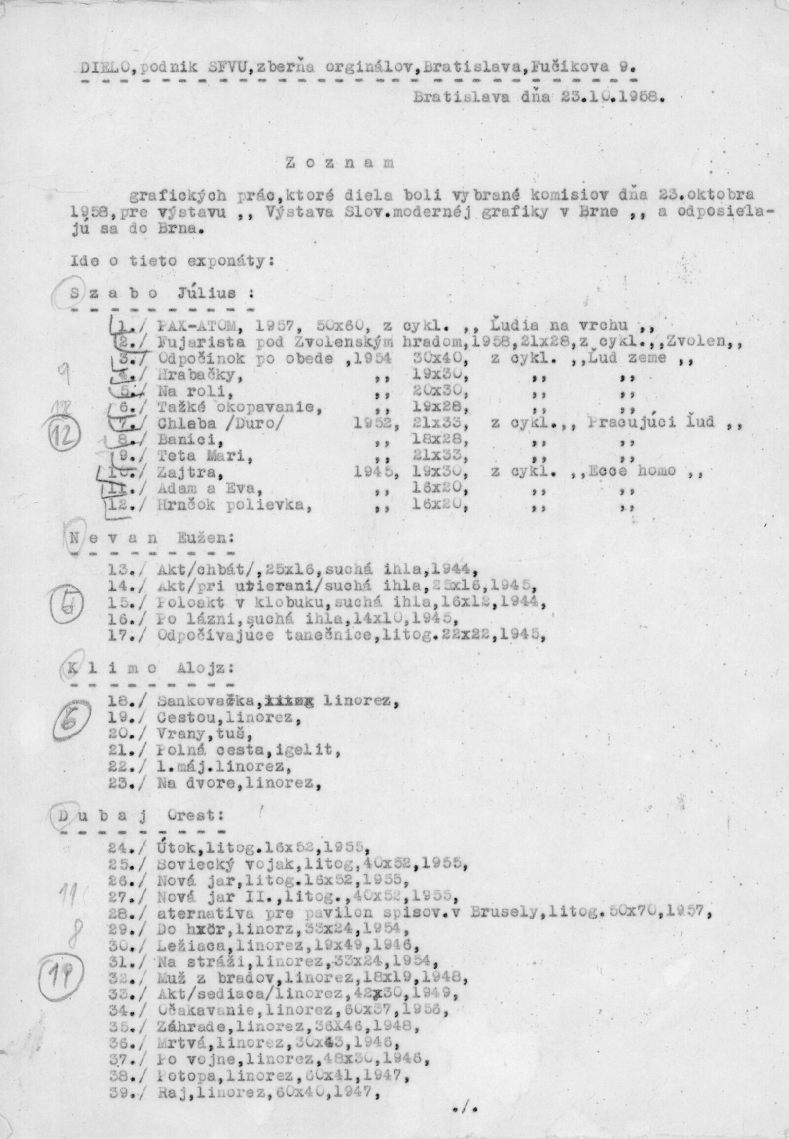 spol. pozvánka Dny slovenské kultury (DPK 13–14), strojopisy textů k výstavě, seznam děl, provozní korespondence, potvrzení o převzetí a předání děl, adresy majitelů, recenze v tisku