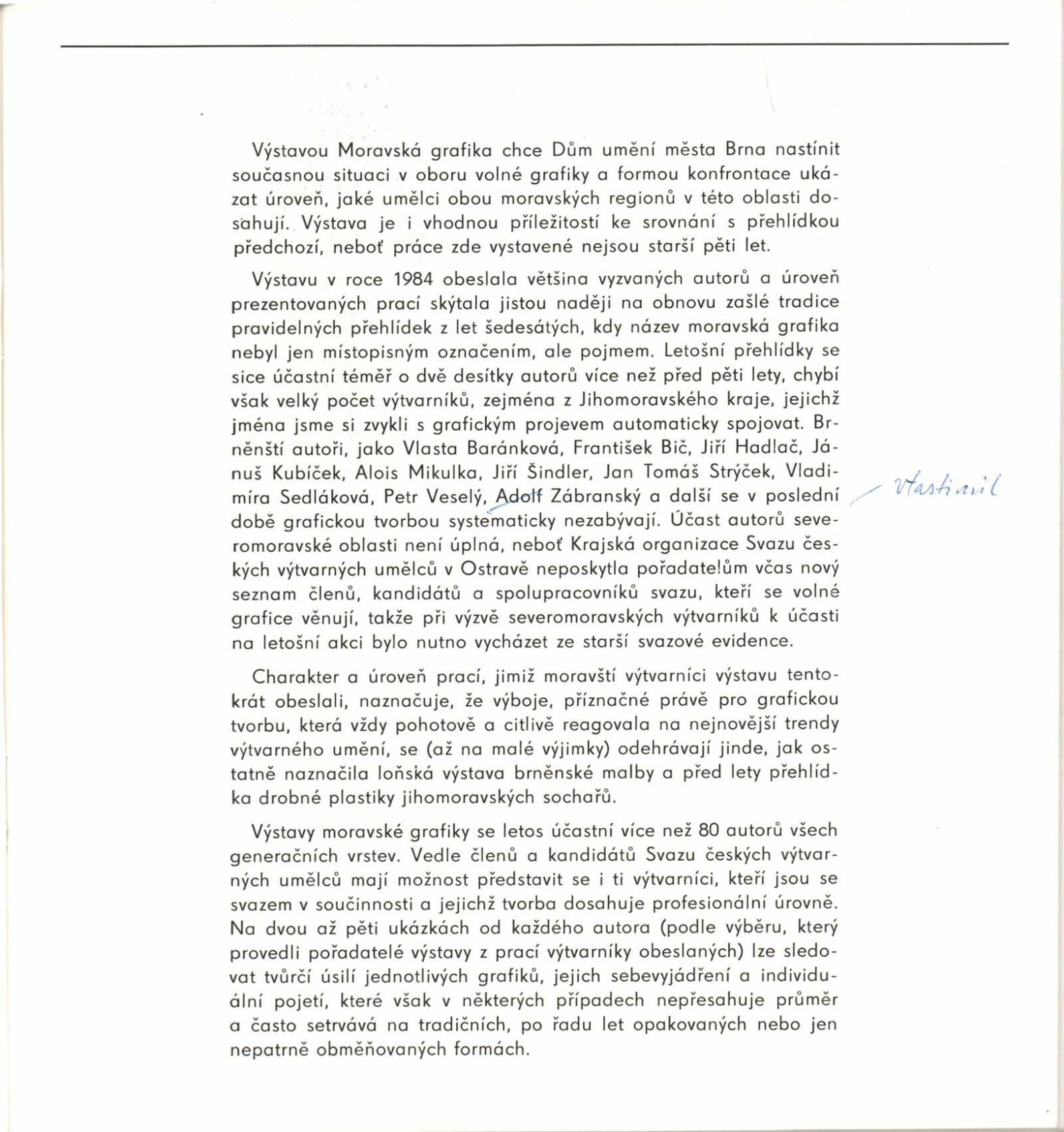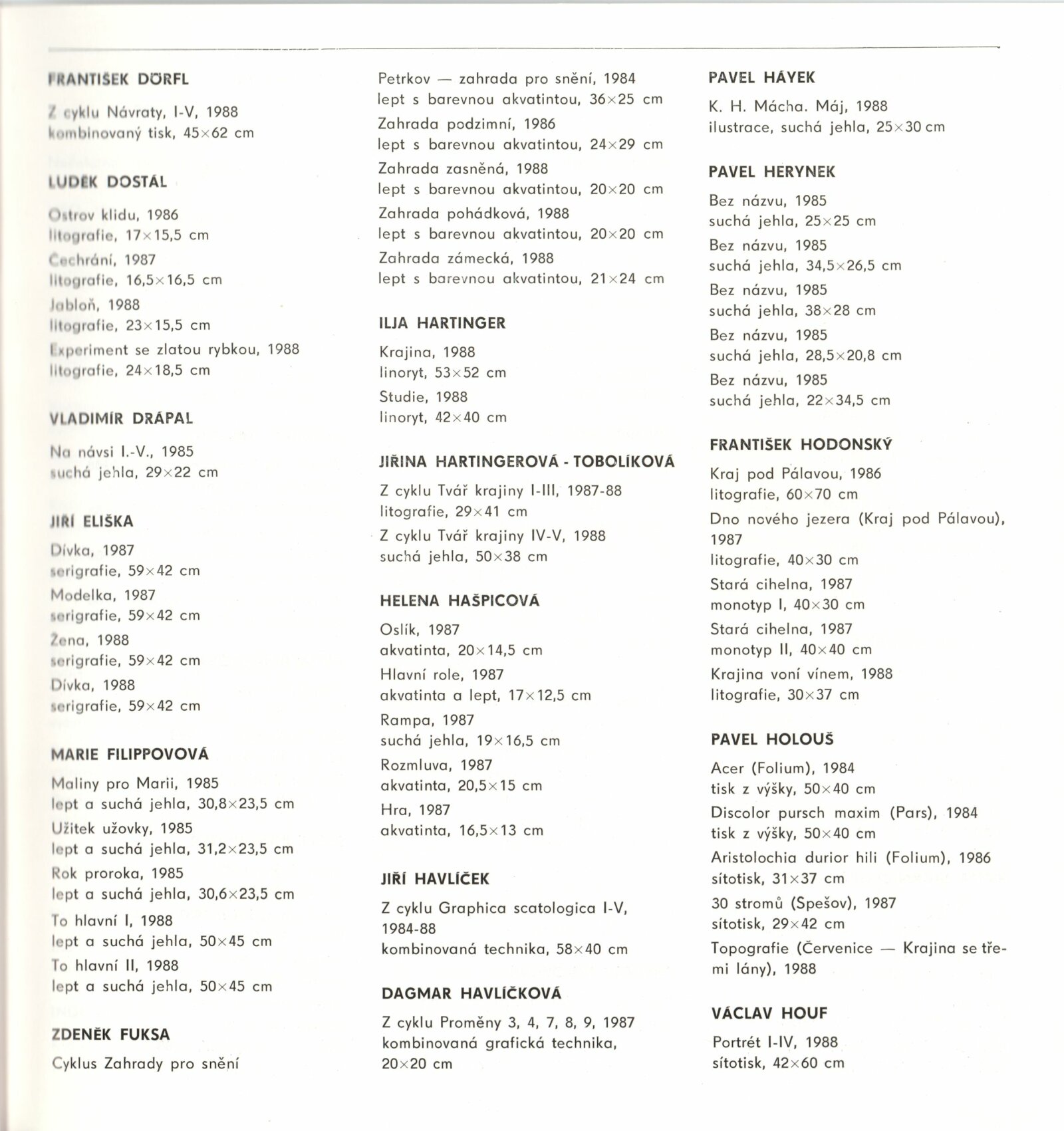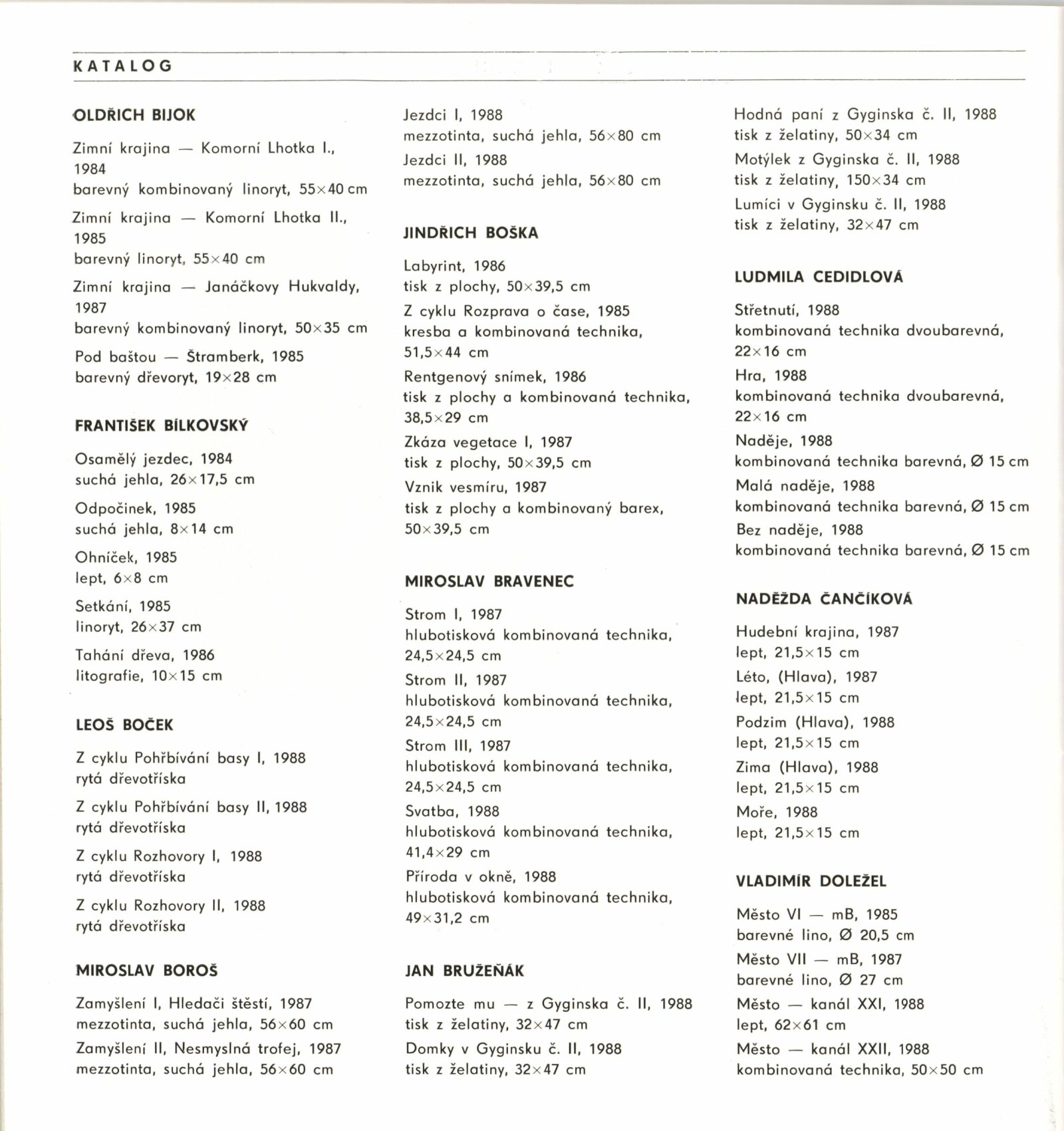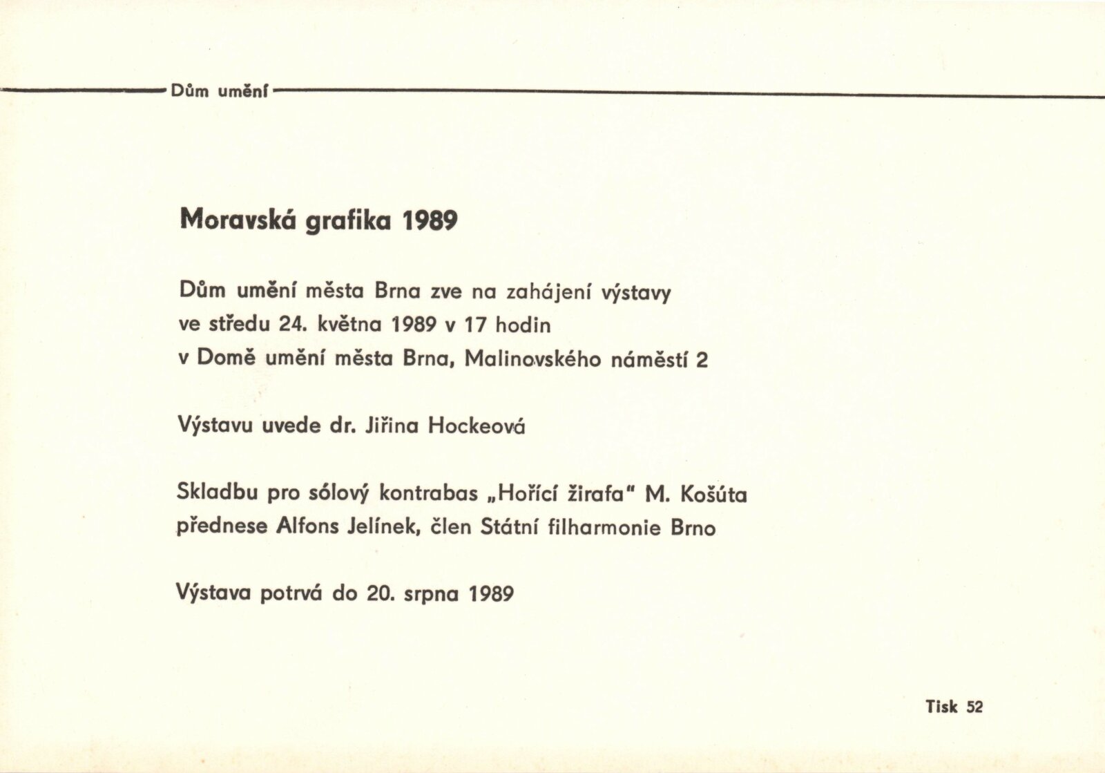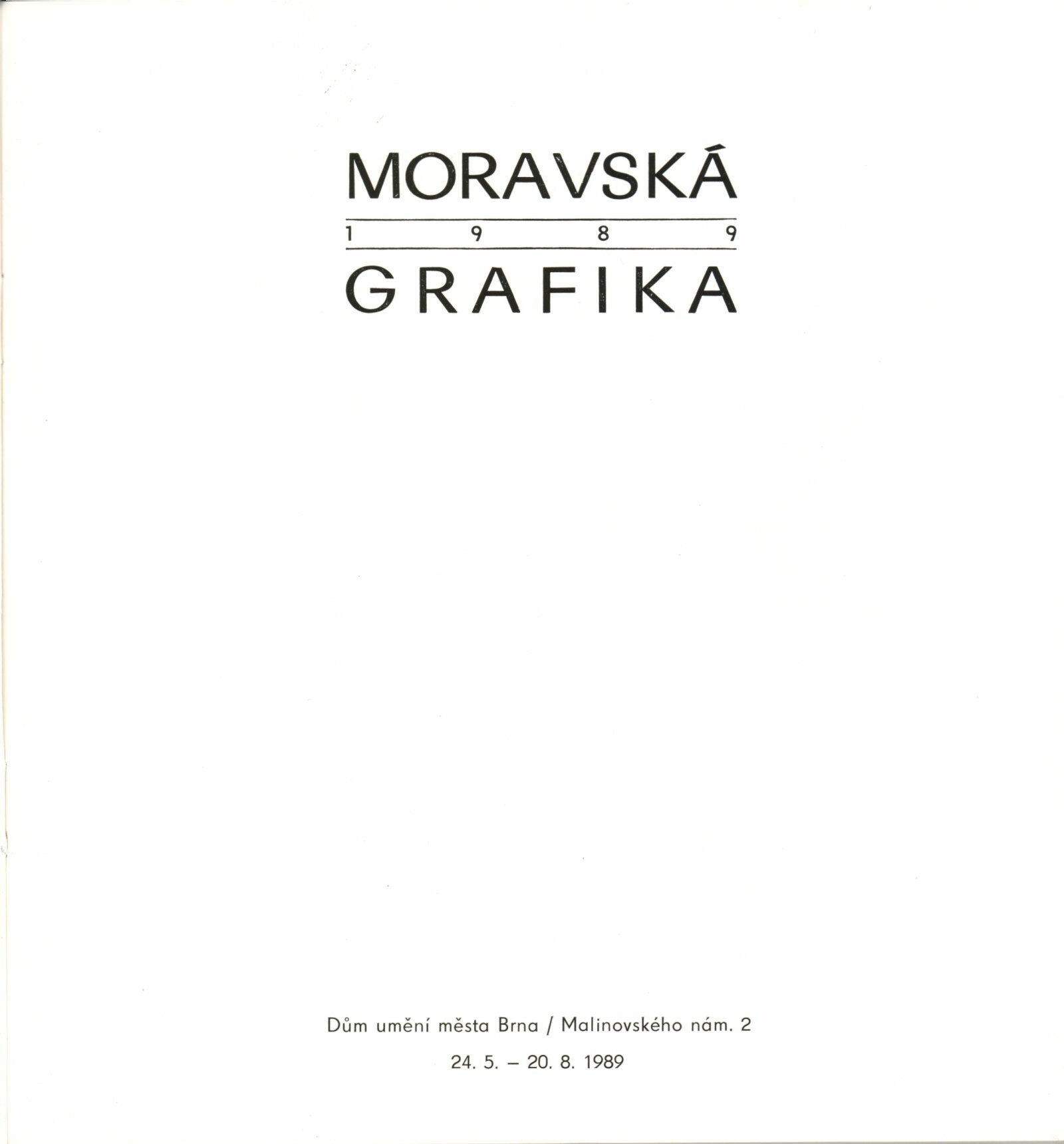 Moravská grafika 1989: Dům umění města Brna, 1. patro, 24. 5. – 20. 8. 1989 / Text: Jiřina Hockeová. – Brno: DUmB, 1989. – [56] s., obr., životní data, vystavujících, DU 869. – MZK; MG; MMB