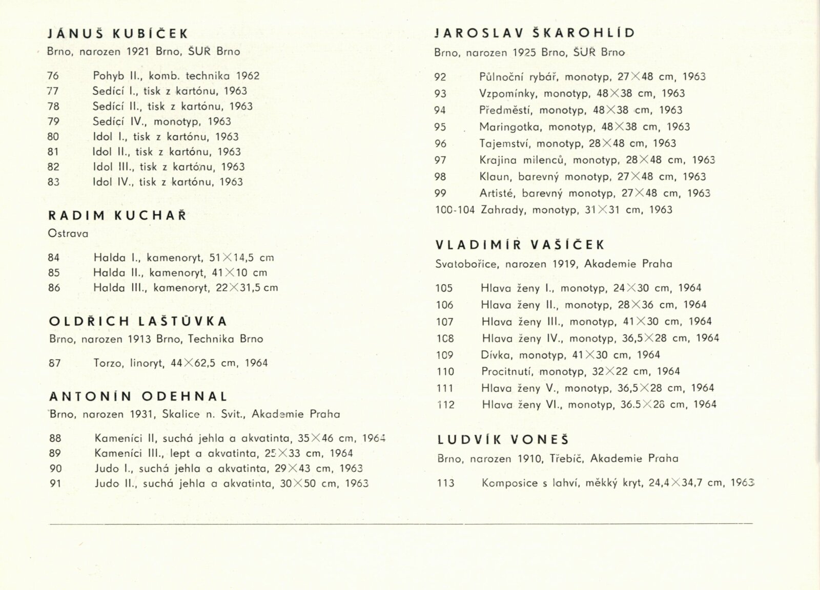 Moravská grafika. Čtvrtá výstava moravských grafiků: Dům umění města Brna / Dům pánů z Kunštátu, Kabinet grafiky, 8. 5. – 31. 5. 1964 / Text: Helena Kusáková. – Brno: SČSVU, 1964. – 20 s., obr., životní data vystavujících, DPK 228. – MZK; MG