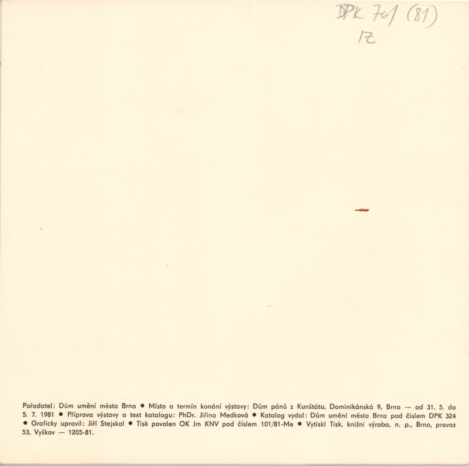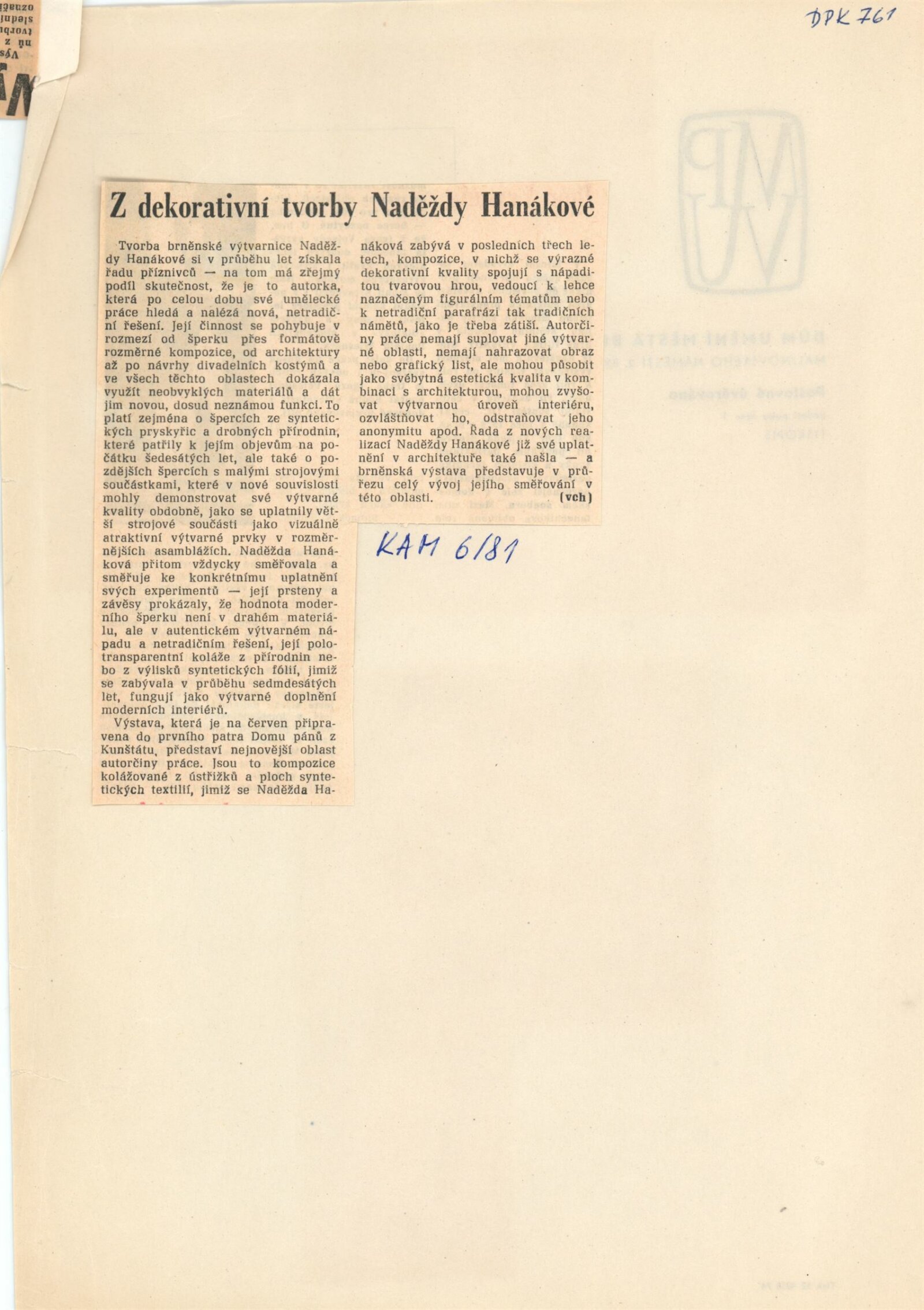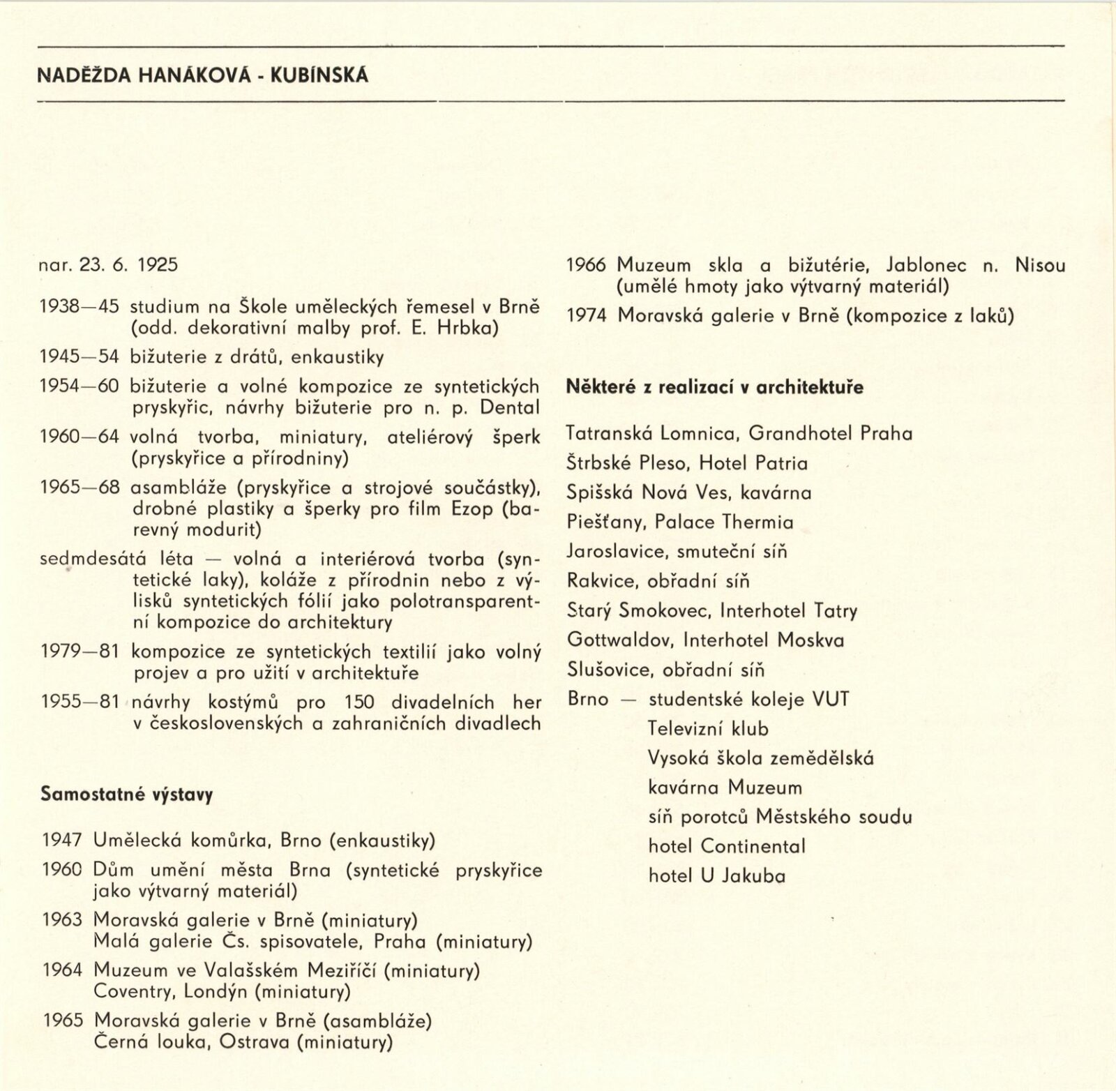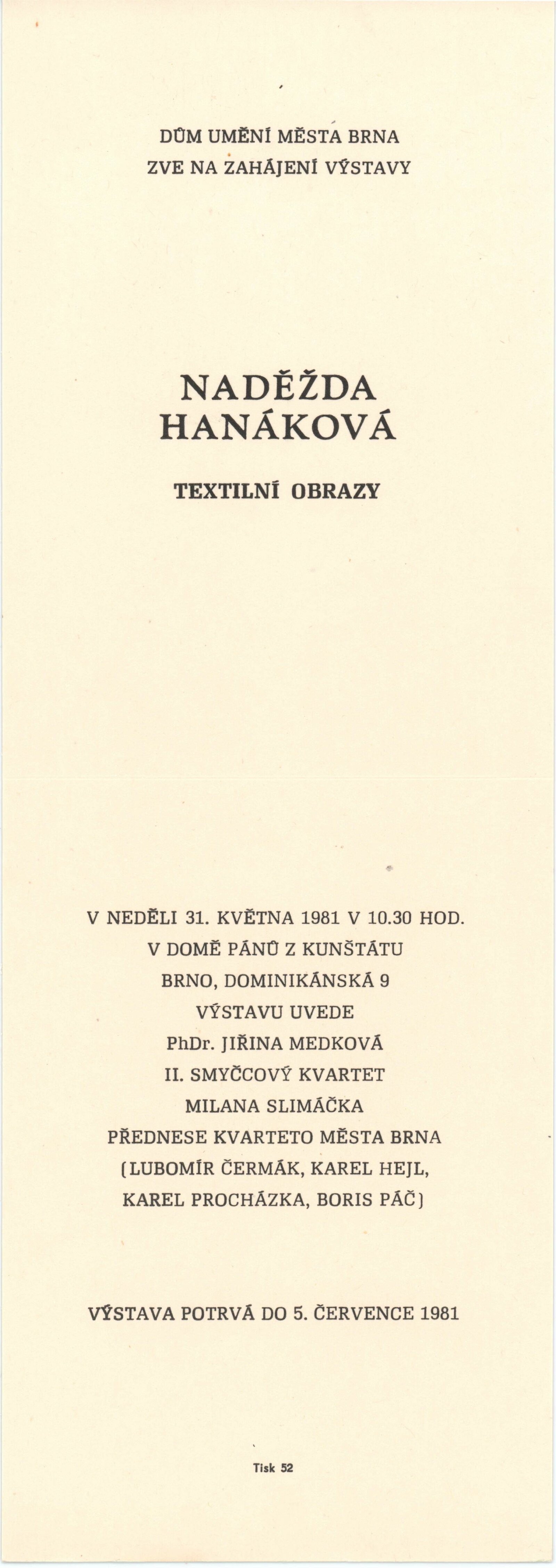Naděžda Hanáková. Textilní obrazy: Dům umění / Dům pánů z Kunštátu, 31. 5. – 5. 7. 1981 / Text: Jiřina Medková. – Brno: DUmB, 1981. – 16 s., obr., portrét, životní data, výstavy, realizace v architektuře, DPK 761. – MZK; MG