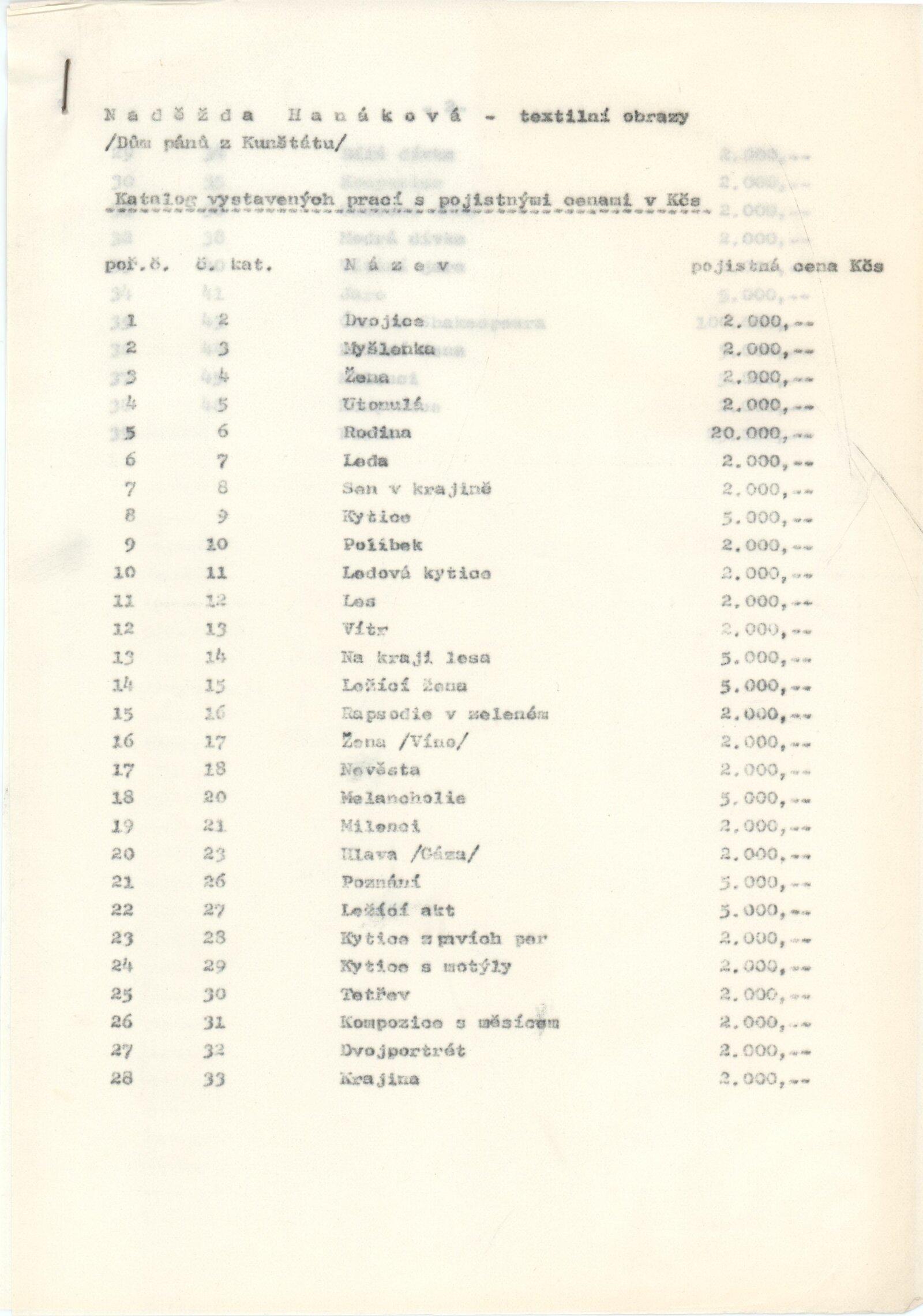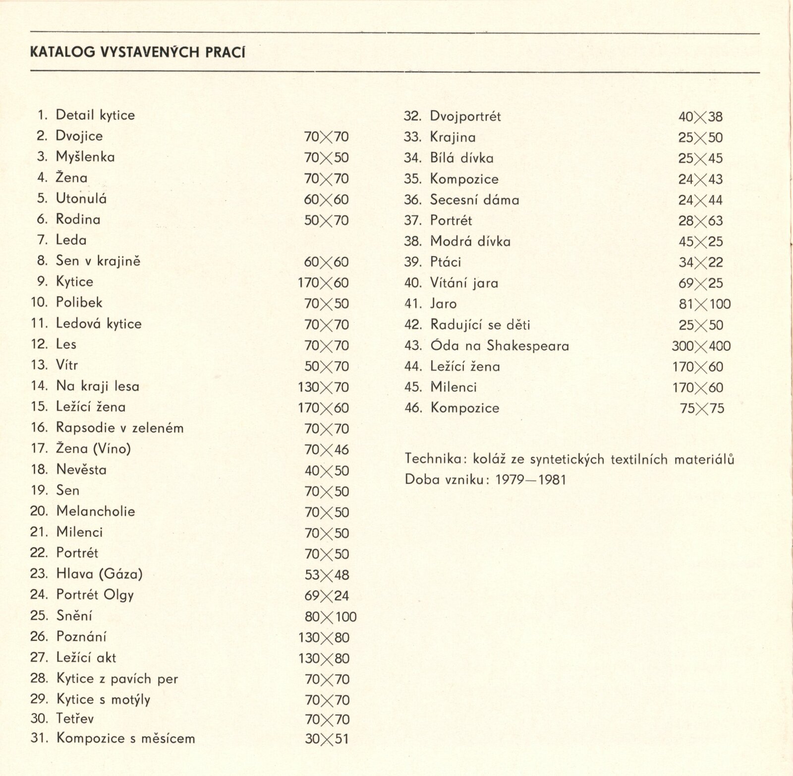 pozvánka, katalog, strojopis, seznamy děl, fotografie vernisáže, fotografie děl a autorky, provozní korespondence (žádost o schválení tisku katalogu), recenze v tisku