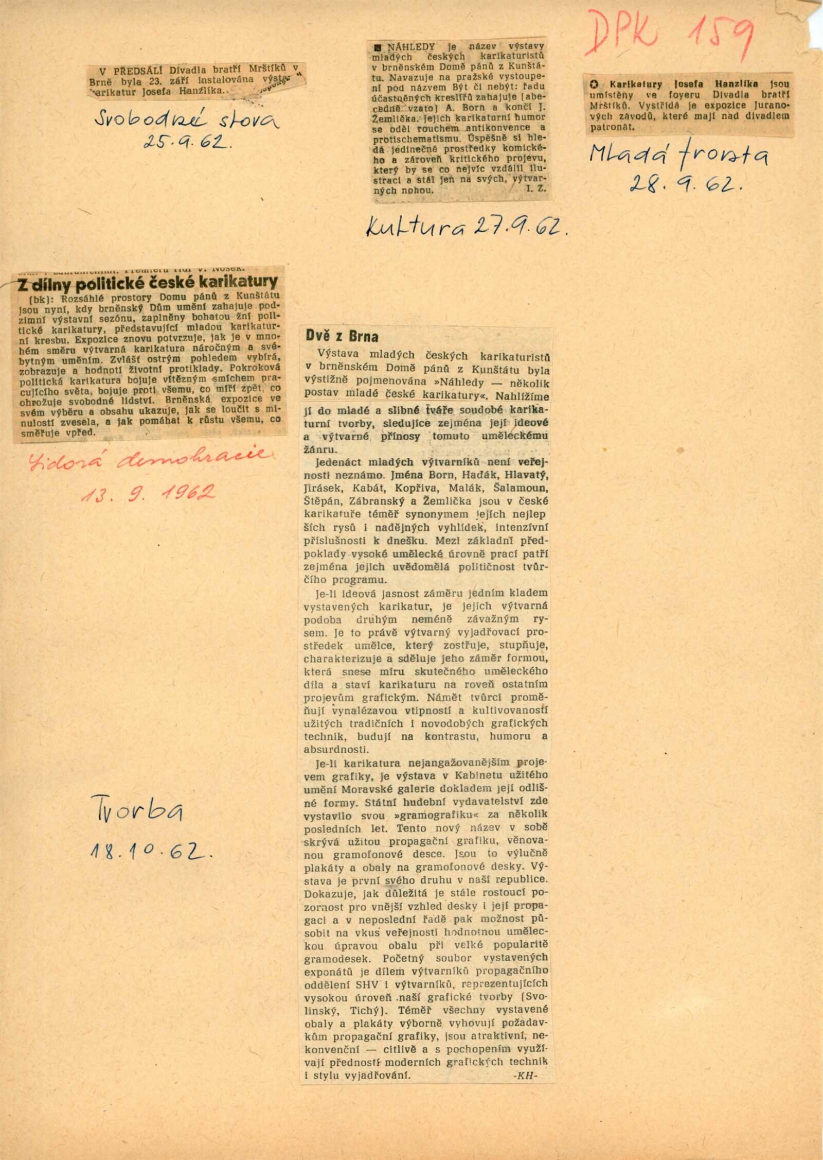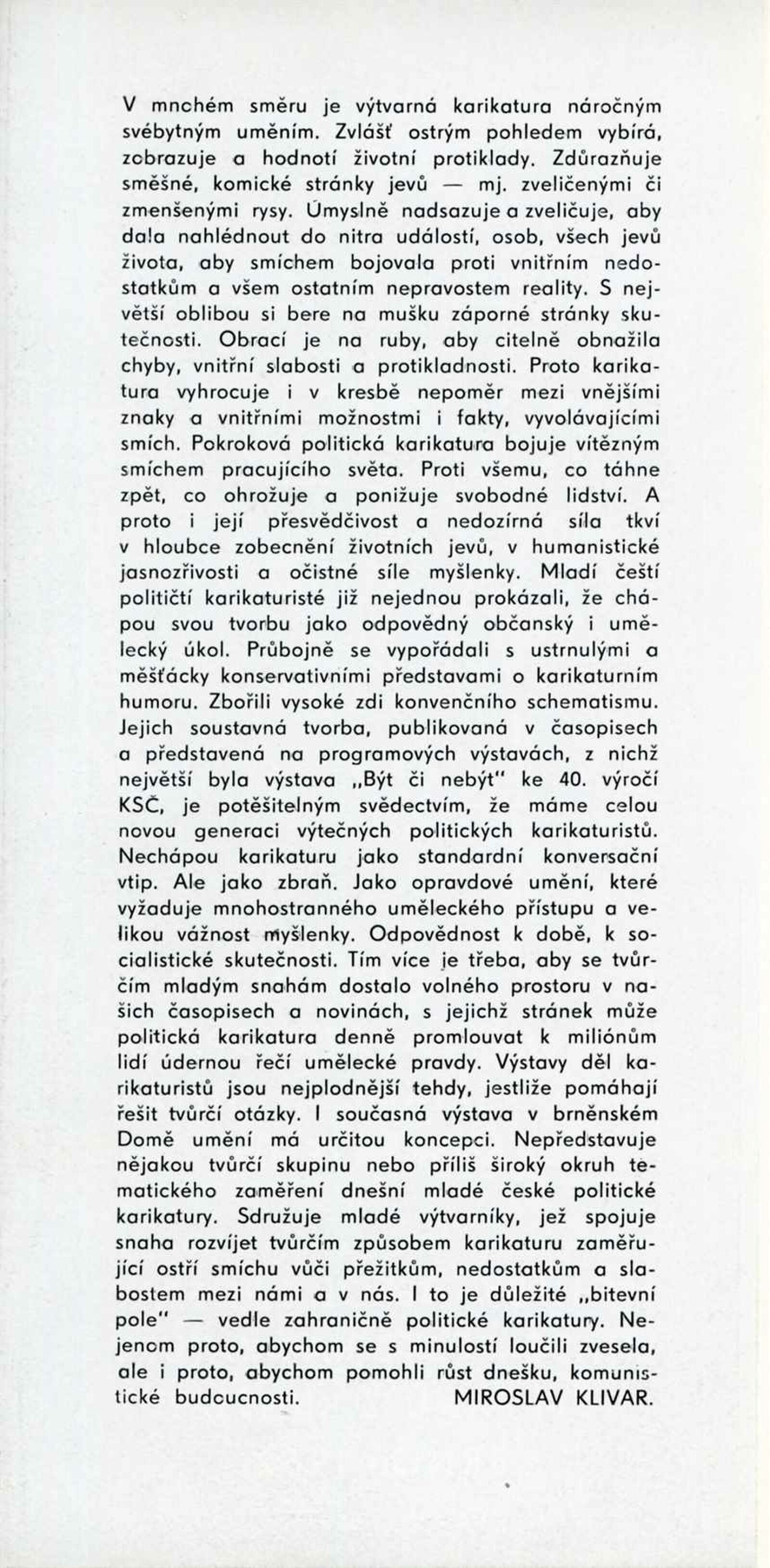 Náhledy. Několik postav mladé české karikatury: Dům umění města Brna / Dům pánů z Kunštátu, 35. výstava Kabinetu grafiky, 7. 9. – 30. 9. 1962 / Text: Miroslav Klivar. – Brno: DUmB, 1962. – skládačka, 6 s., obr., DPK 159; MG