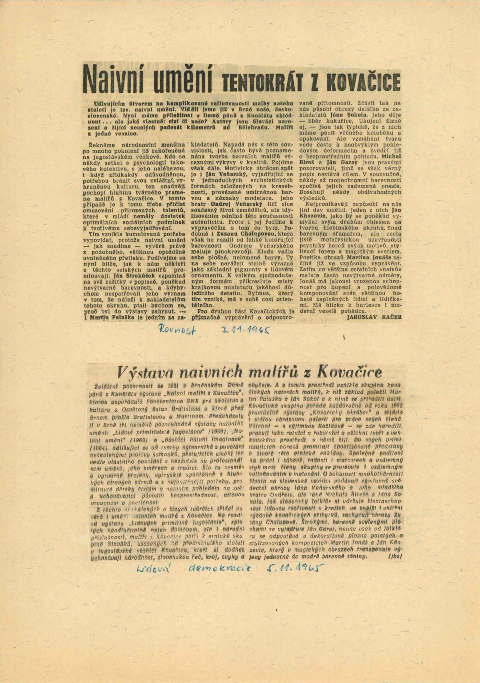 Naivní malířství z Kovačice: Dům umění města Brna / Dům pánů z Kunštátu, 10. 10. – 7. 11. 1965 / Společný katalog. Maliari z Kovačice. Z tvorby Slovákov žijúcich v Juhoslavii: Dom ČSP, Bratislava, červen–červenec 1965 / Text: Štefan Tkáč. – Bratislava: Dielo pre Osvetový ústav, 1965. – 40 s., obr., DPK 280. – MZK