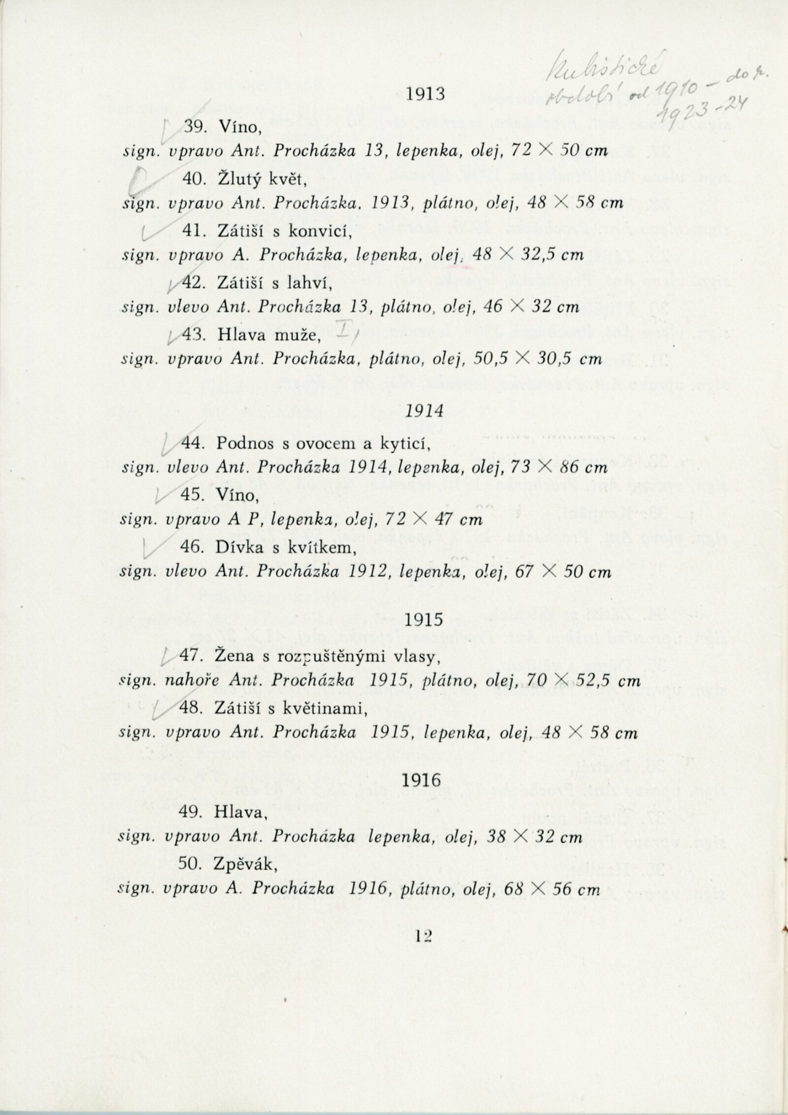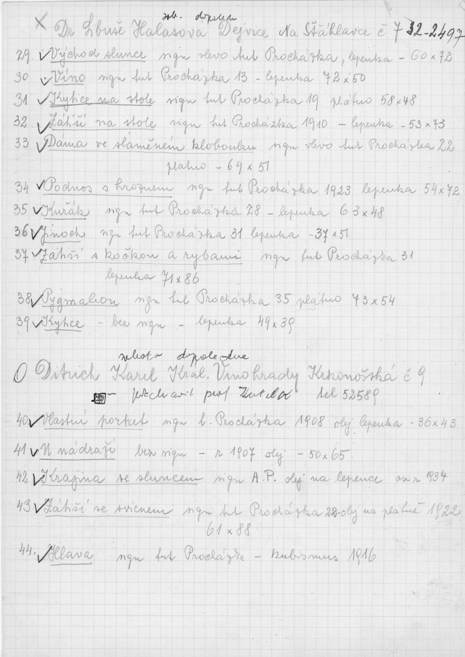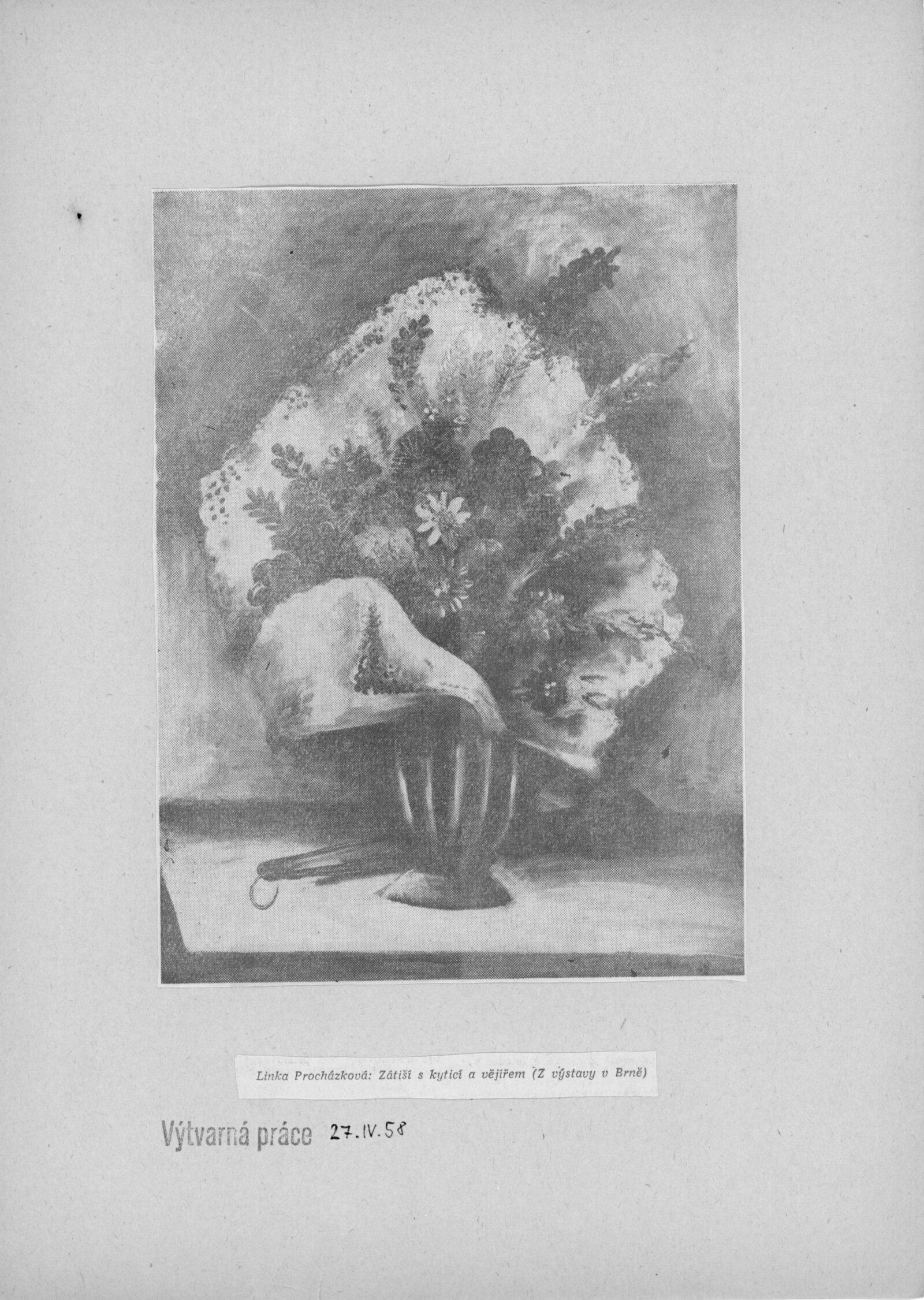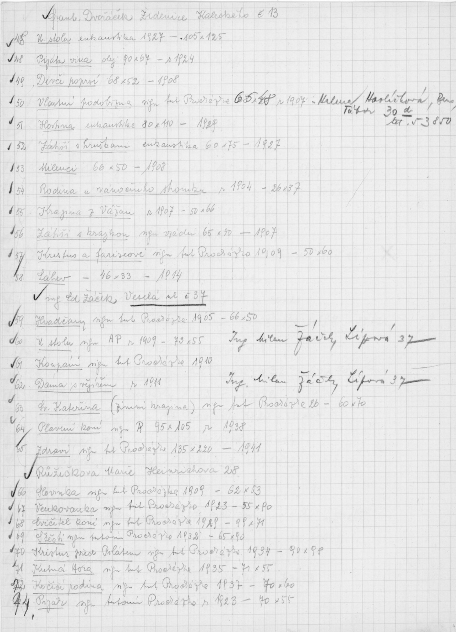 pozvánka DU, katalog, zvací letáky, seznamy obrazů, adresy majitelů, korespondence (o zapůjčení v DU, o repríze v Praze s majiteli a SČVU, provozní korespondence, dopis J. V. Plevy, J. Glivického, telegramy), potvrzení o převzetí a vracení děl, reverzy, objednávka opravy obrazů u restaurátorky, objednávky katalogů a plakátů, recenze v tisku, pozvánka na výstavu (Praha, Slovanský ostrov)