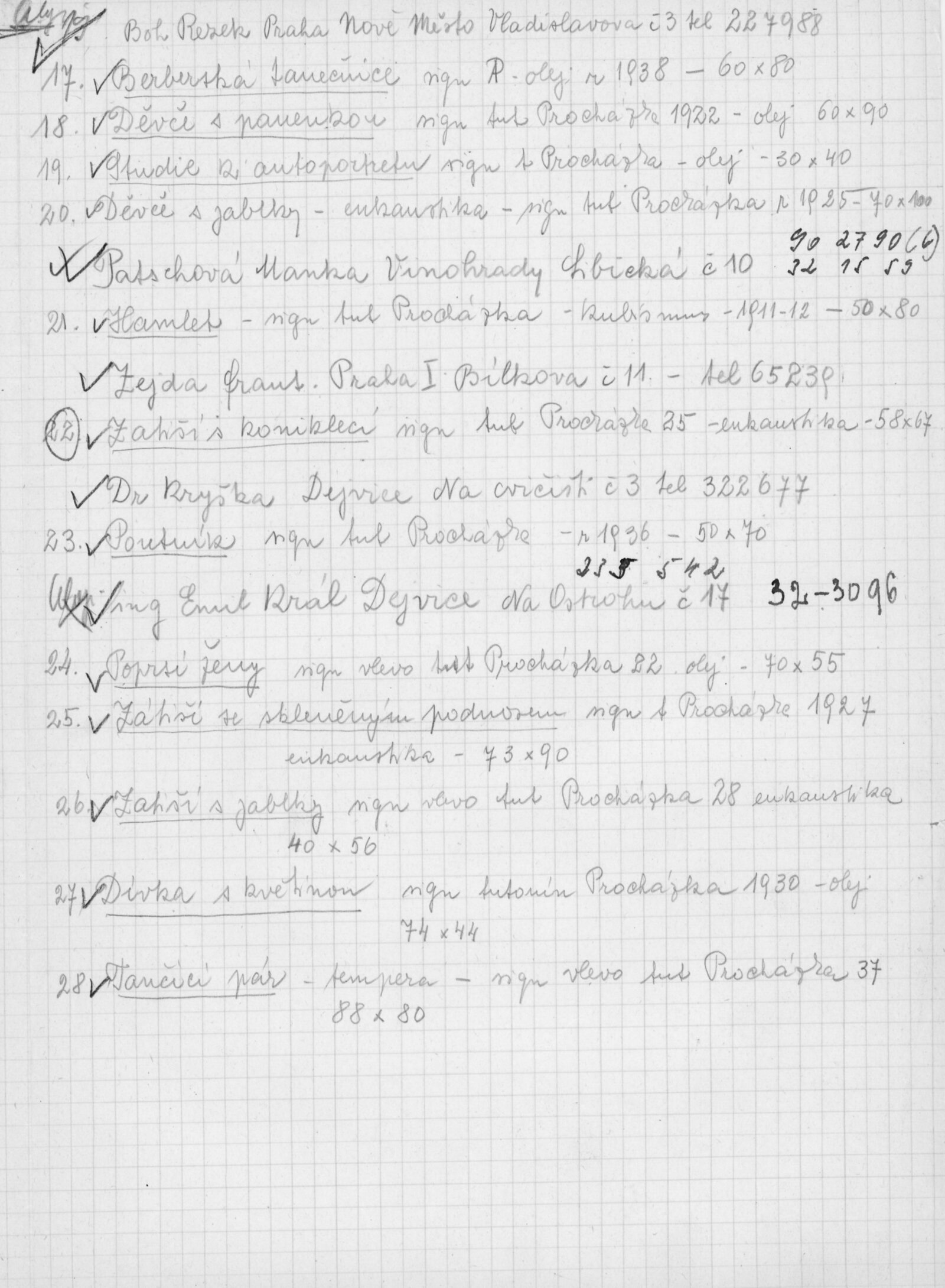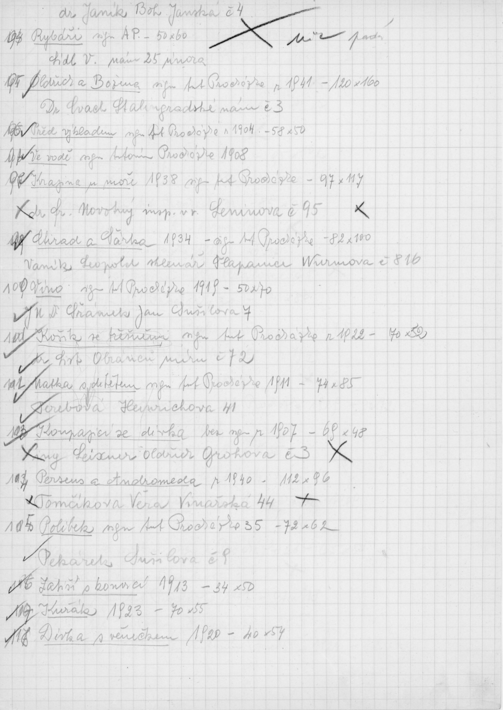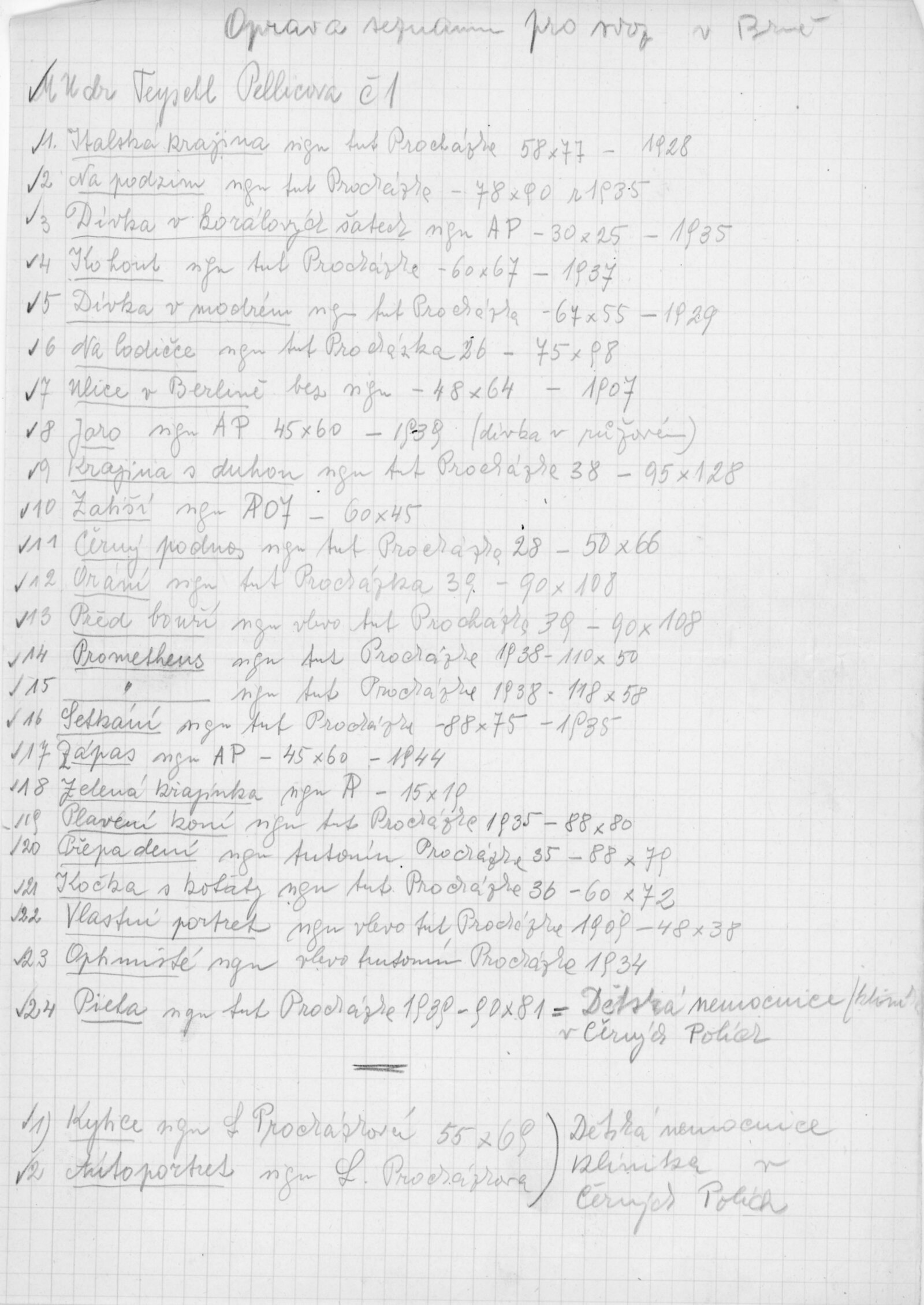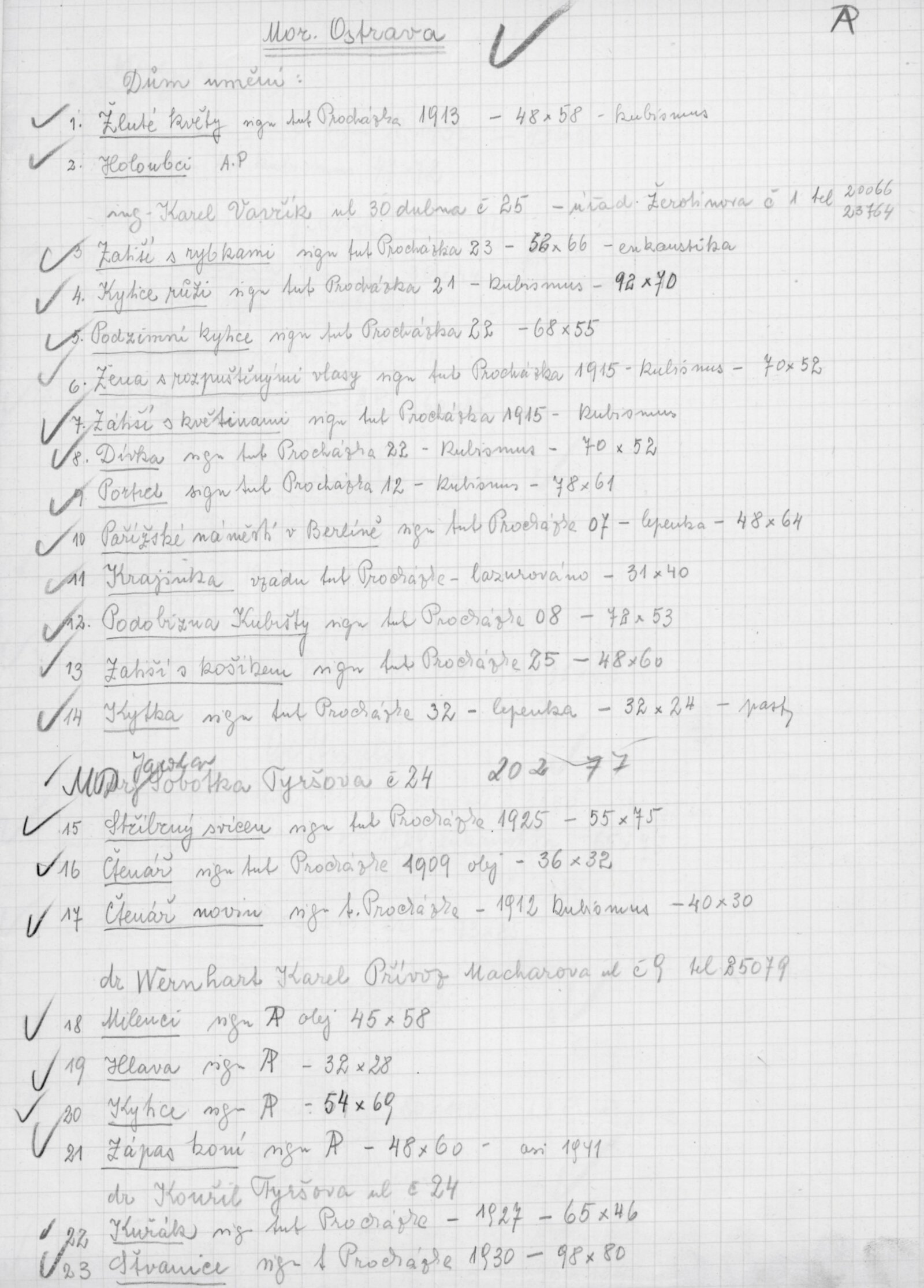 pozvánka DU, katalog, zvací letáky, seznamy obrazů, adresy majitelů, korespondence (o zapůjčení v DU, o repríze v Praze s majiteli a SČVU, provozní korespondence, dopis J. V. Plevy, J. Glivického, telegramy), potvrzení o převzetí a vracení děl, reverzy, objednávka opravy obrazů u restaurátorky, objednávky katalogů a plakátů, recenze v tisku, pozvánka na výstavu (Praha, Slovanský ostrov)