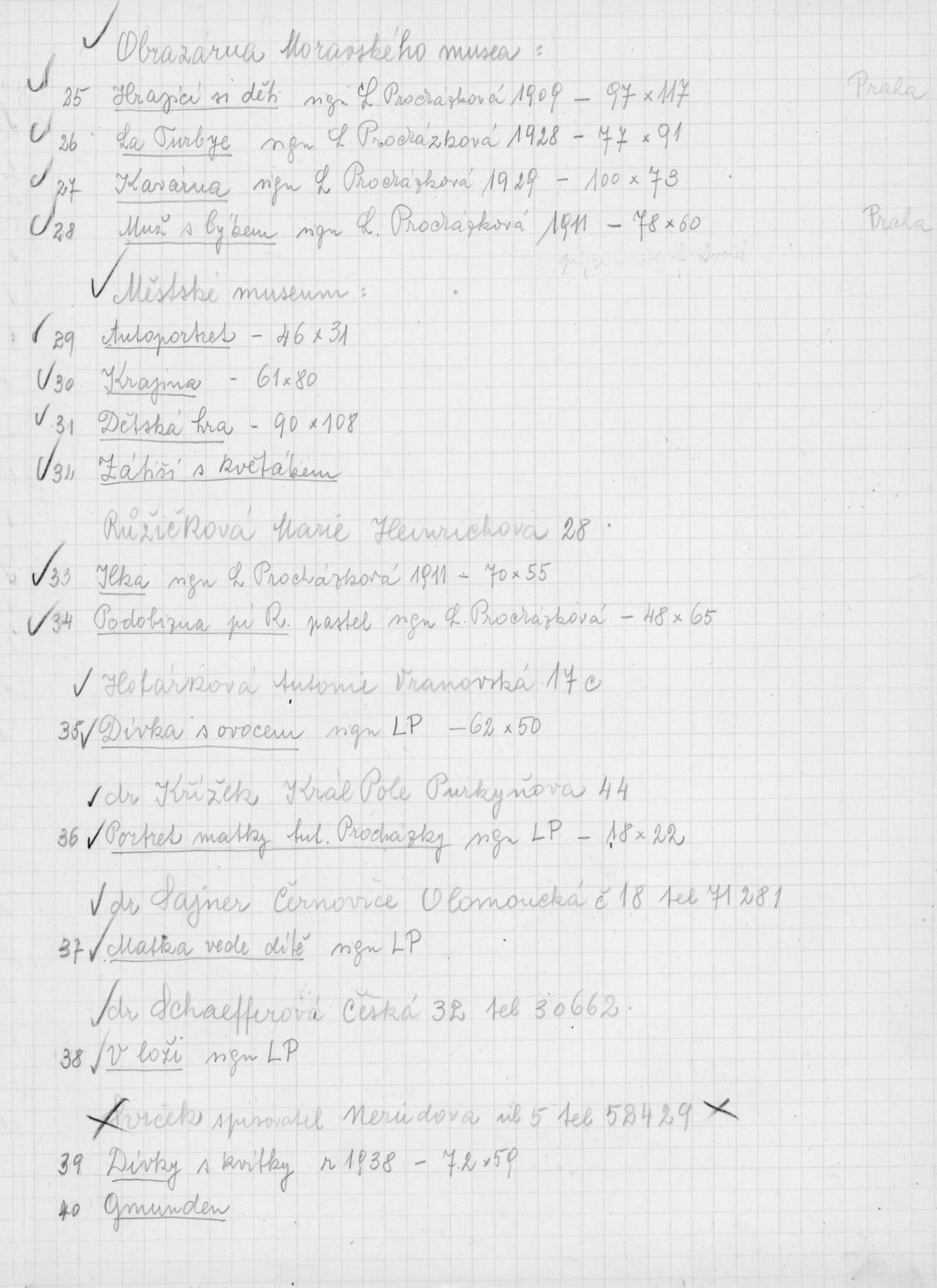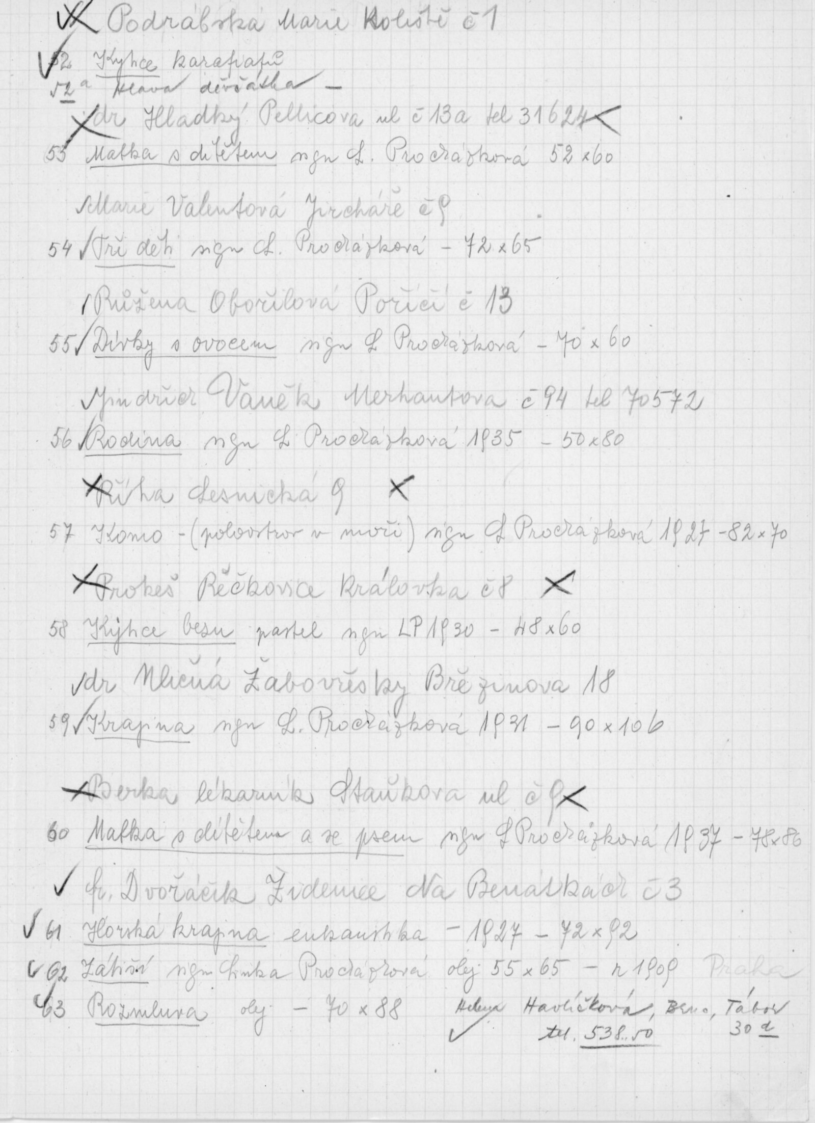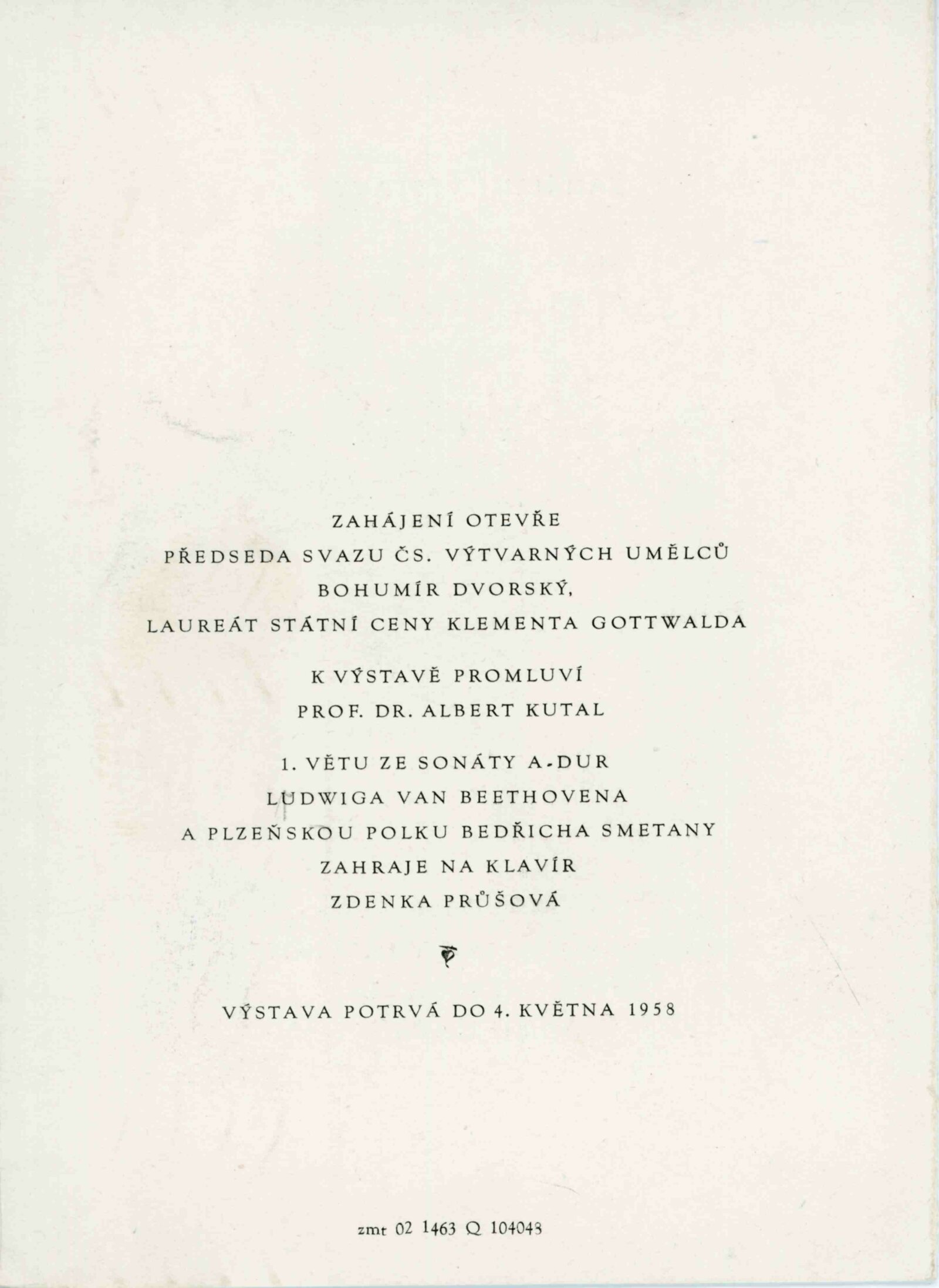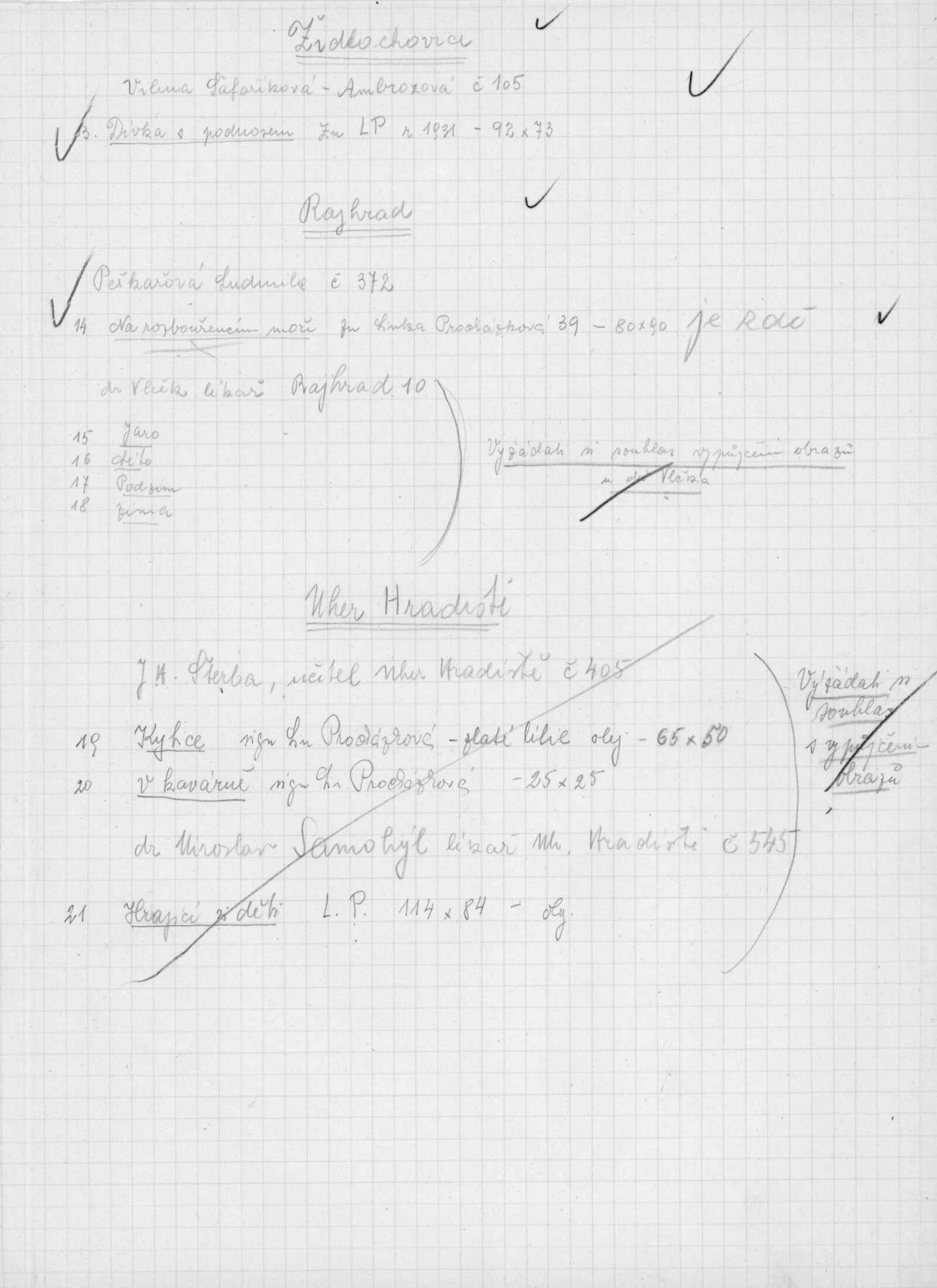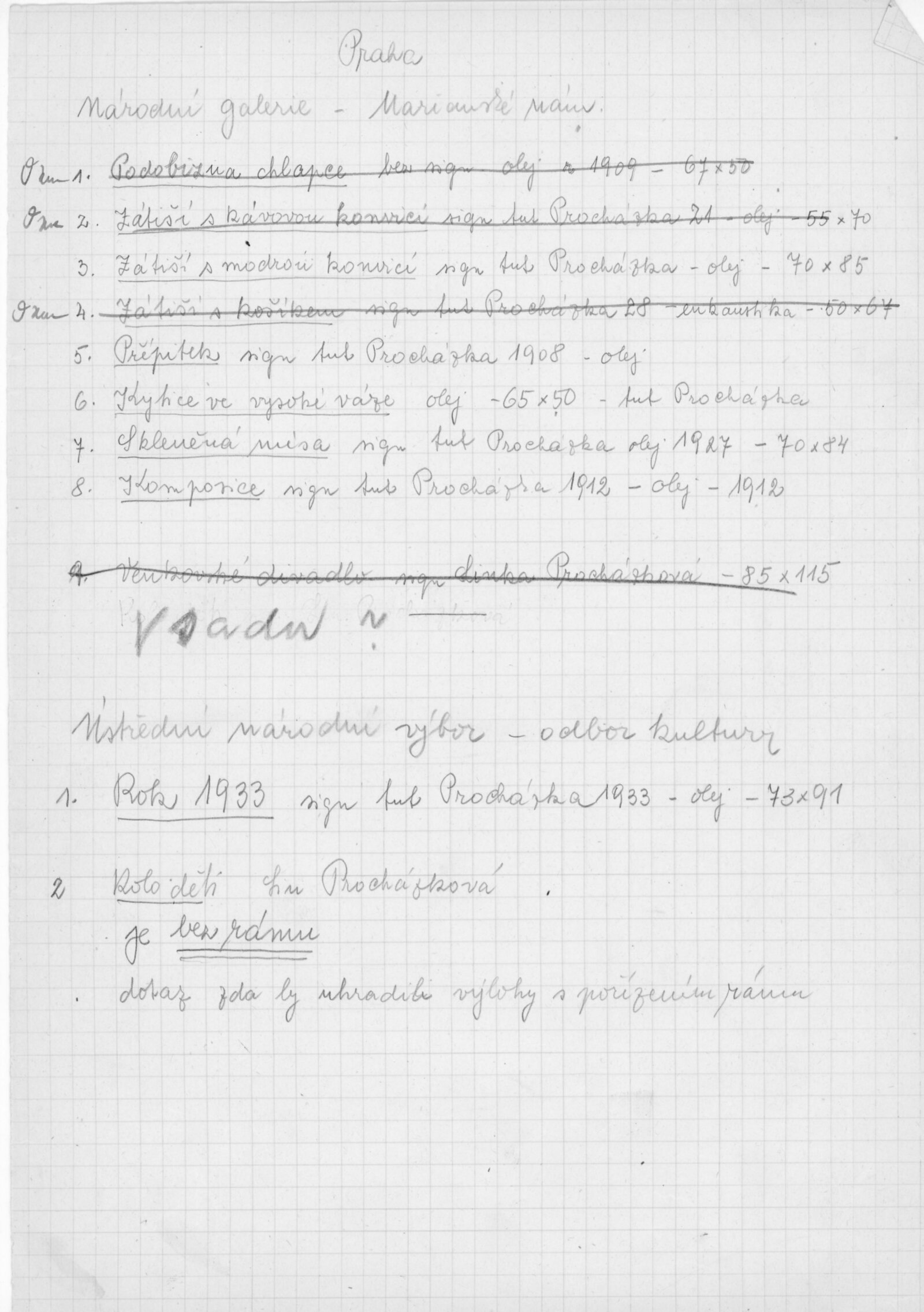 pozvánka DU, katalog, zvací letáky, seznamy obrazů, adresy majitelů, korespondence (o zapůjčení v DU, o repríze v Praze s majiteli a SČVU, provozní korespondence, dopis J. V. Plevy, J. Glivického, telegramy), potvrzení o převzetí a vracení děl, reverzy, objednávka opravy obrazů u restaurátorky, objednávky katalogů a plakátů, recenze v tisku, pozvánka na výstavu (Praha, Slovanský ostrov)