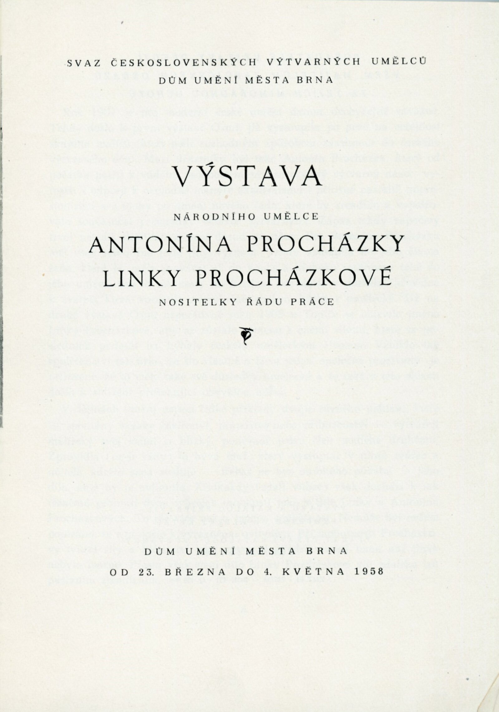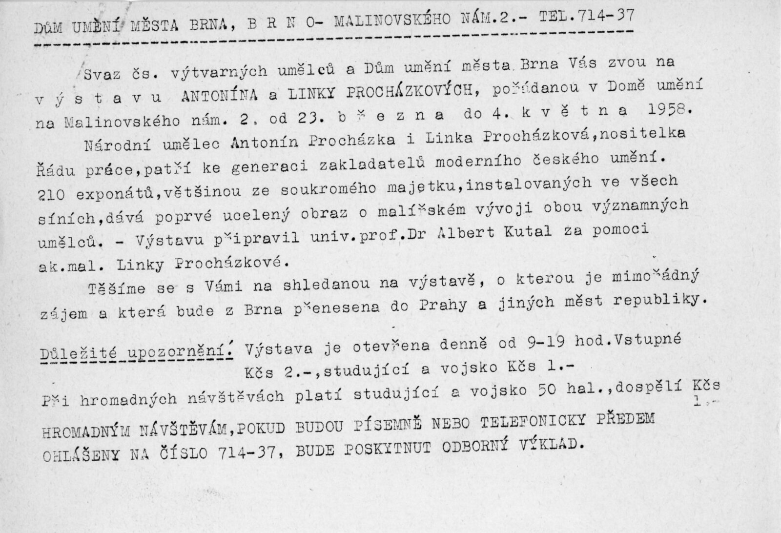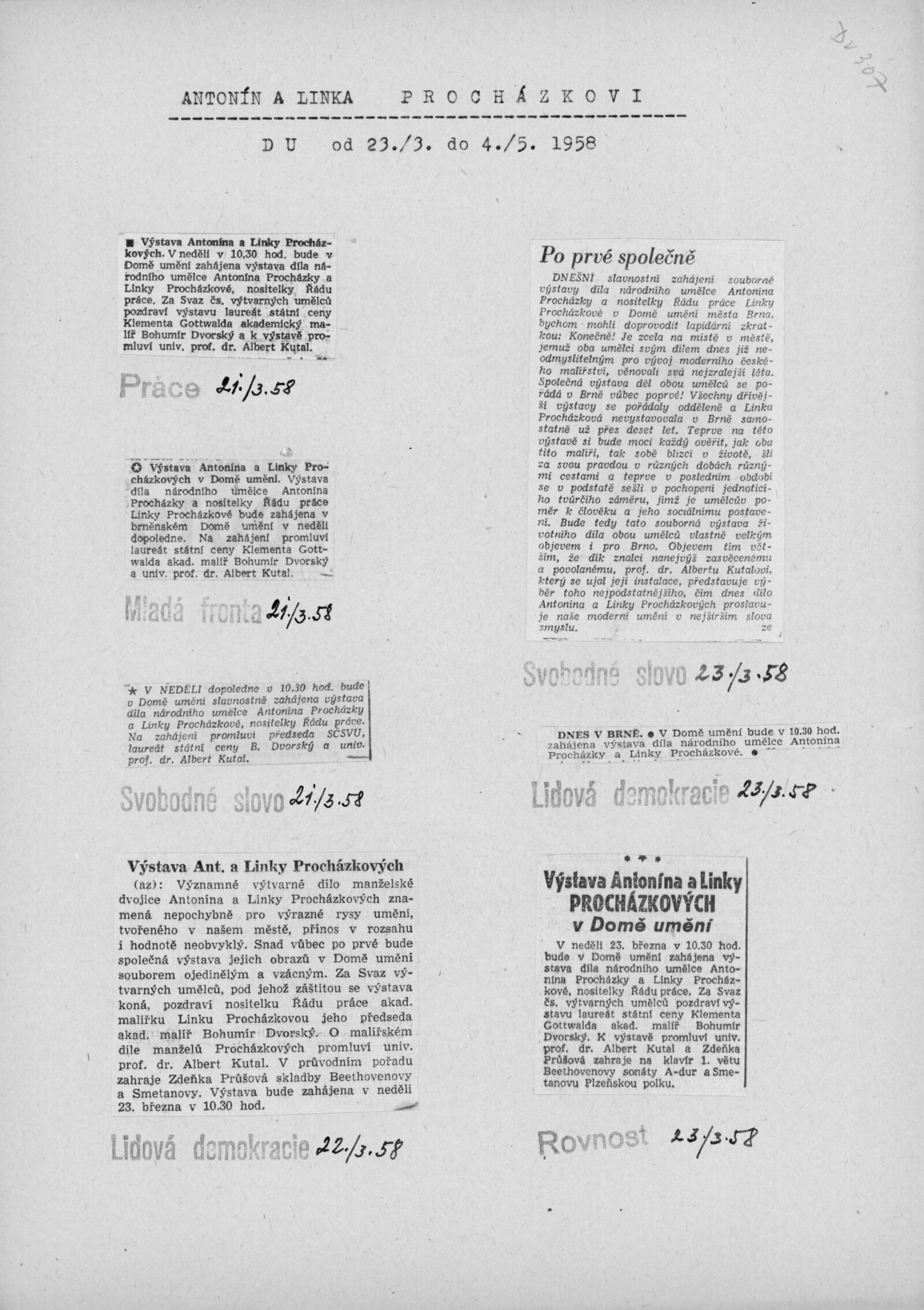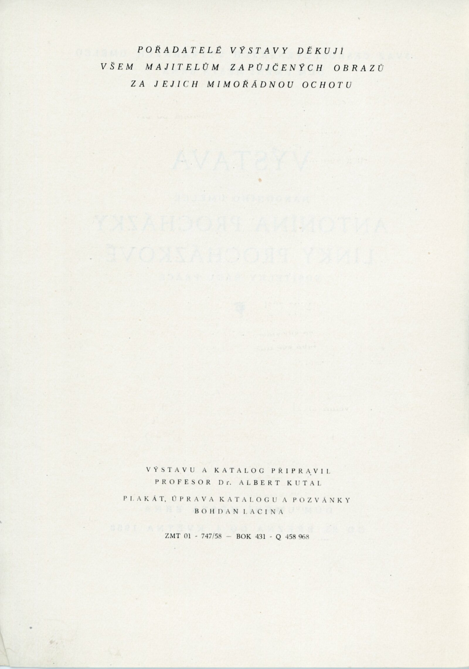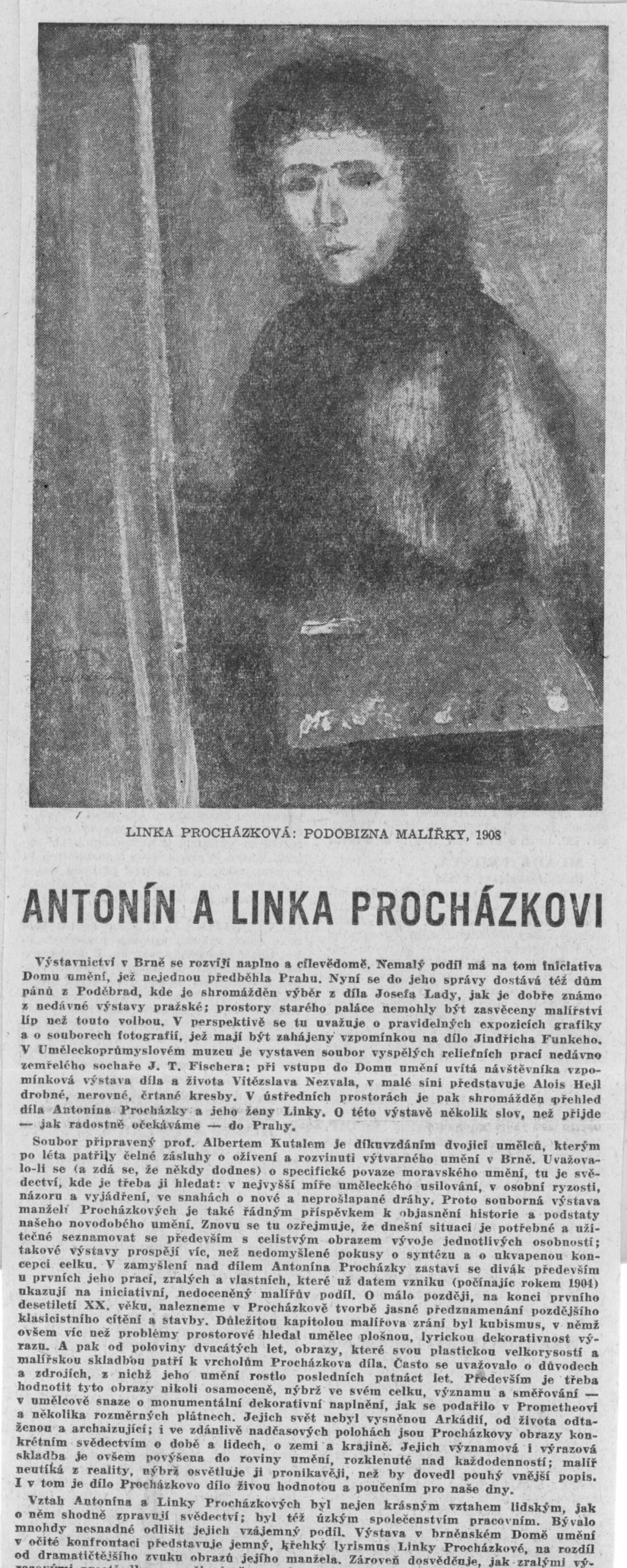 Výstava národního umělce Antonína Procházky, Linky Procházkové, nositelky Řádu práce: Dům umění města Brna, 23. 3. – 4. 5. 1958 / Text: Albert Kutal. – Brno: DUmB, 1958. – 25 s., 10 s. obr. příl., DU 307. – Kubíček 7932; MZK; MG; MMB