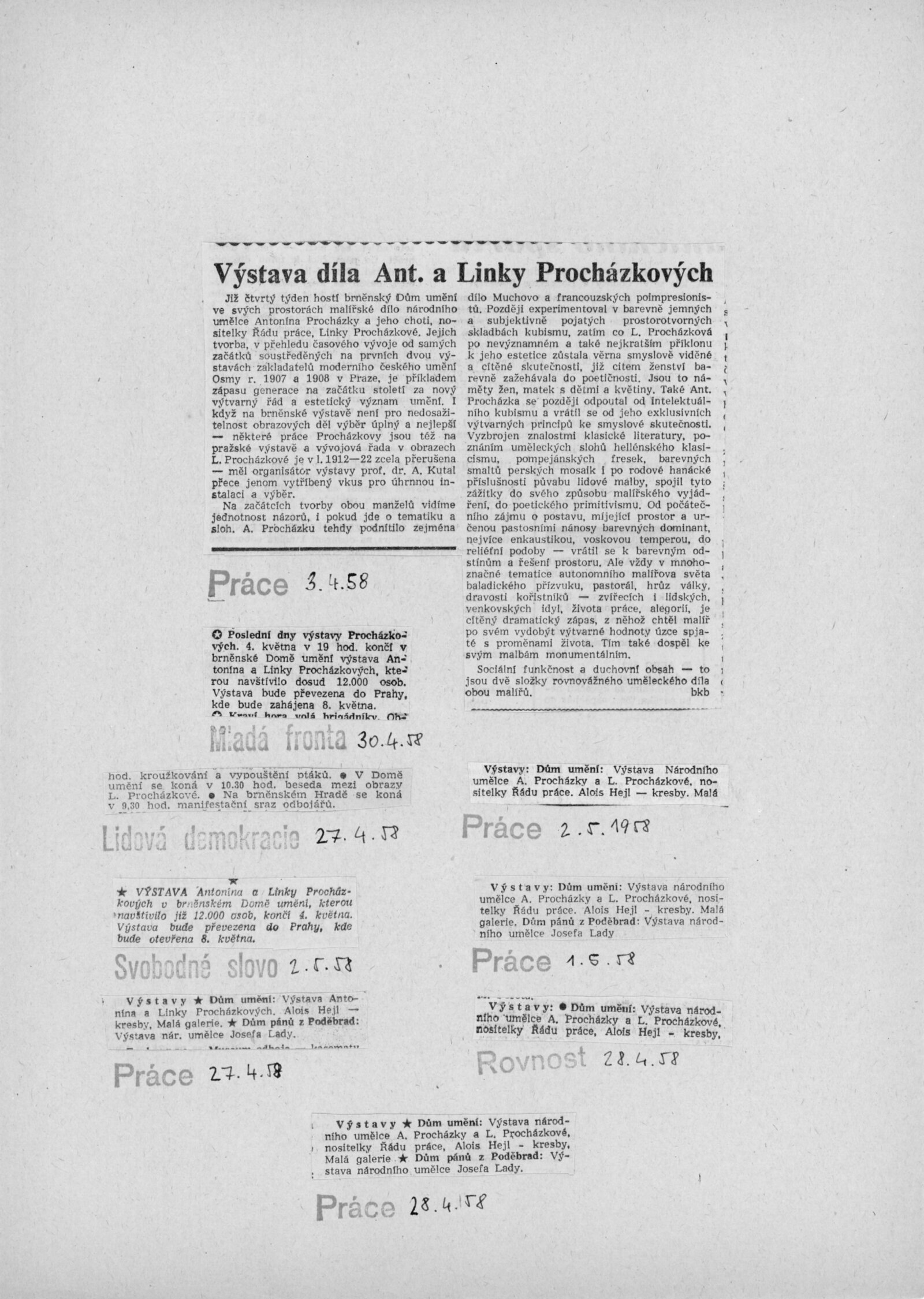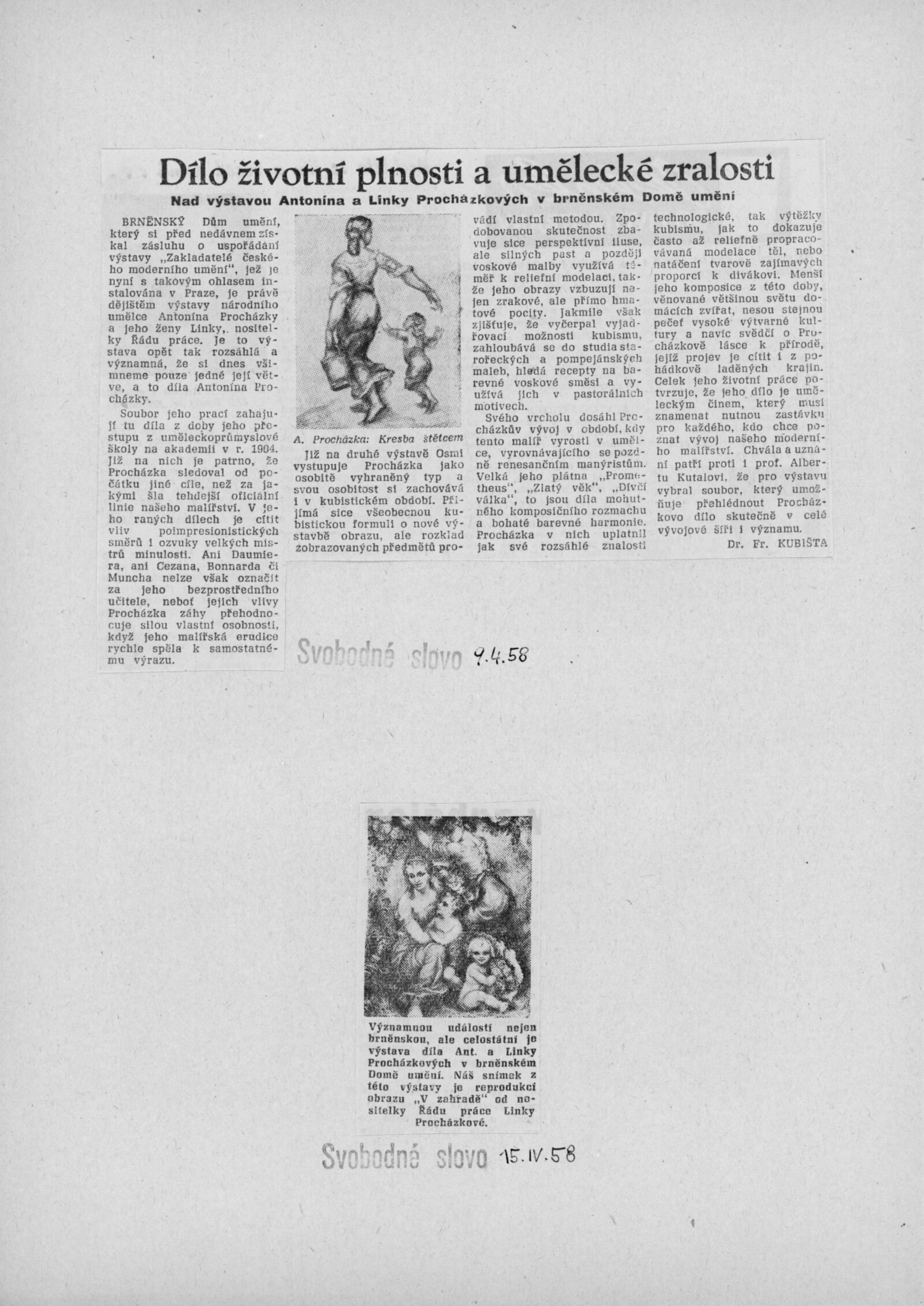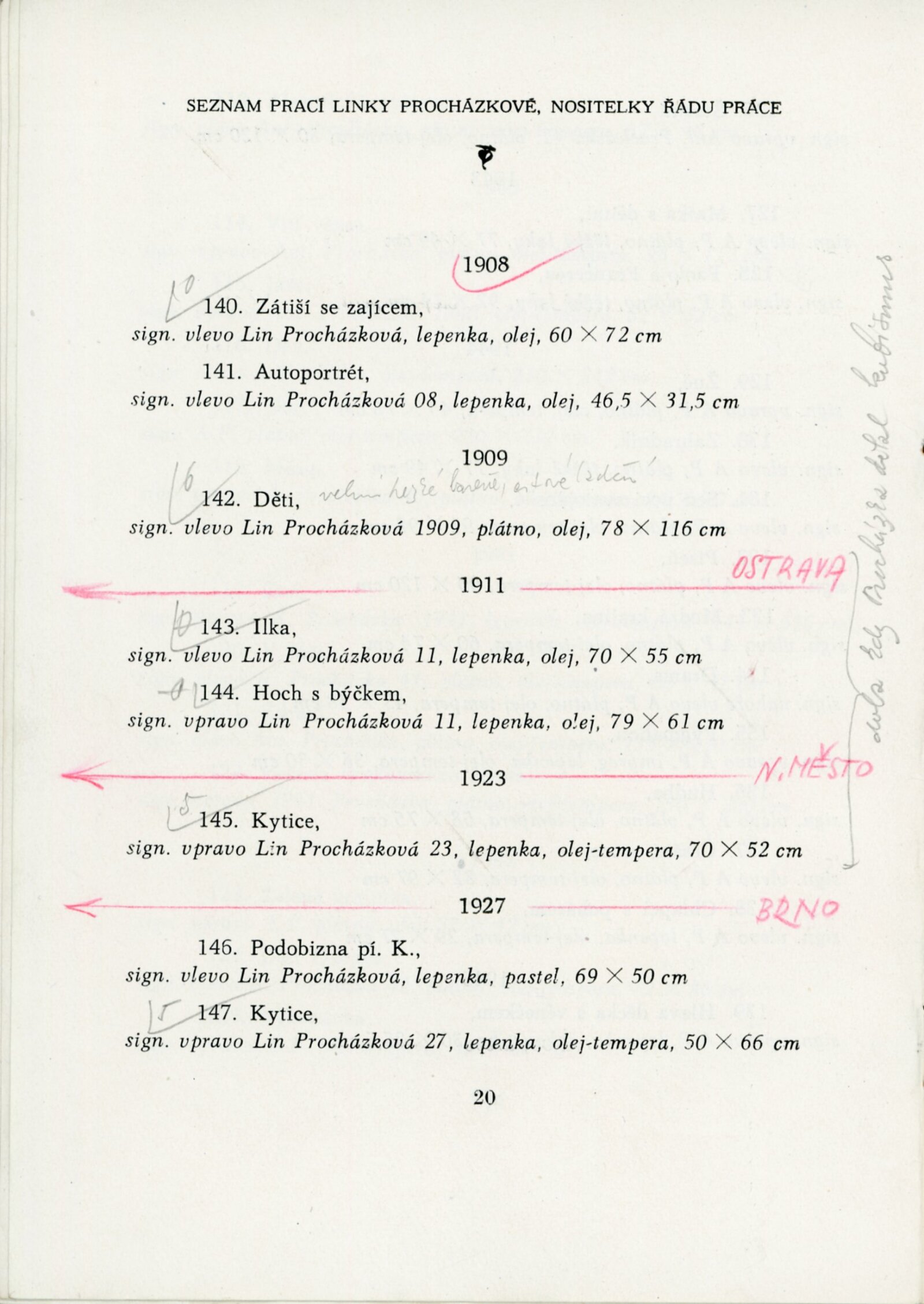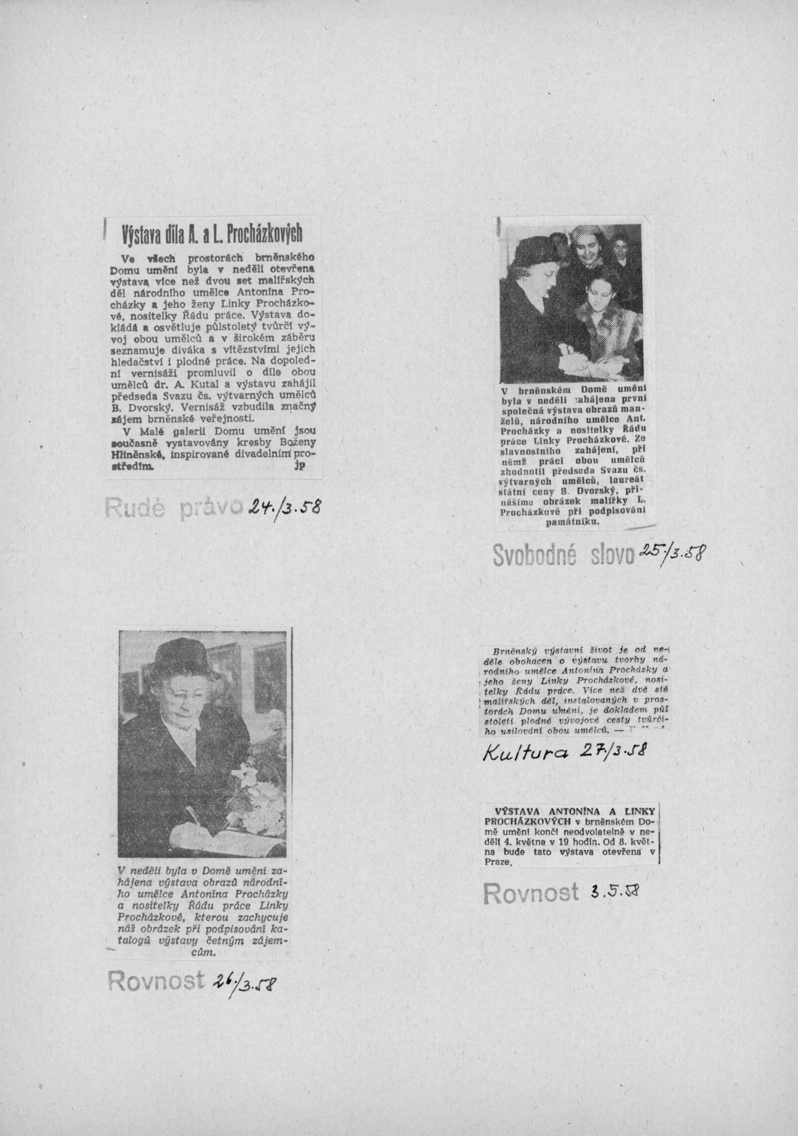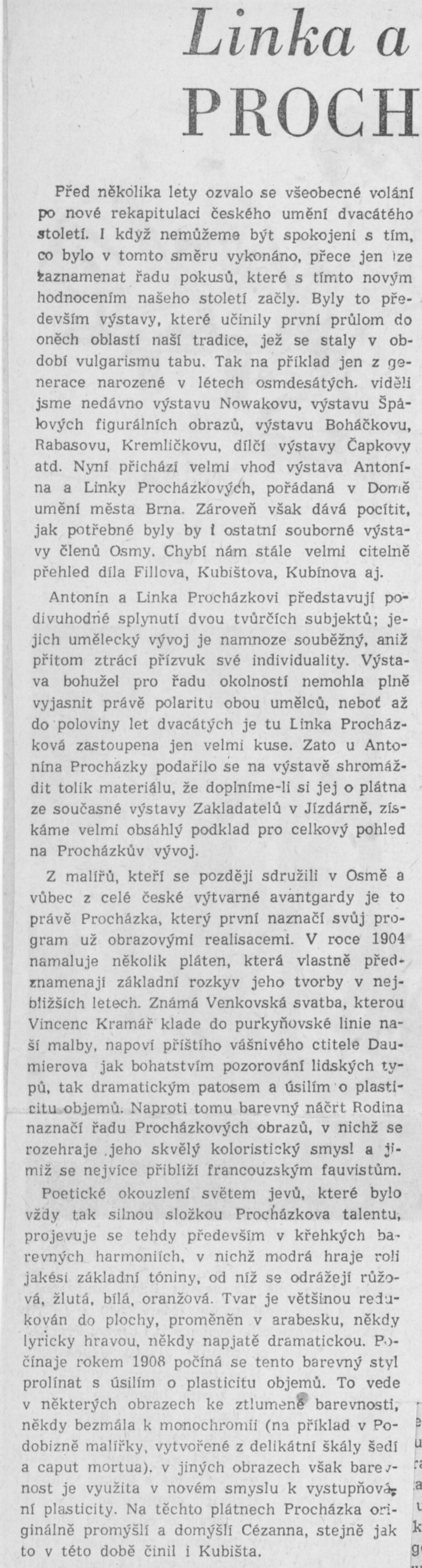 Výstava národního umělce Antonína Procházky, Linky Procházkové, nositelky Řádu práce: Dům umění města Brna, 23. 3. – 4. 5. 1958 / Text: Albert Kutal. – Brno: DUmB, 1958. – 25 s., 10 s. obr. příl., DU 307. – Kubíček 7932; MZK; MG; MMB