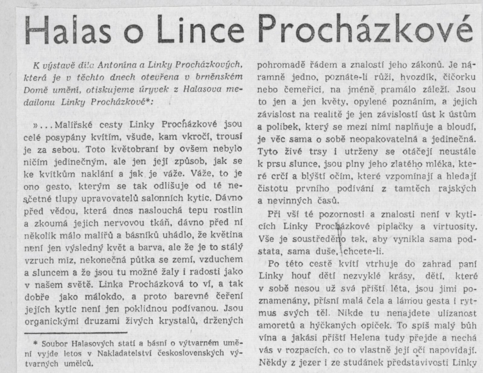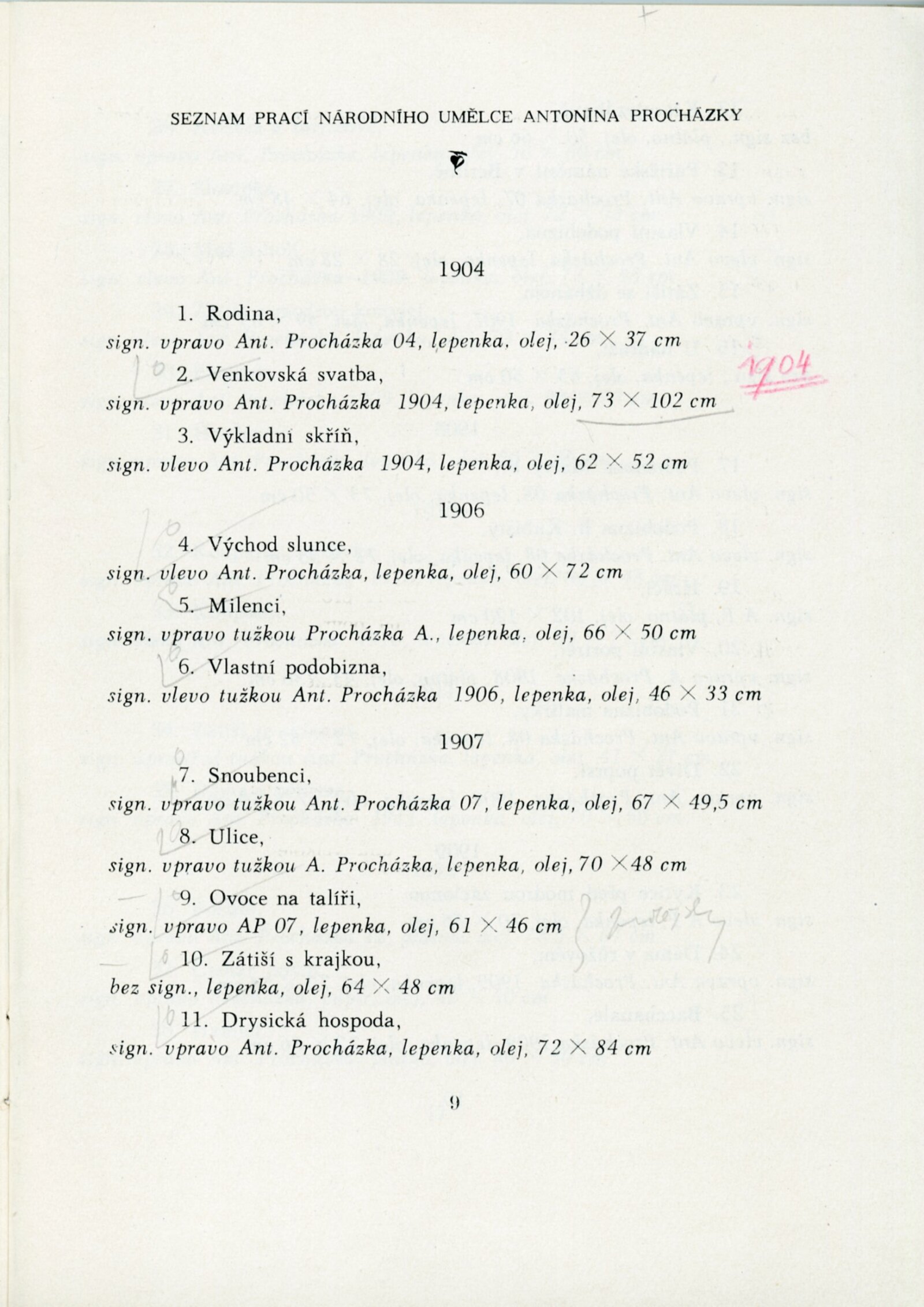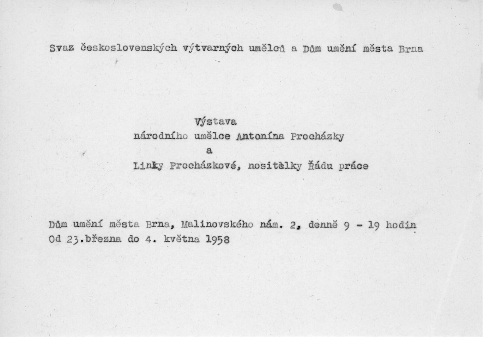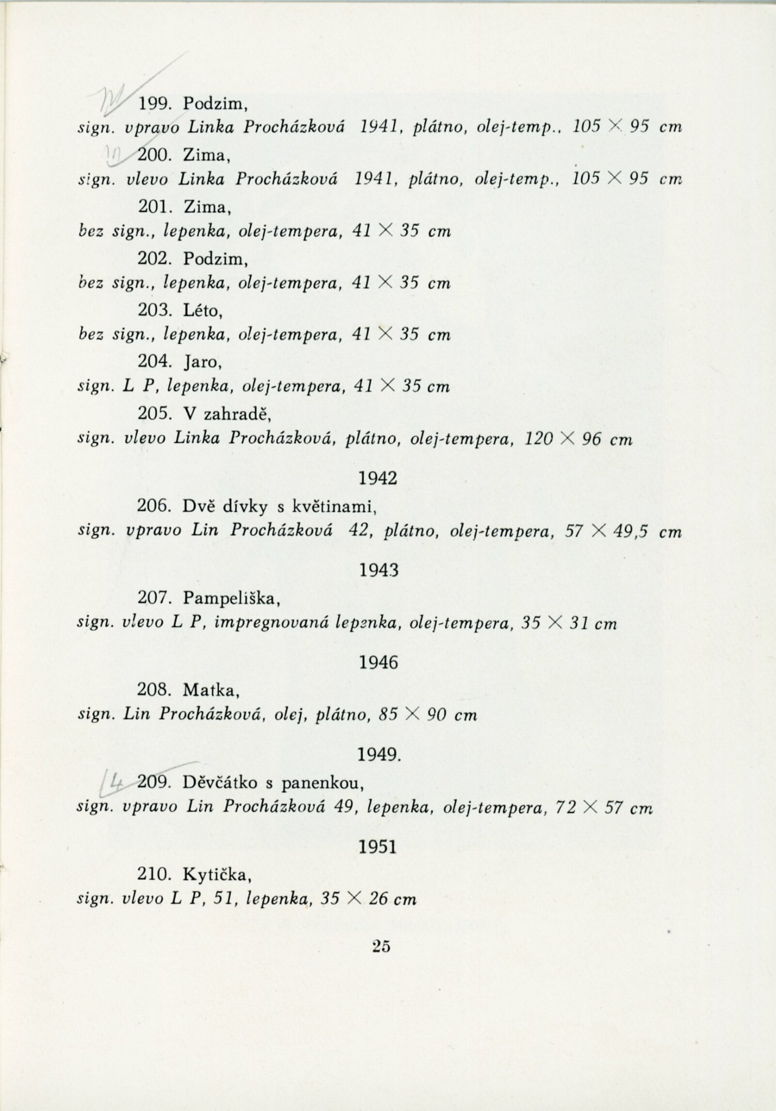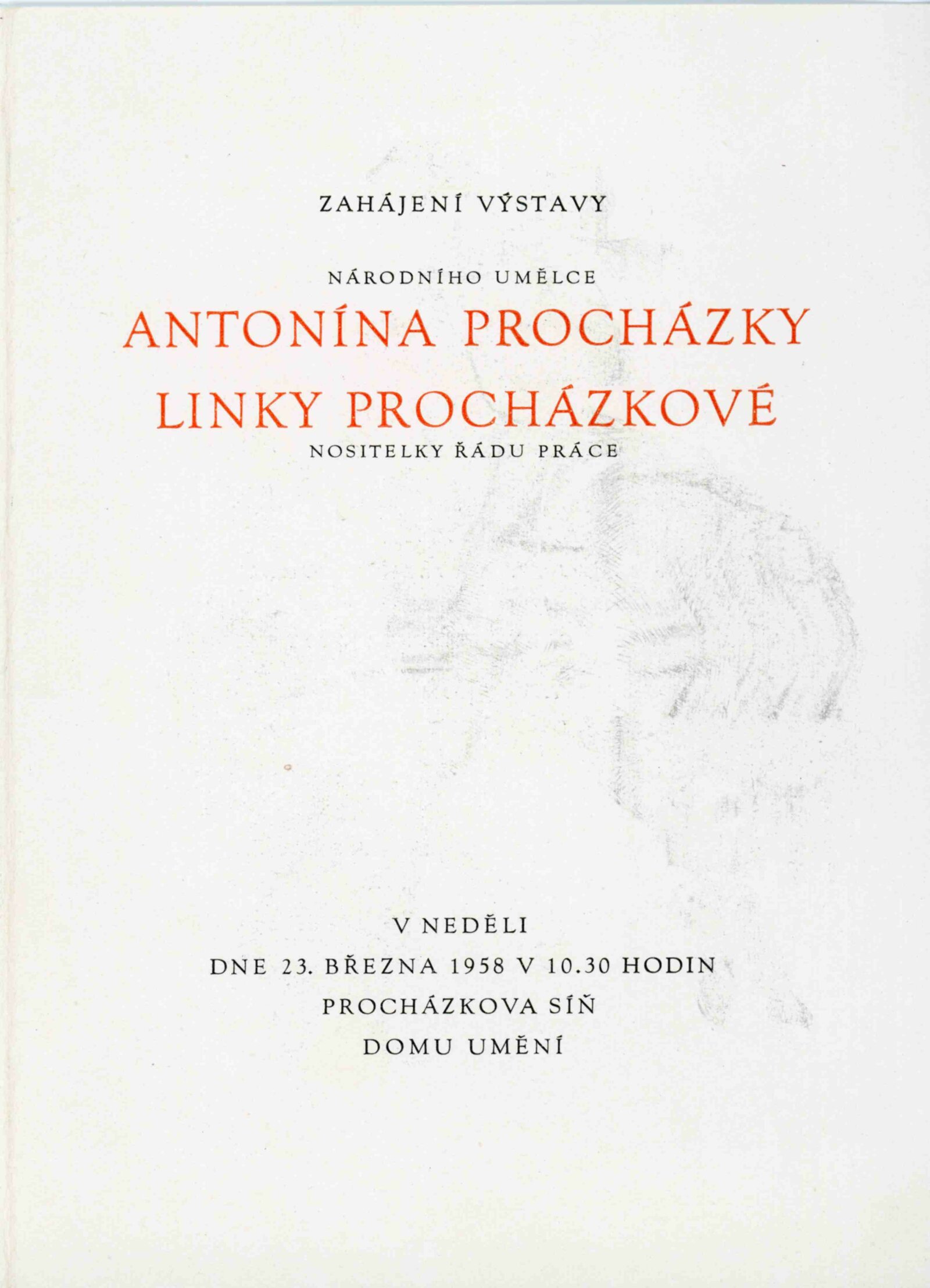 Výstava národního umělce Antonína Procházky, Linky Procházkové, nositelky Řádu práce: Dům umění města Brna, 23. 3. – 4. 5. 1958 / Text: Albert Kutal. – Brno: DUmB, 1958. – 25 s., 10 s. obr. příl., DU 307. – Kubíček 7932; MZK; MG; MMB