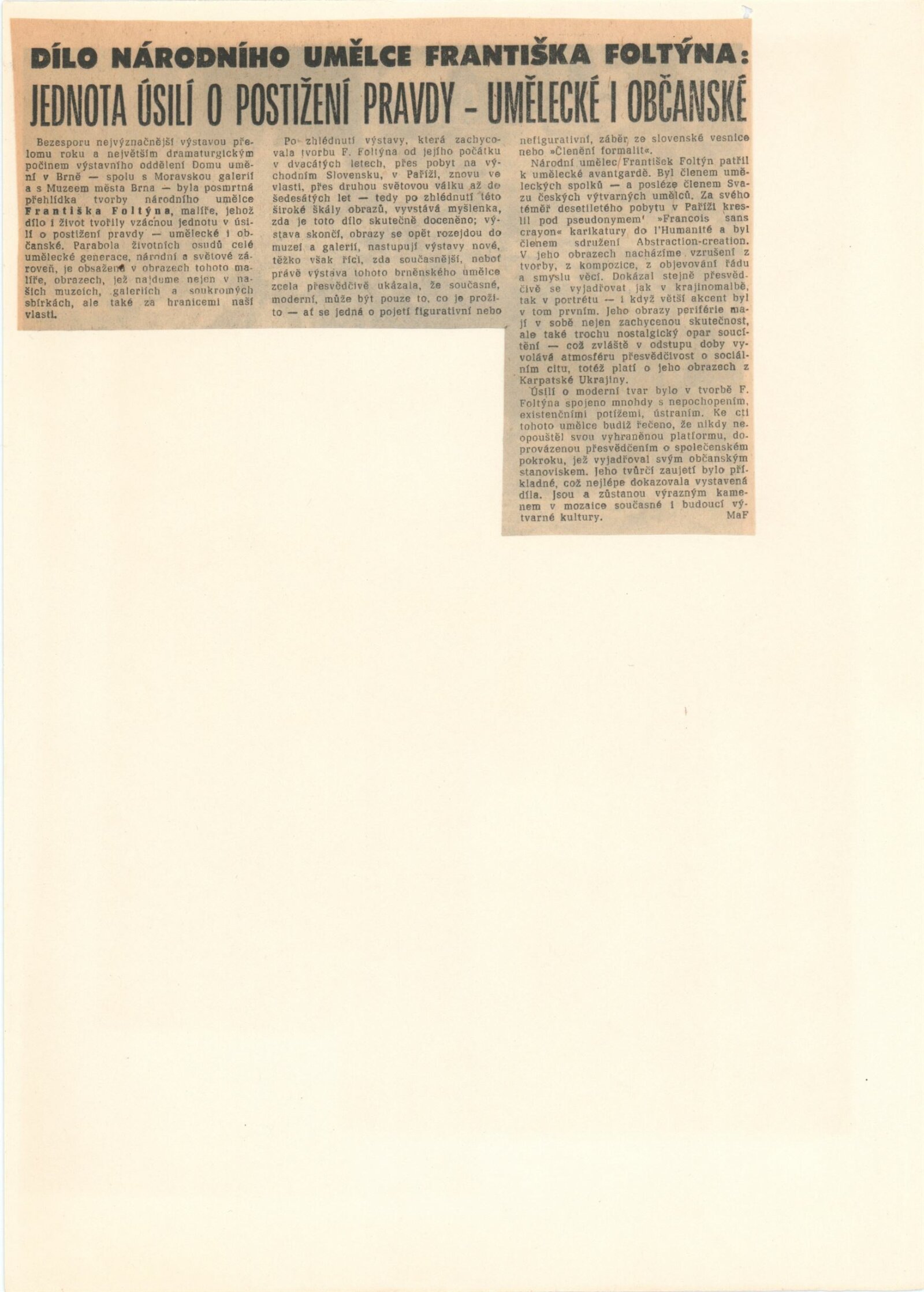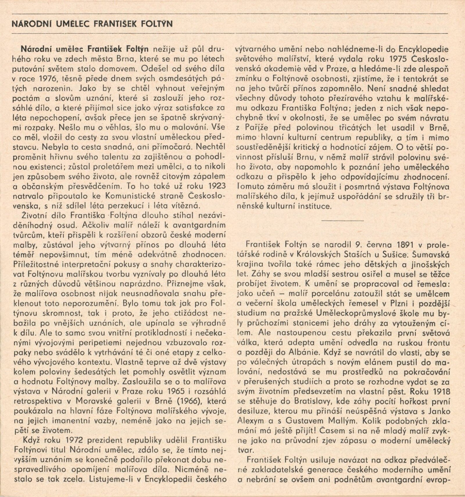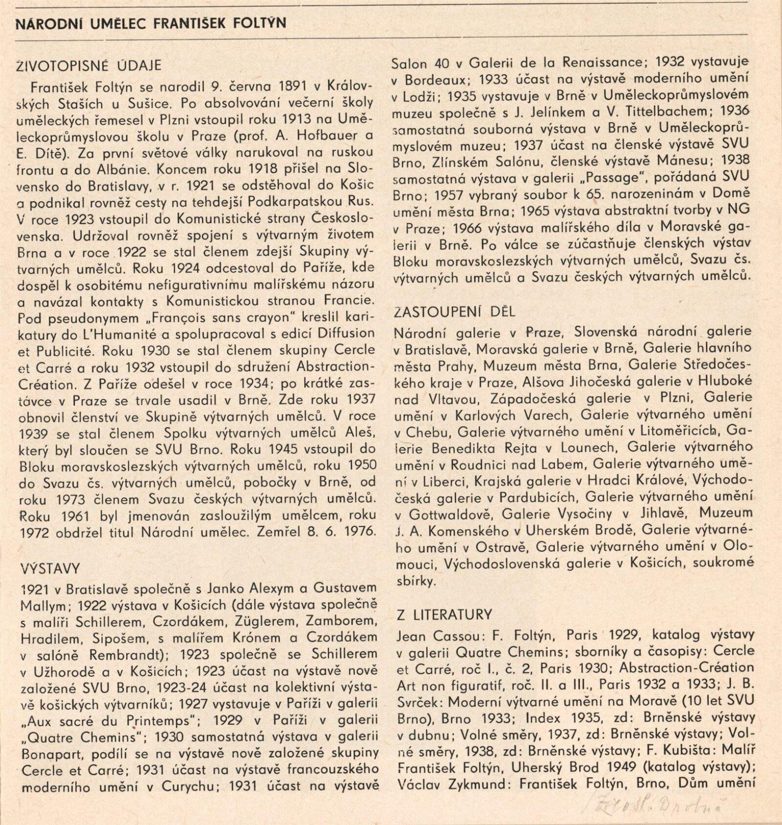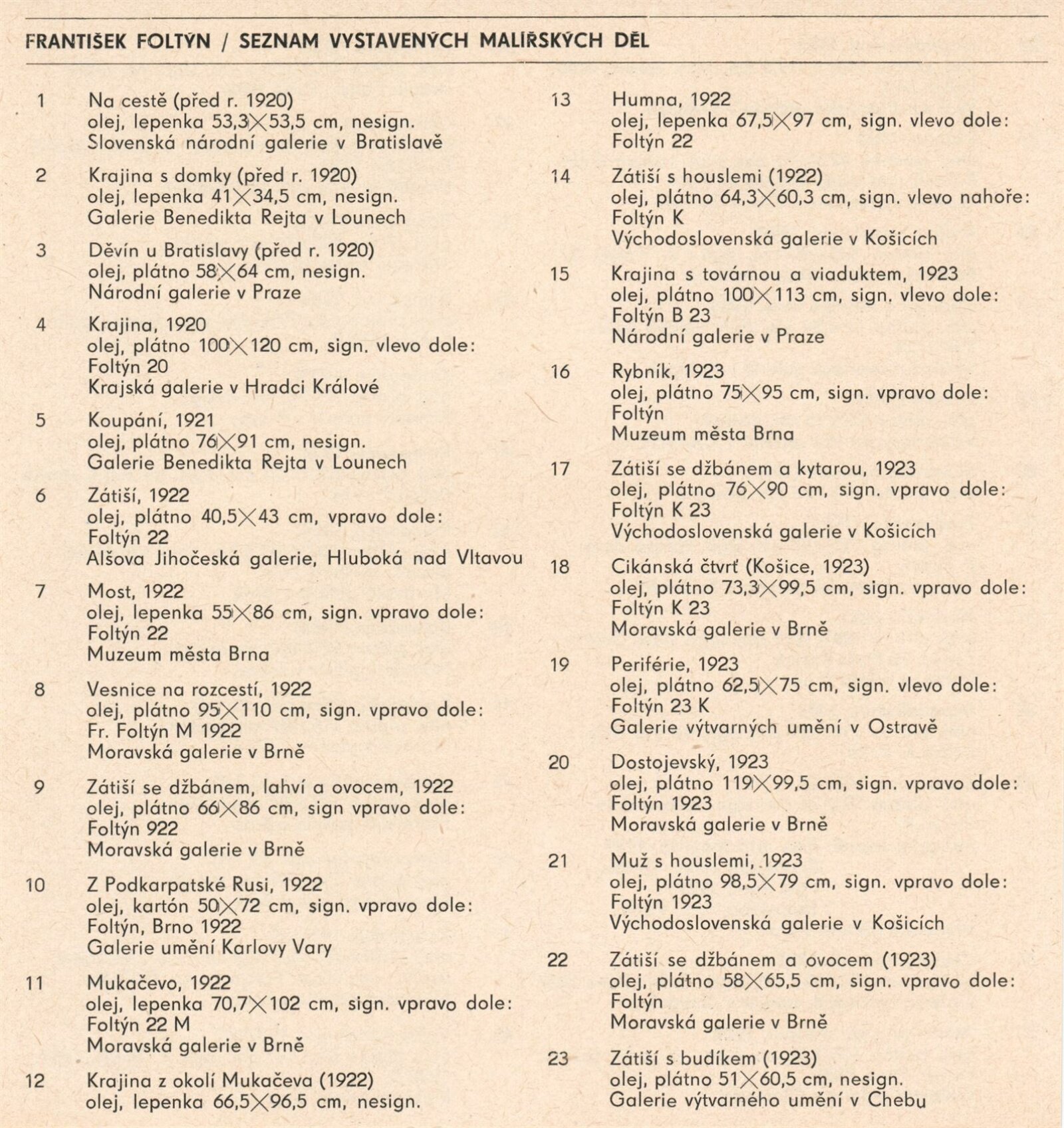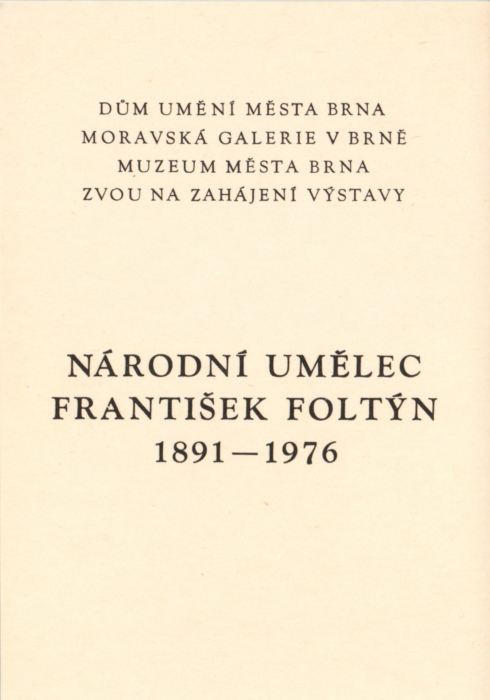 Národní umělec František Foltýn: Dům umění, Brno, 1. 12. 1977 – 8. 1. 1978 / Text: Jiří Hlušička. – Brno: DUmB, 1977. – 28 s., obr., seznam vystavených malířských děl 4 s., životopisné údaje, výstavy, zastoupení ve sbírkách, bibliografie, DU 664. – MZK; MMB