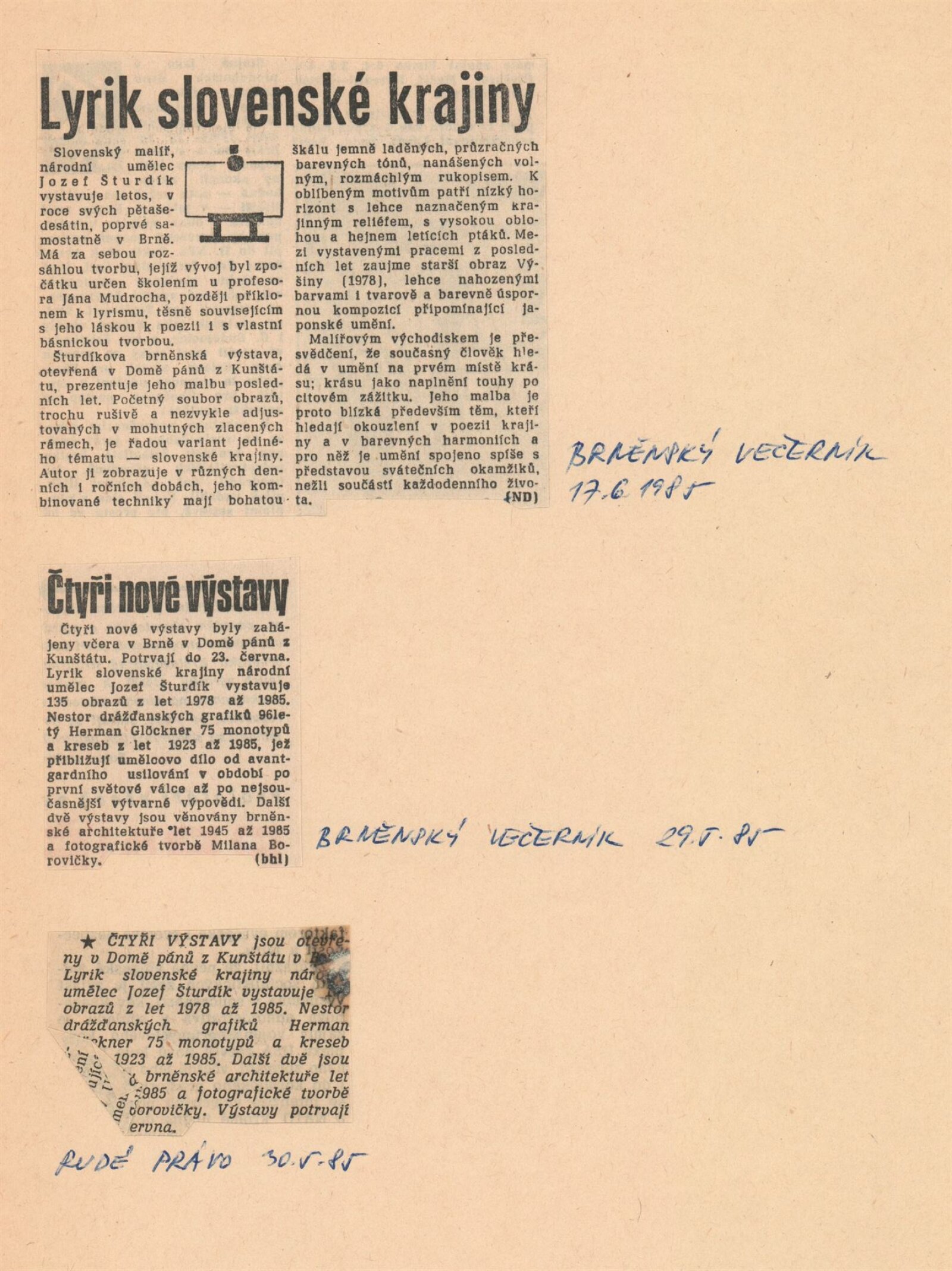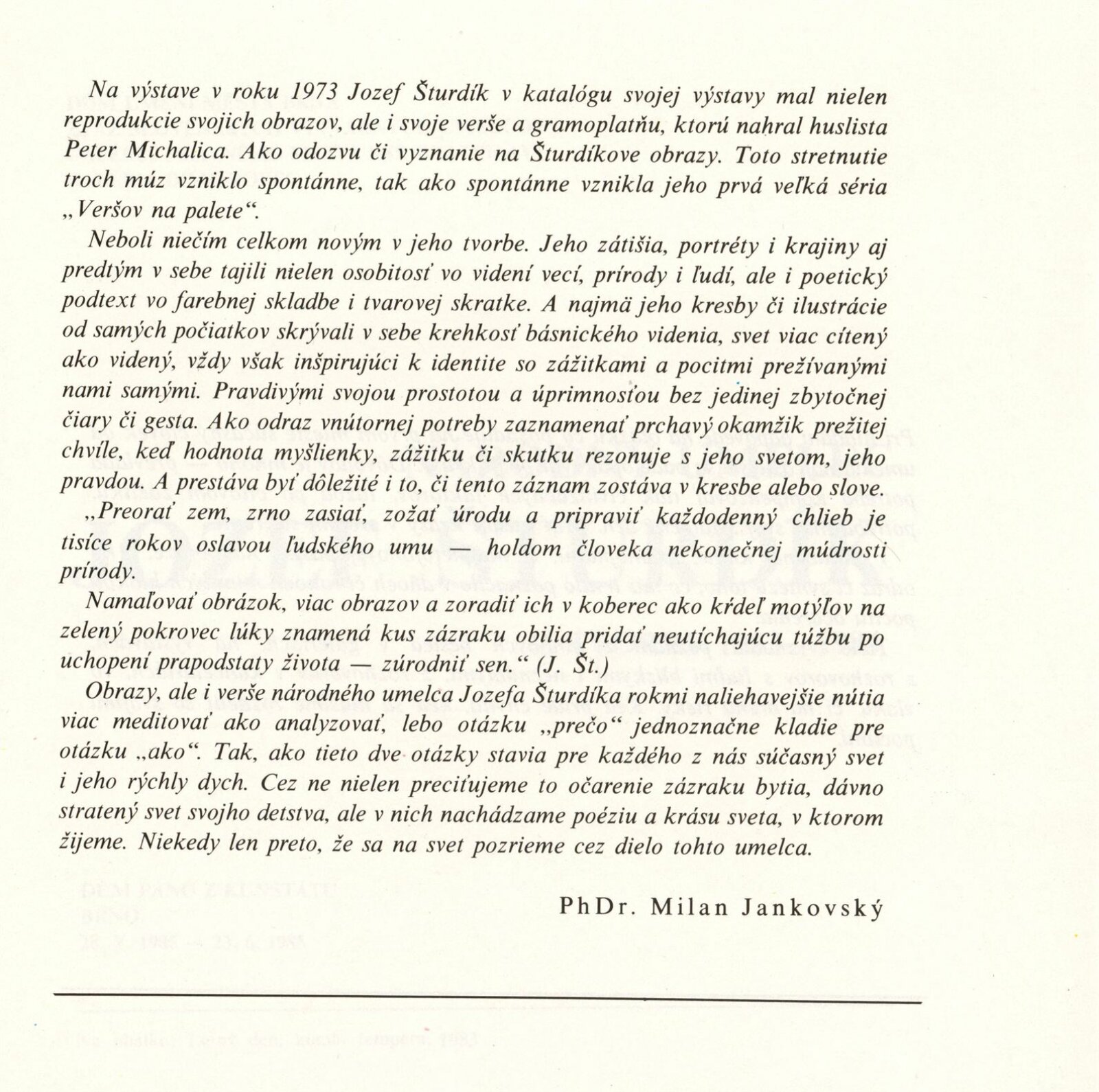 Národní umělec Josef Šturdík. Z tvorby 1983–1984: Dům umění / Dům pánů z Kunštátu, 28. 5. – 23. 6. 1985 / Texty: Milan Jankovský, Ivan Schurmann. – Bratislava: Závodní klub CHZJD, 1985. – 12 s., obr., životní data, DPK 848