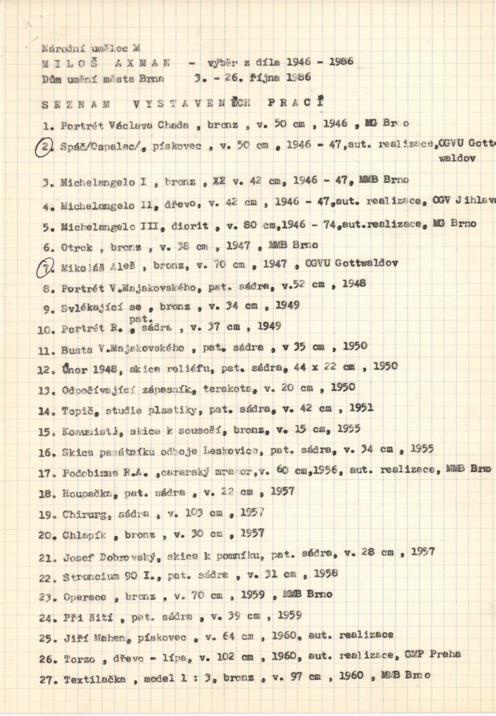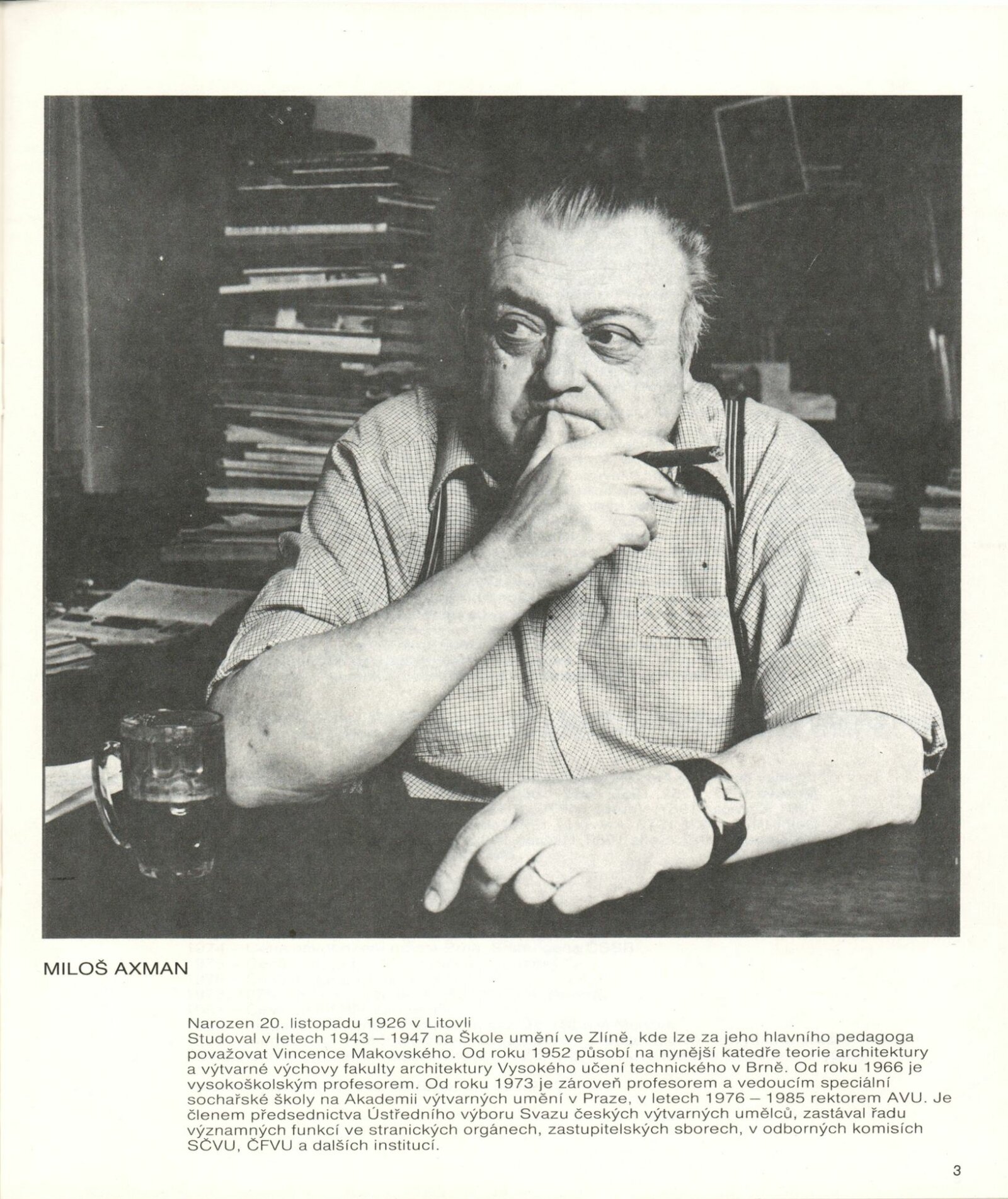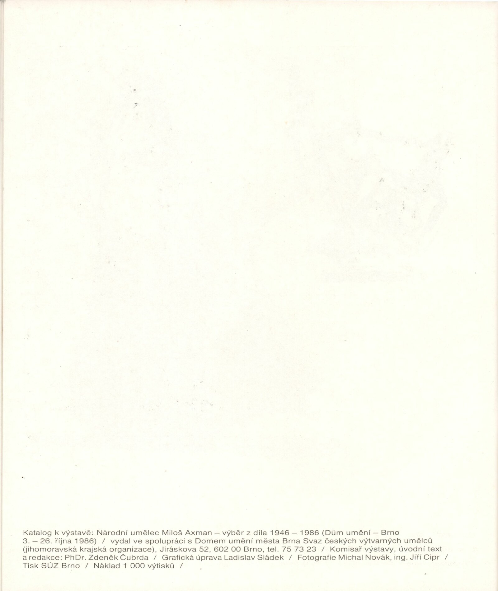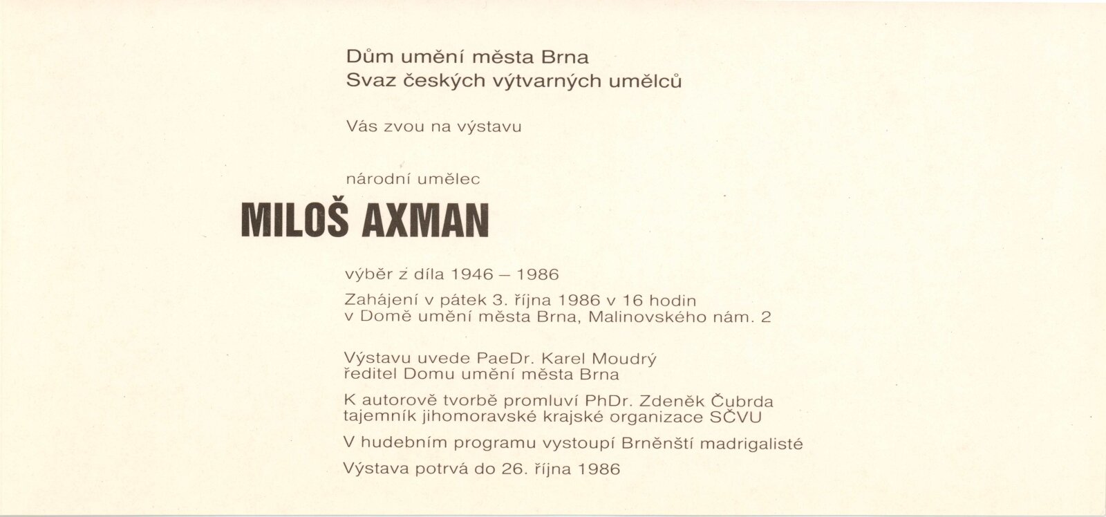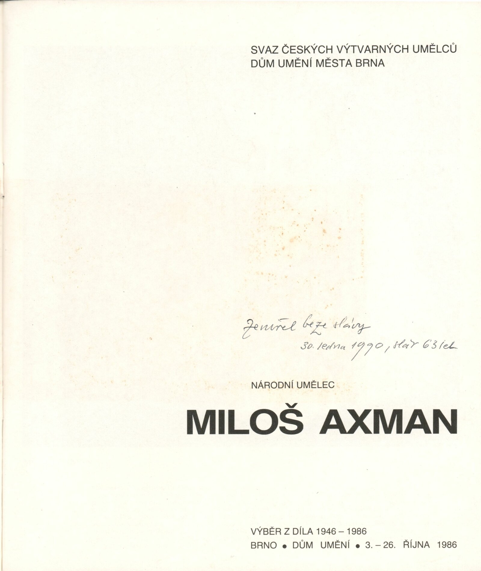 Národní umělec Miloš Axman. Výběr z díla 1946–1986: Dům umění, 3. 10. – 26. 10. 1986 / Text: Zdeněk Čubrda. – Brno: DUmB, 1986. – 35 s., obr., seznam vystavených prací [3] s., portrét, životopis, seznam výstav, ocenění, seznam realizací, DU 825. – MZK; MG