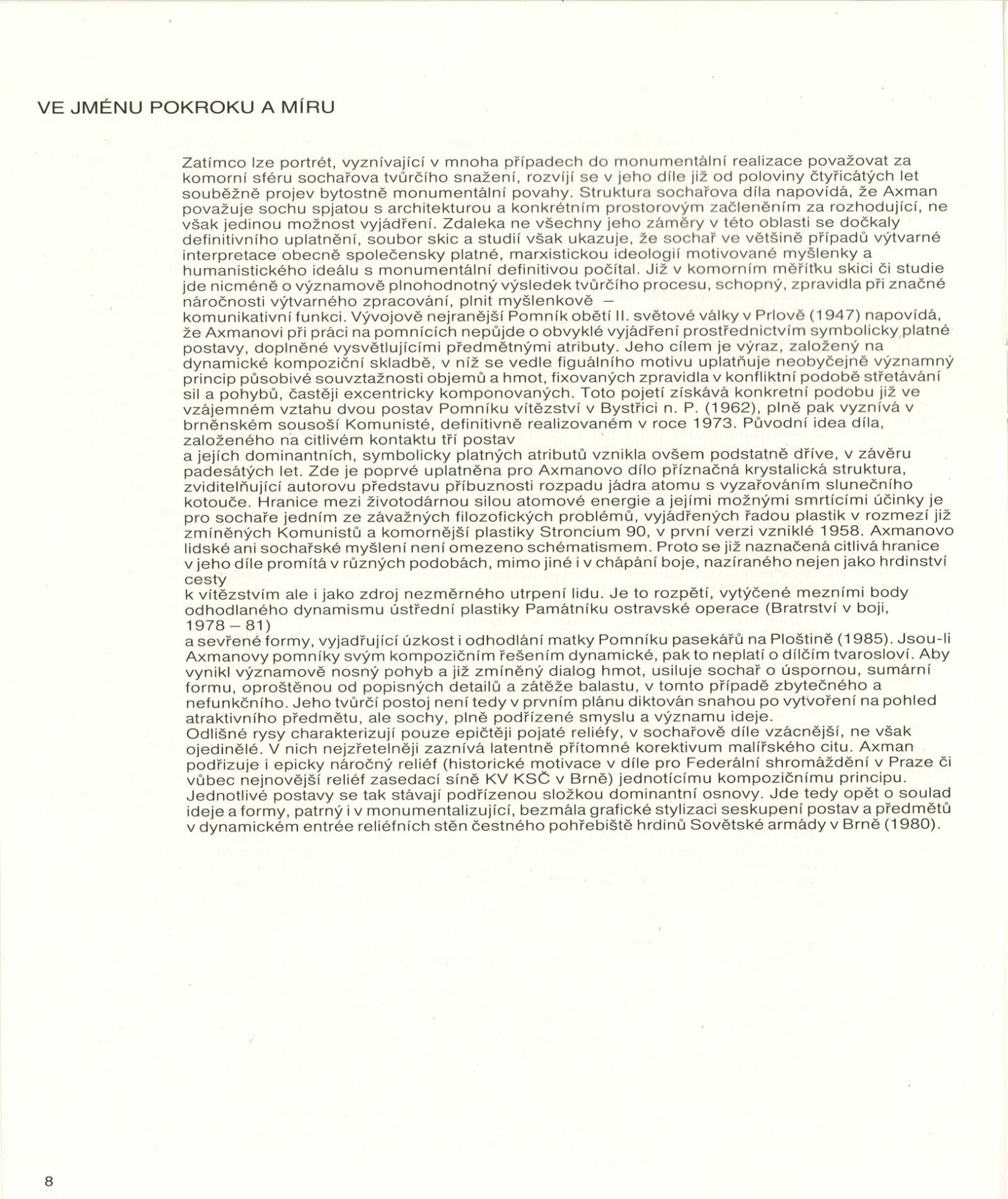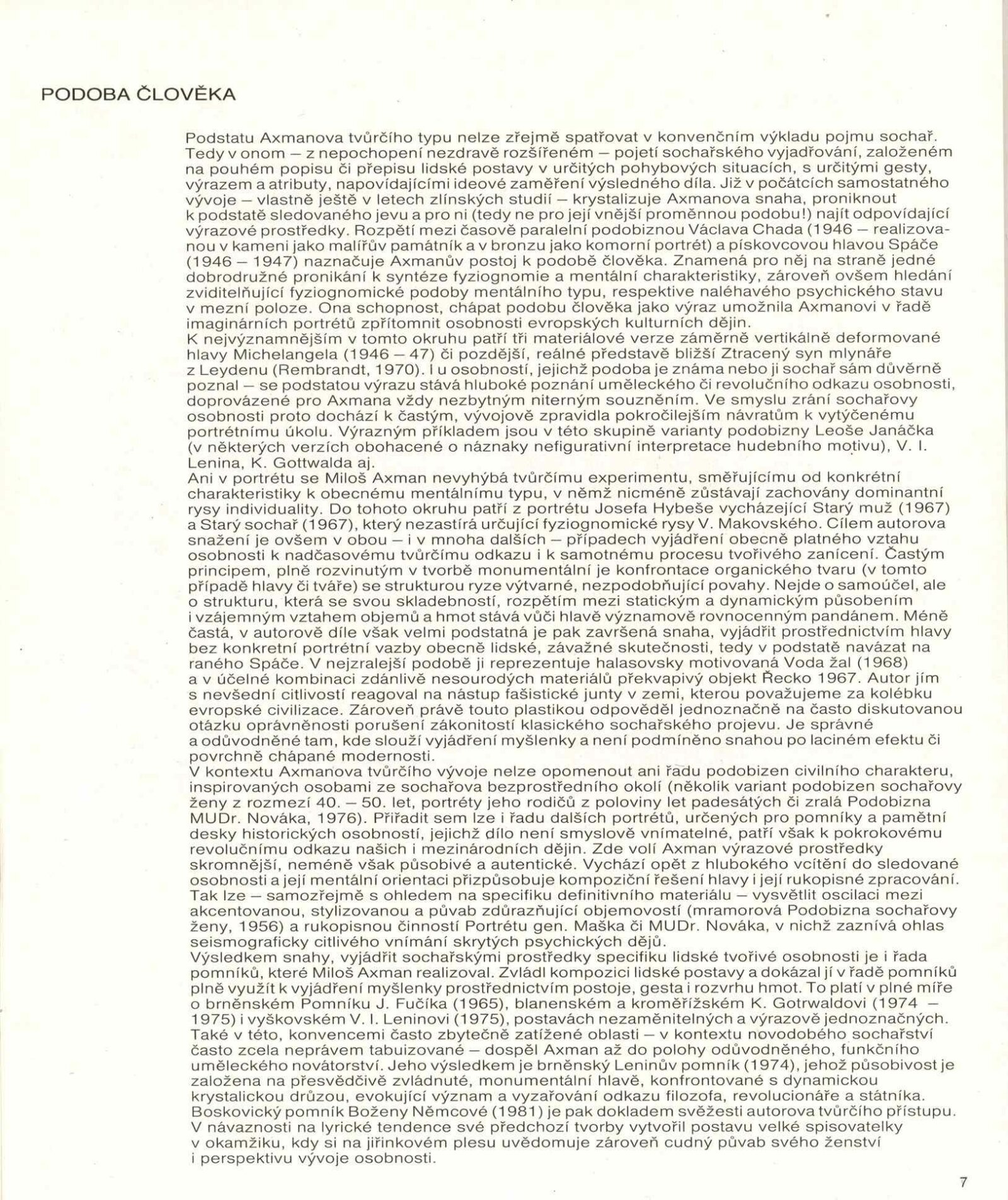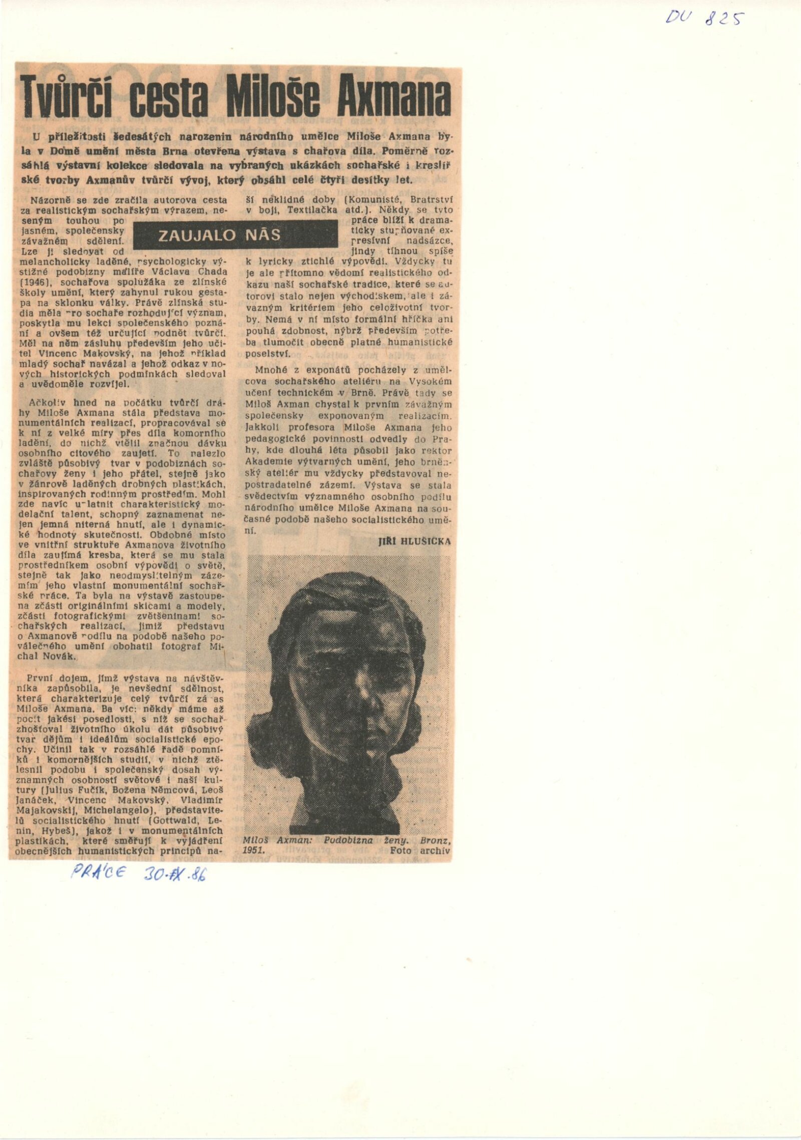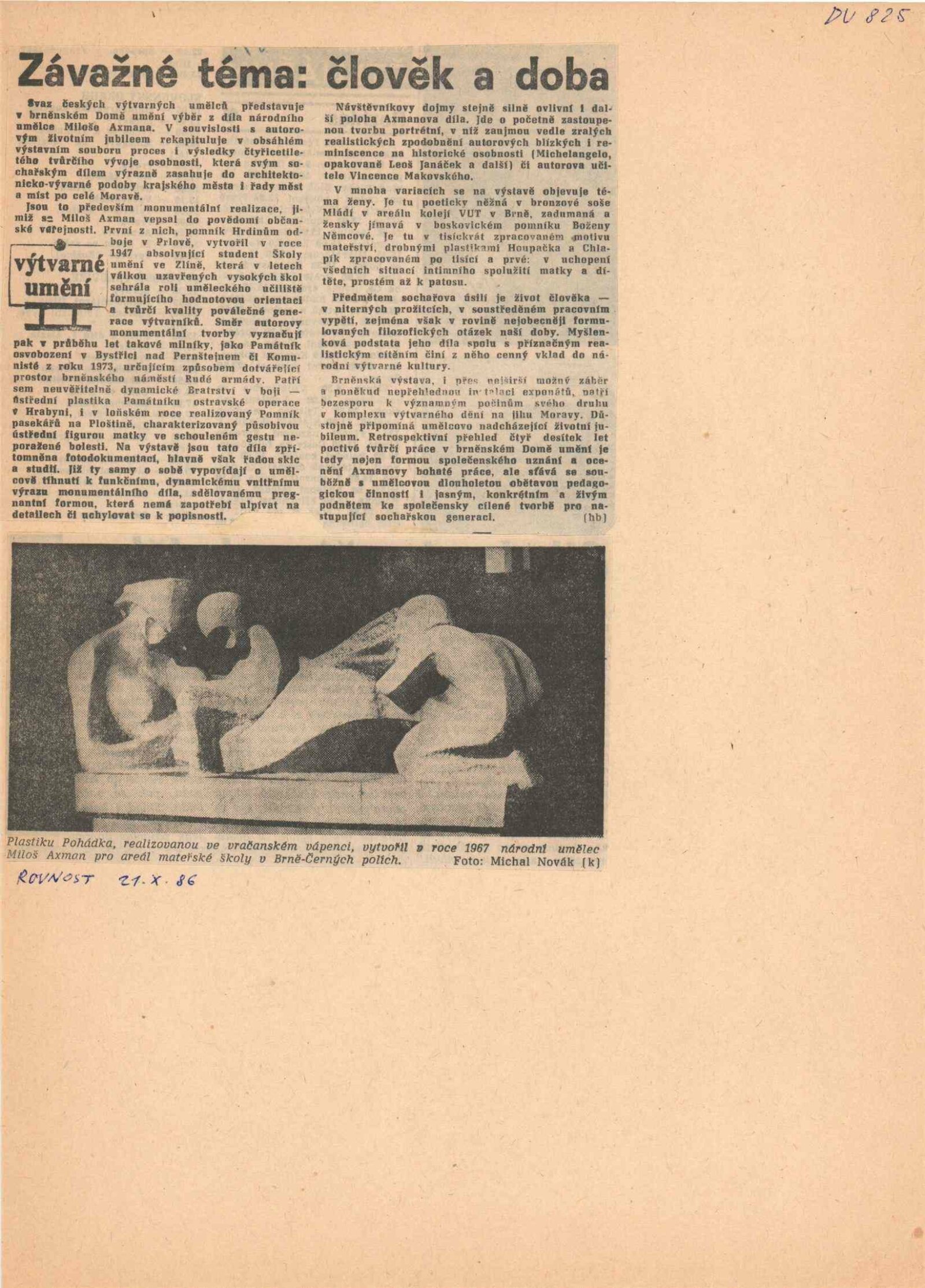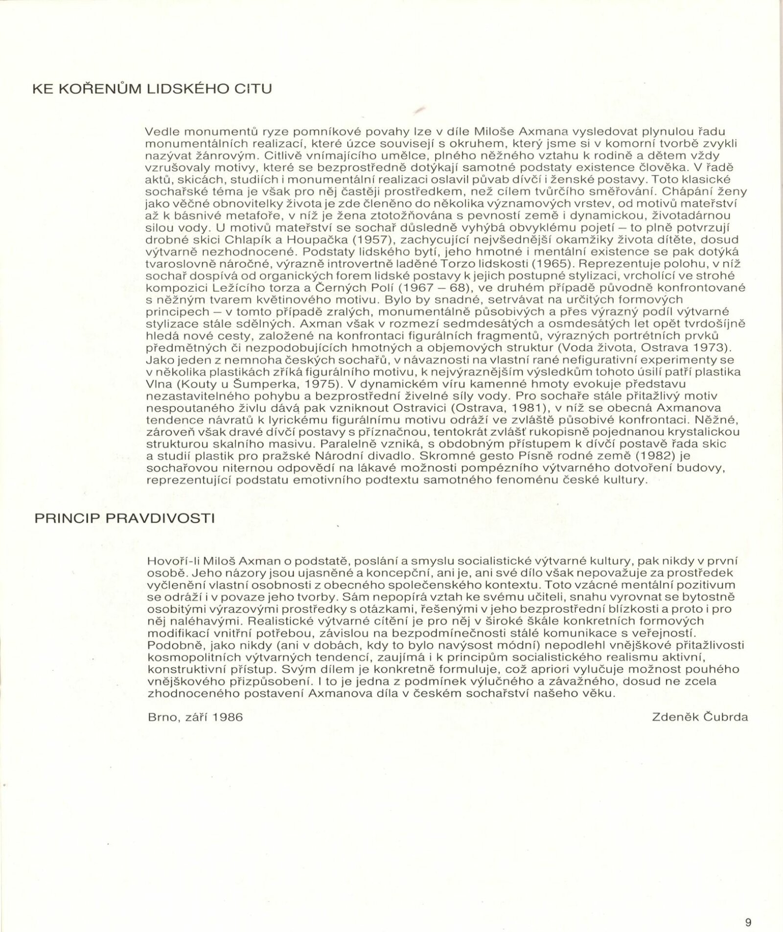 Národní umělec Miloš Axman. Výběr z díla 1946–1986: Dům umění, 3. 10. – 26. 10. 1986 / Text: Zdeněk Čubrda. – Brno: DUmB, 1986. – 35 s., obr., seznam vystavených prací [3] s., portrét, životopis, seznam výstav, ocenění, seznam realizací, DU 825. – MZK; MG