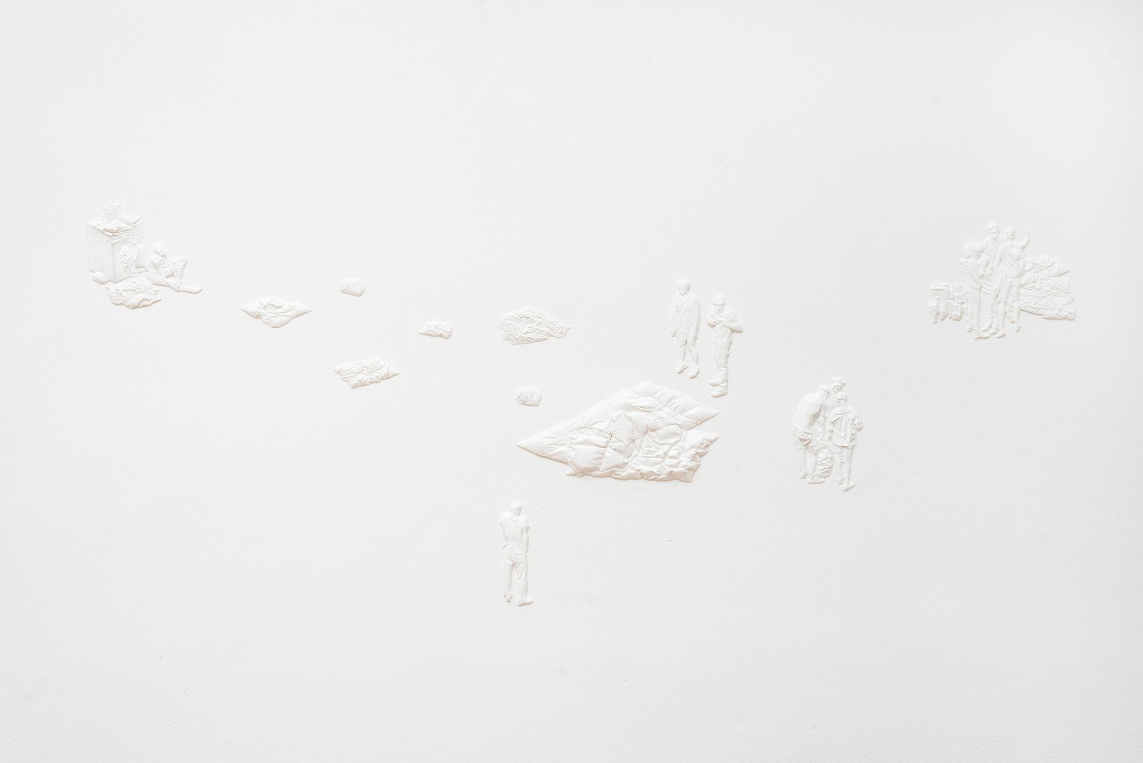 Reliéfy Viléma Duhy, které v roce 2024 představil na výstavě Frieze v kině Art (Galerie Art) v Brně, působí jako přeludy těl. Jsou vyrobené z bílého plastu a splývají se stěnou, přesto na nich lze jasně rozpoznat figurativní scény s motivy domácího prostředí – ložní prádlo, pokojové rostliny, stoly a židle. Duha precizně pracuje s rozestupy mezi jednotlivými reliéfy, čímž vytváří scénickou prostorovou iluzi. Ačkoli lidé na jeho dílech stojí ve skupinách, působí naprosto izolovaně. Tento druh osamění uprostřed davu připomíná změť postav z obrazů Pietera Bruegela. Stejně jako u něj, ani u Duhy výjevy nezobrazují konkrétní osoby, ale prototypy otců, matek, dětí, peřin a pokojových rostlin. Otvory v draperiích a podivná stvoření pak odkazují do surreálného světa.
