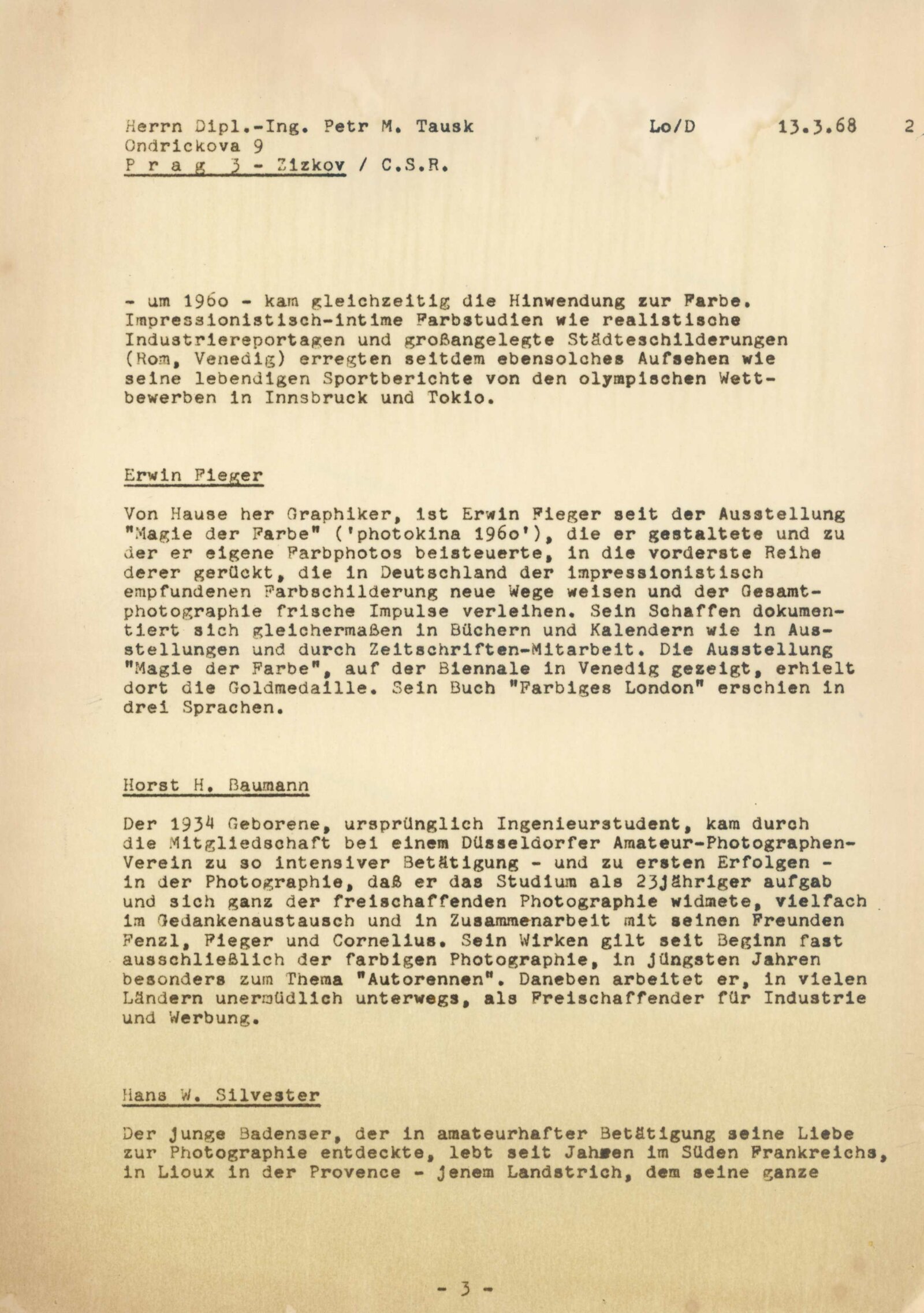pozvánka, projev na vernisáži (P. Tausek), program DU duben 1968, seznam fotografů s krátkými medailony (NJ, ČJ), soupis výstavních panelů, korespondence (o přípravě výstavy – P. Tausk, Dr. Boje /Agfa/ DU a dalších reprízách, provozní korespondence), recenze v tisku