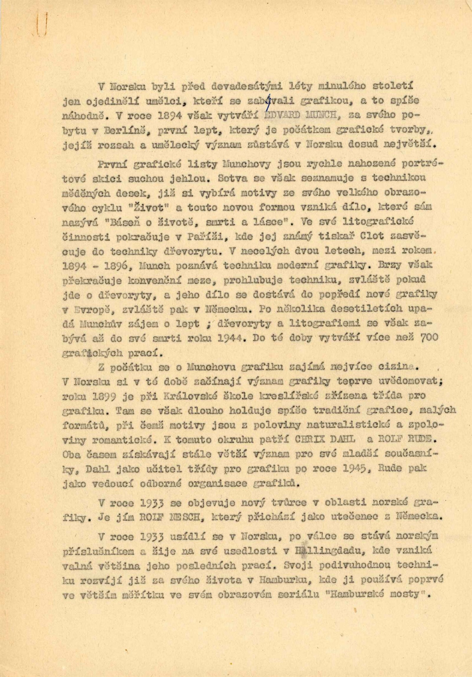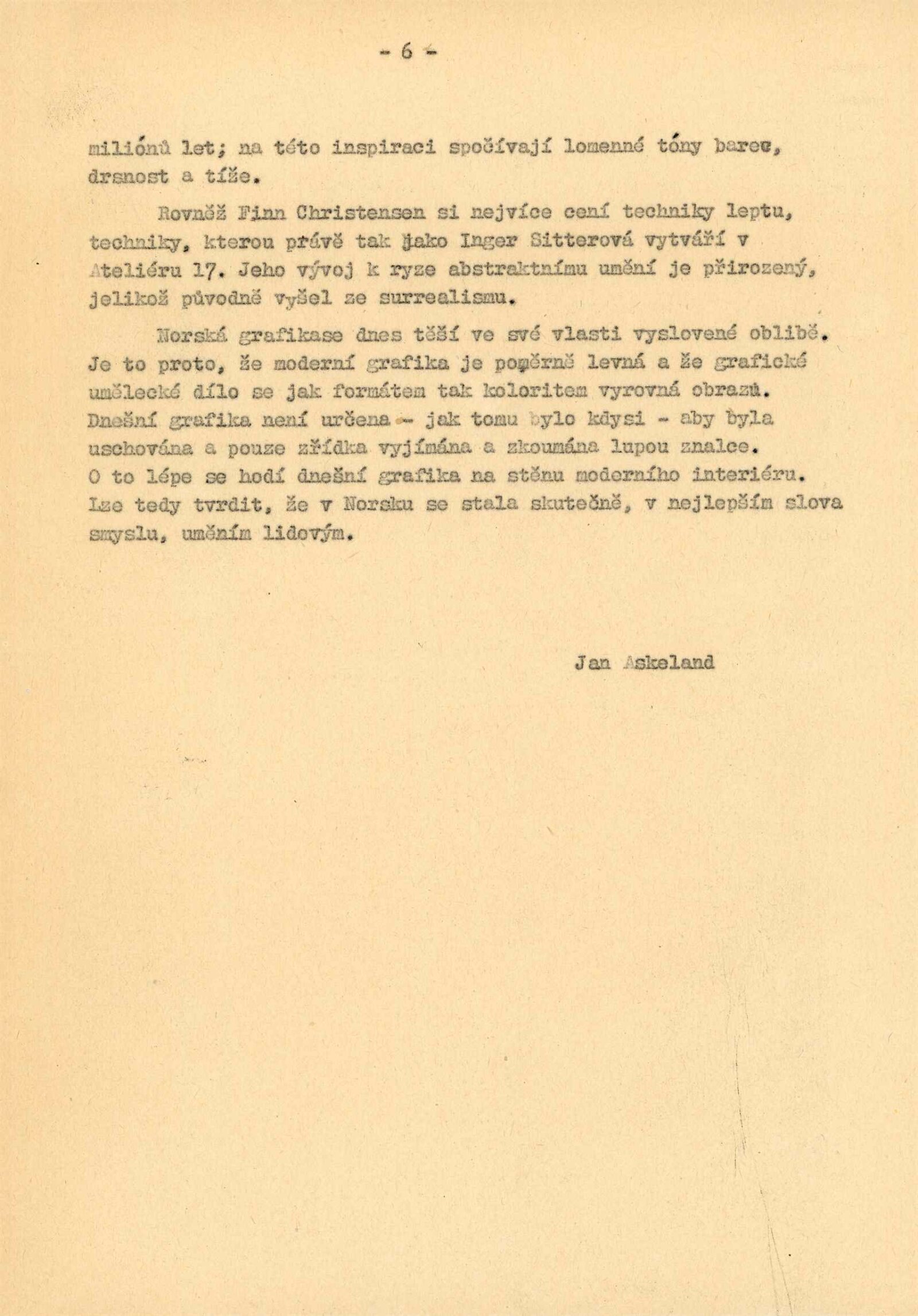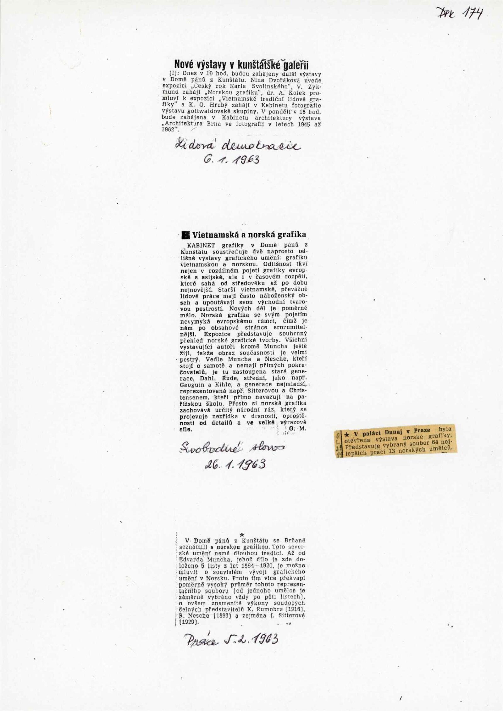 pozvánka, text o norské grafice od Jana Askelanda, protokol o převzetí výstavy, provozní korespondence (n. p. Výstavnictví), štítky k exponátům, recenze v tisku