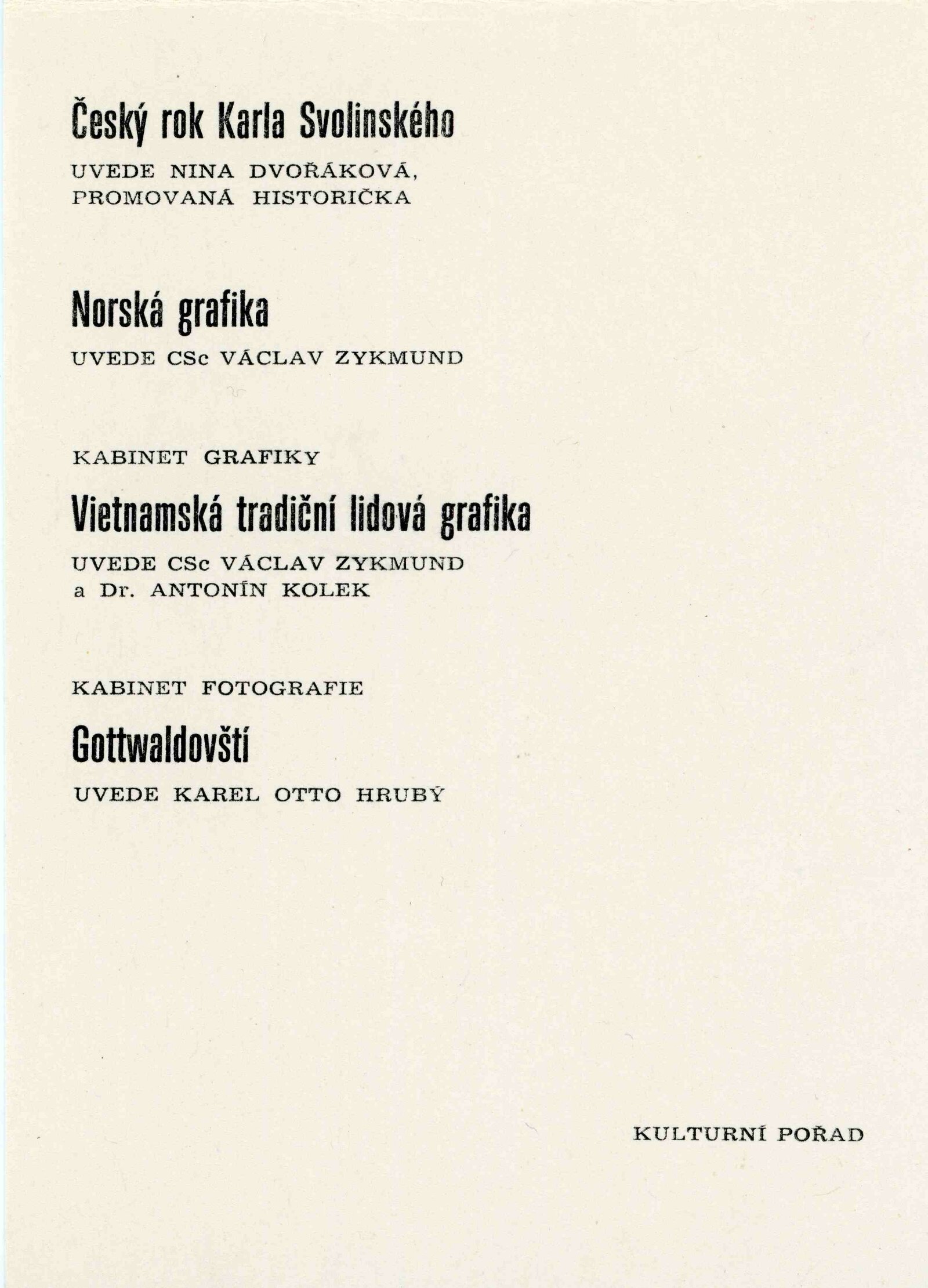Norská grafika: Dům umění města Brna / Dům pánů z Kunštátu, 1. patro, 6. 1. – 3. 2. 1963 / Převzatý katalog. Norská grafika: Výstavu uspořádalo Ministerstvo školství a kultury, 1962 / Text: Jan Tskeland. – Praha: Ministerstvo školství a kultury, 1962. – 16 s., obr., DPK 174. – UPM