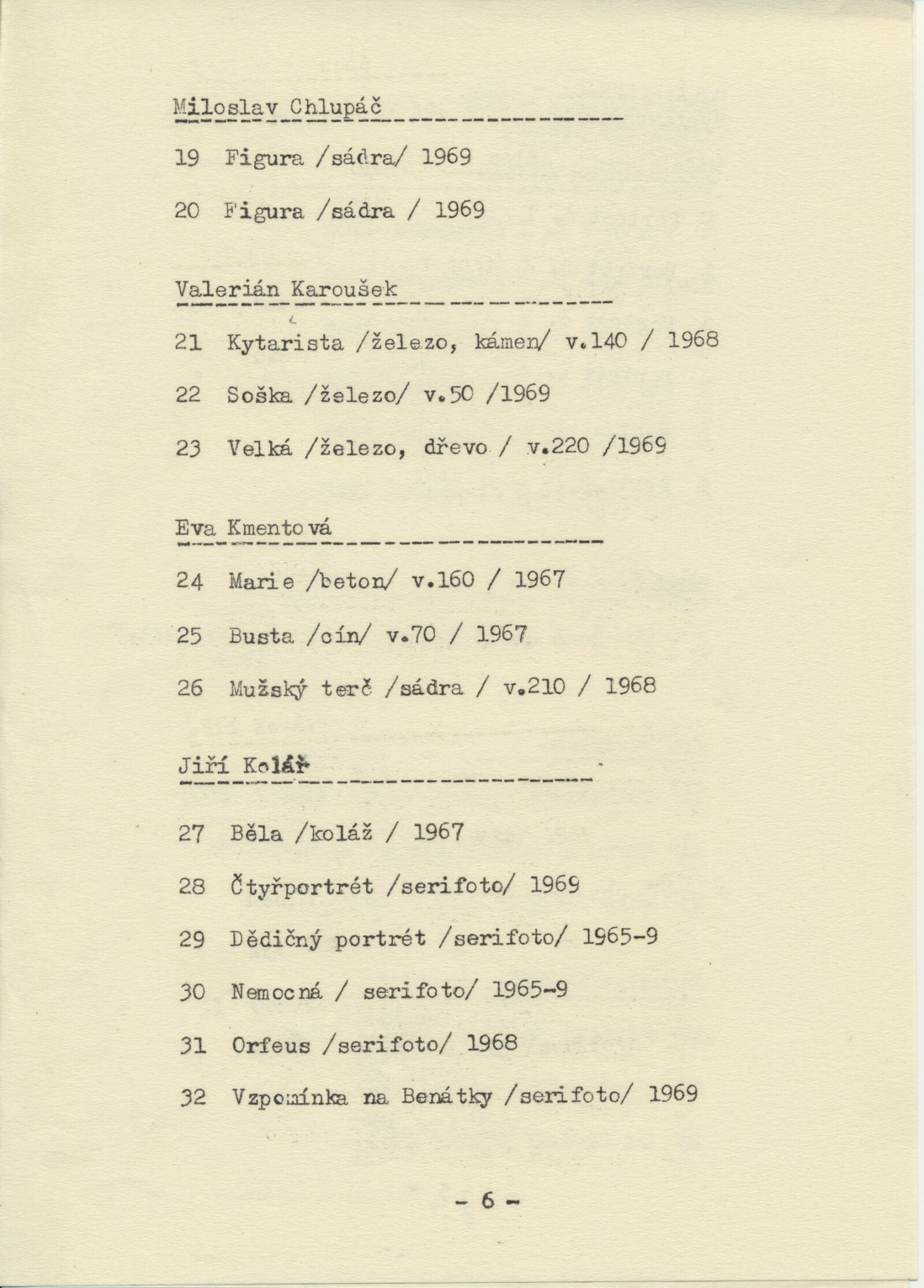 katalog, strojopis textu ke katalogu, anotace k výstavě, seznam vystavených děl s pojistnými cenami, dopis SČVU – podmínky realizace výstavy v Domě umění, korespondence k přípravě výstavy, plán instalace výstavy, provozní korespondence (poškozená plastika: Petr Oriešek) zápisy o převzetí výstavy, hlášení škody na exponátech (25. 2. 1970), reverzy, recenze v tisku, katalog a pozvánka (Praha Mánes, 1969)