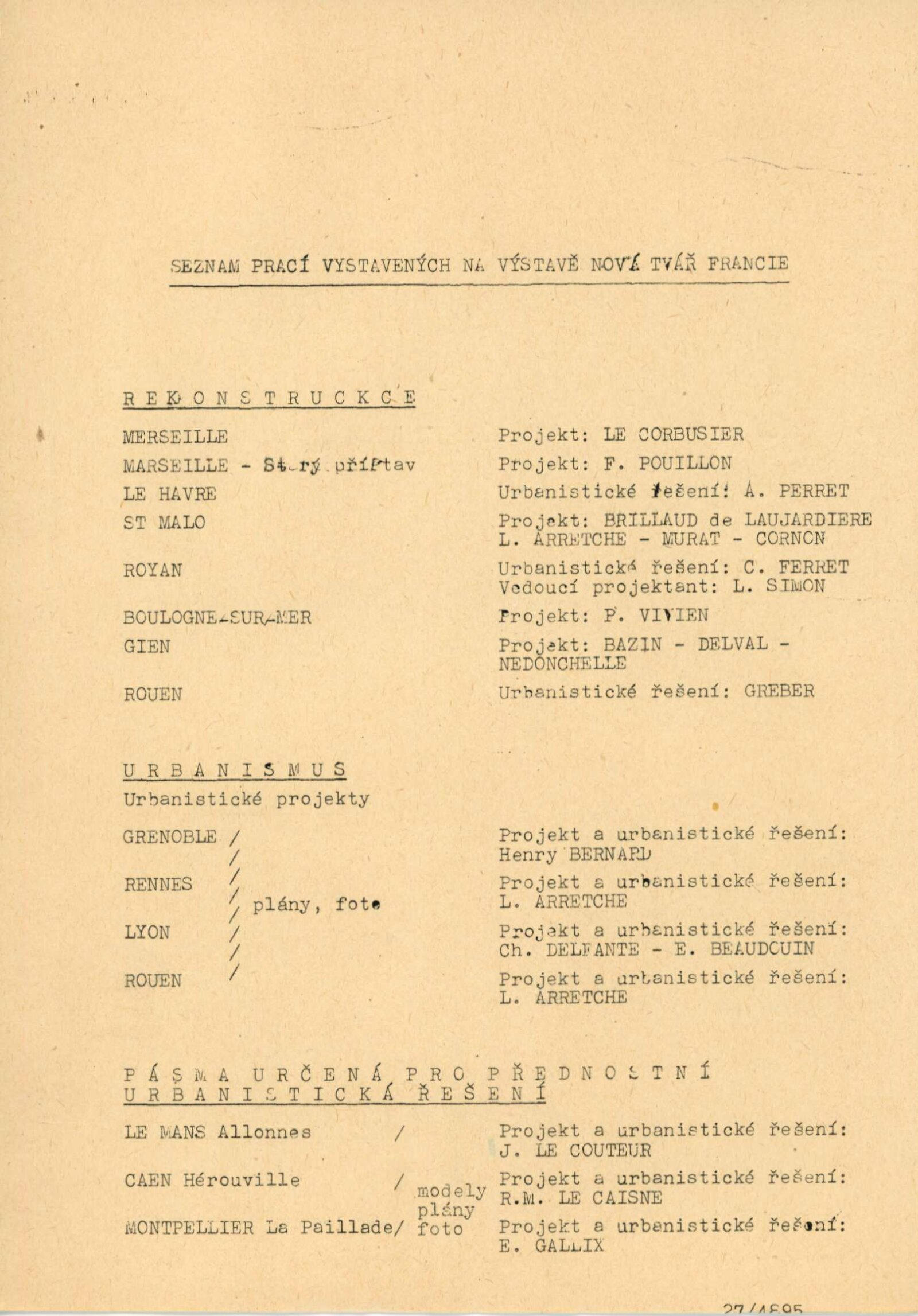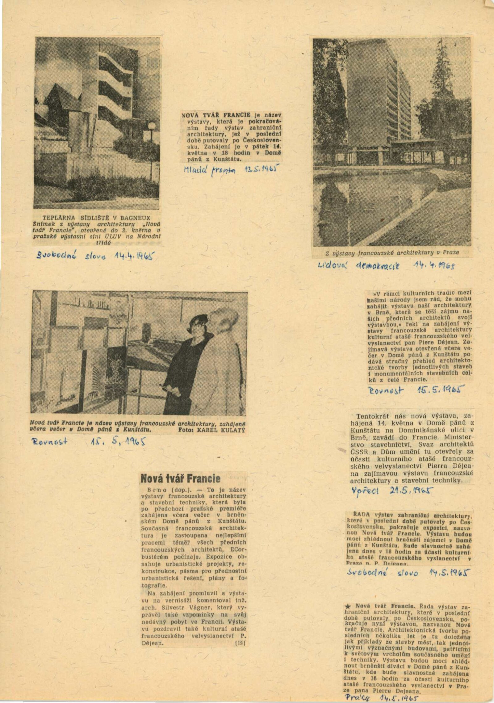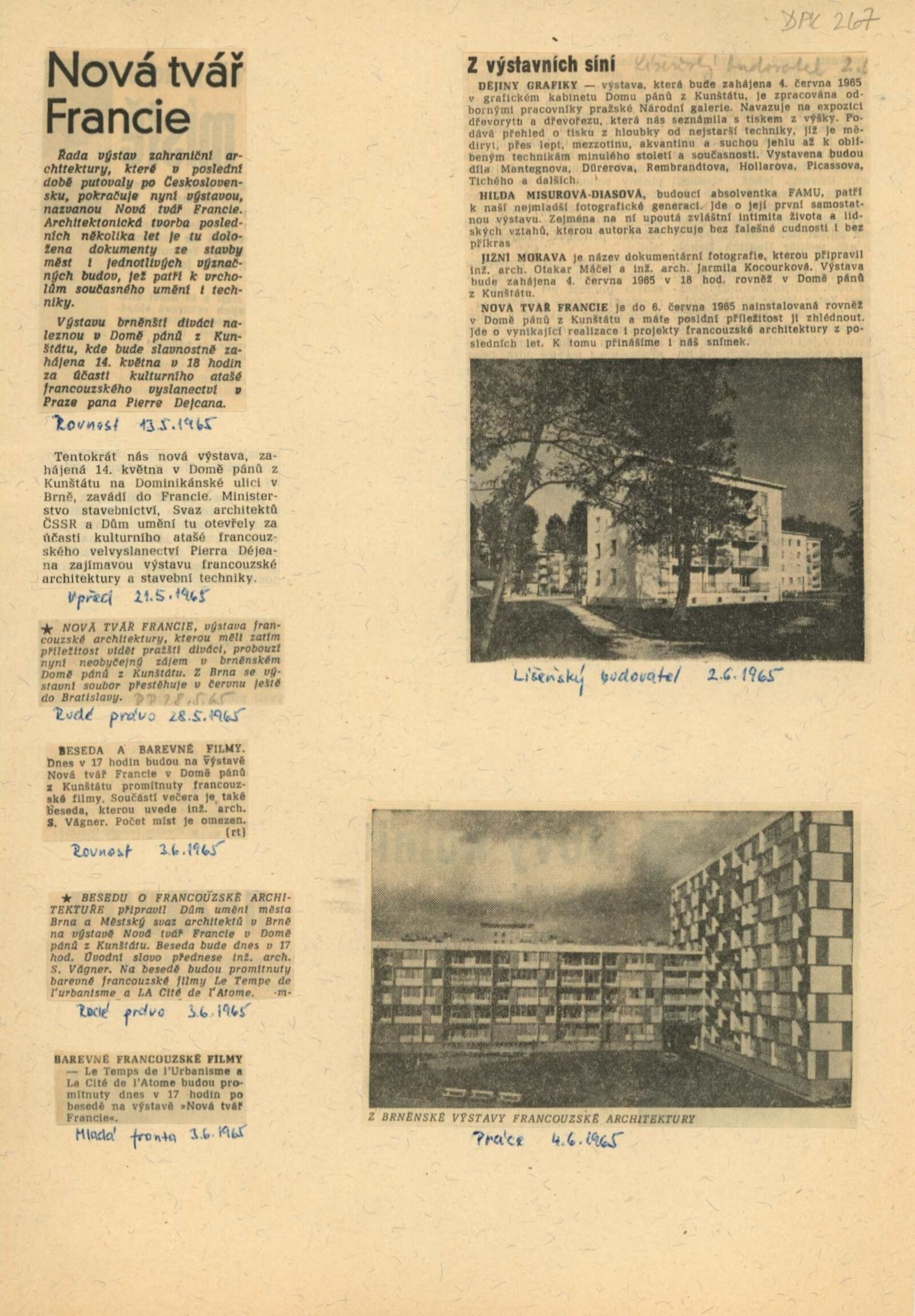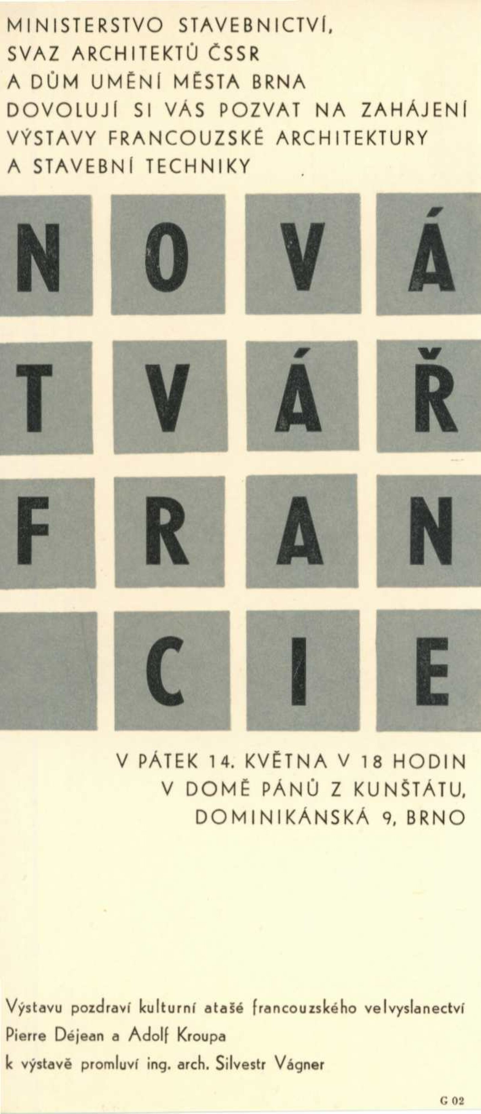 Nová tvář Francie. Výstava francouzské architektury a stavební techniky: Dům umění města Brna / Dům pánů z Kunštátu, Kabinet architektury Svazu architektů ČSSR, 14. 5. – 6. 6. 1965 / Text: Oldřich Dostál. – Brno: DUmB, 1965. – 5 s., DPK 267. – MZK; MG