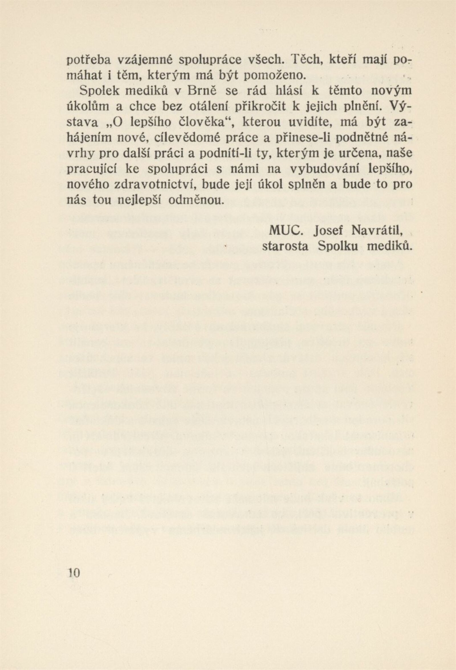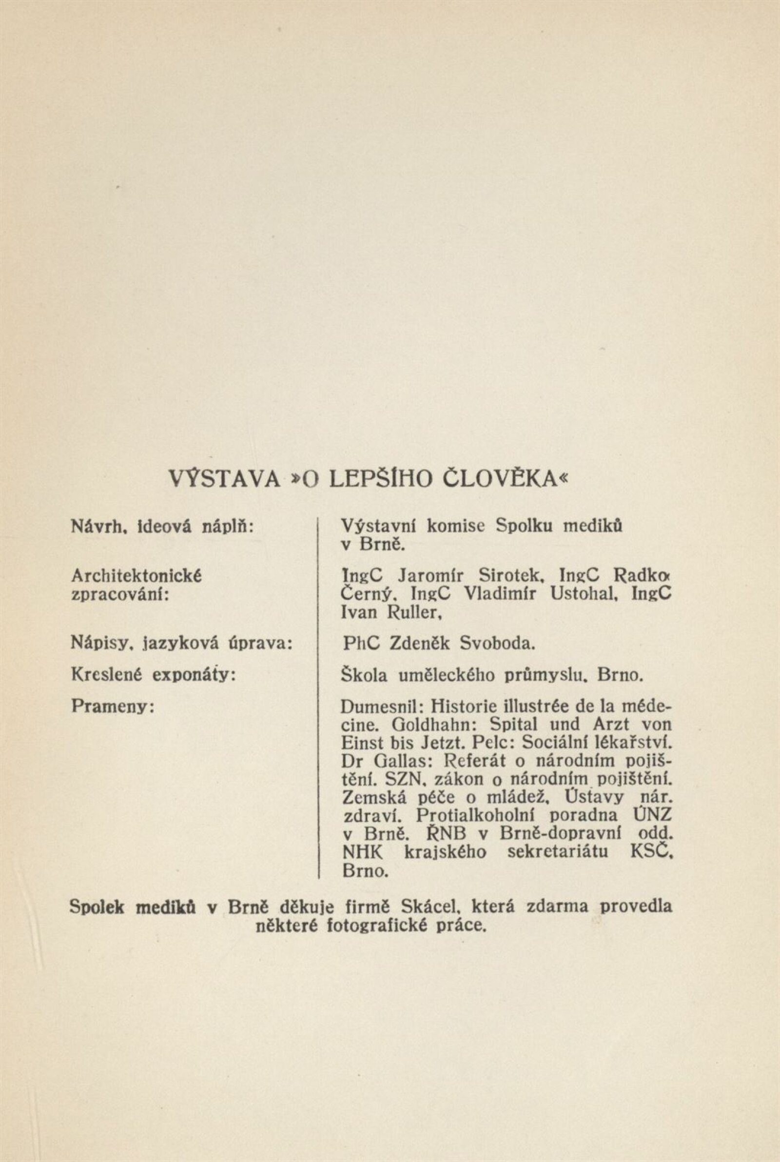 O lepšího člověka. Výstava Spolku mediků v Brně: Dům umění, únor 1949 / Texty: František Hora, Josef Navrátil, Zdeněk Svoboda. – Brno: Spolek mediků, 1949. – 13 s., DU 94. – MZK
