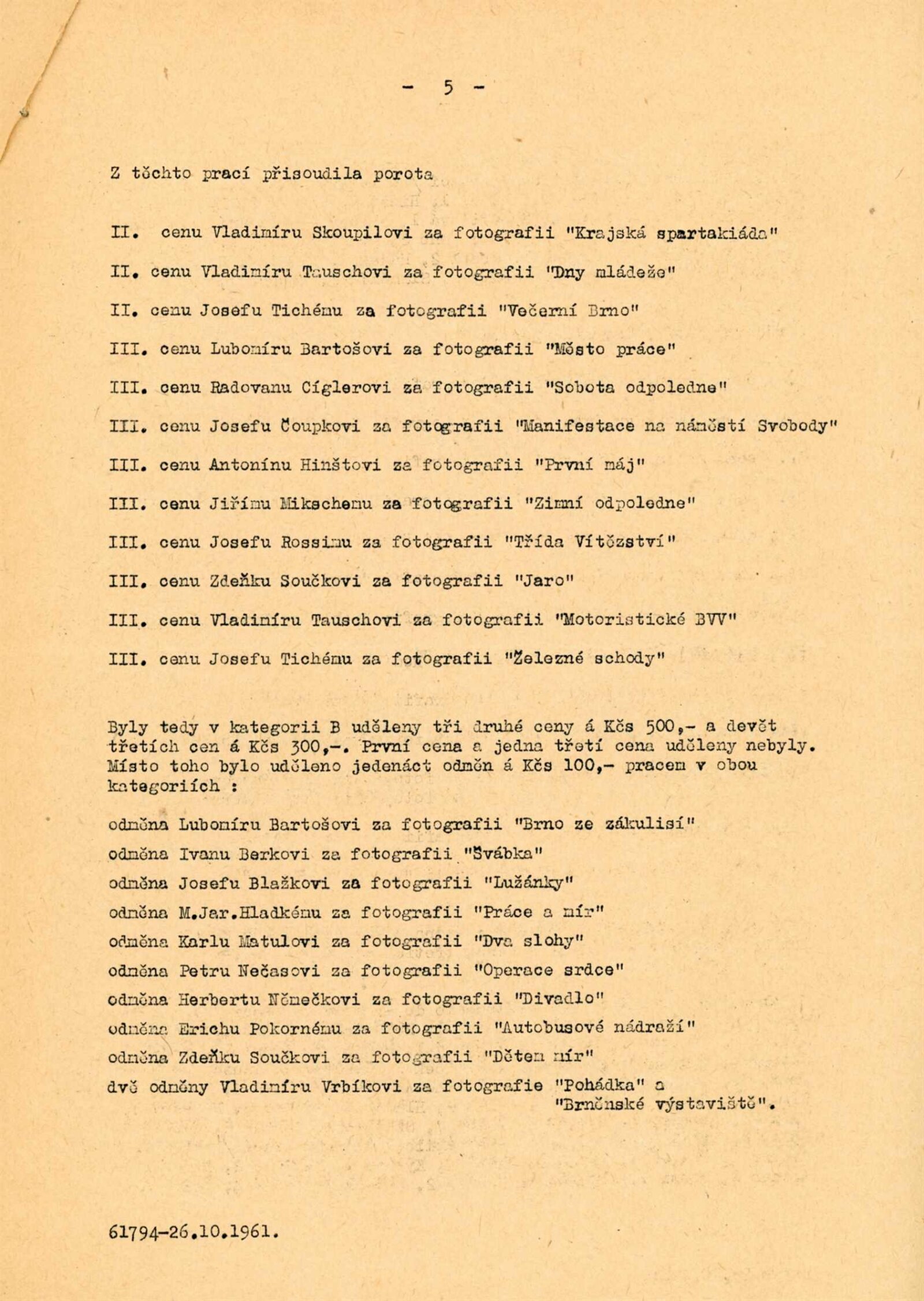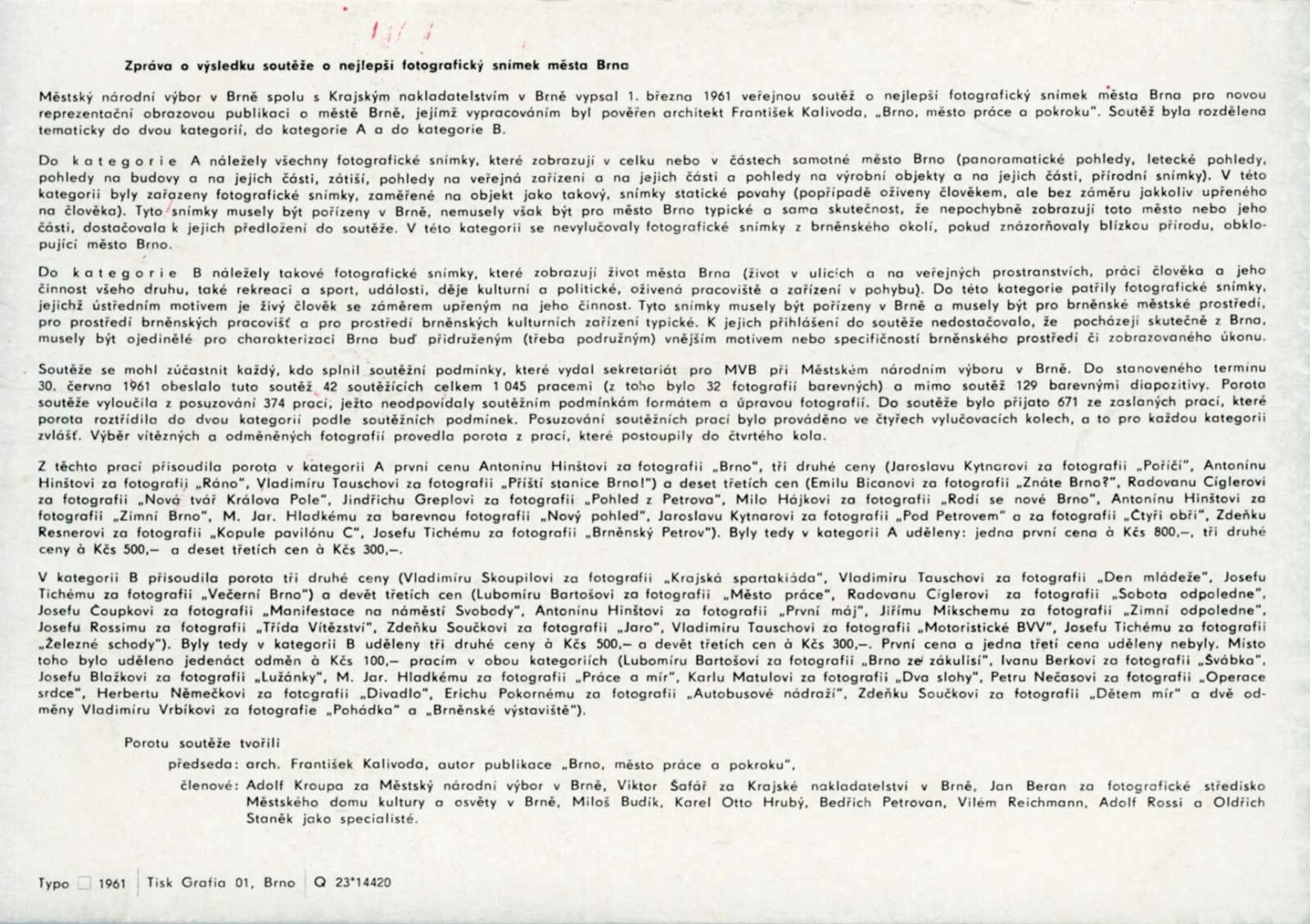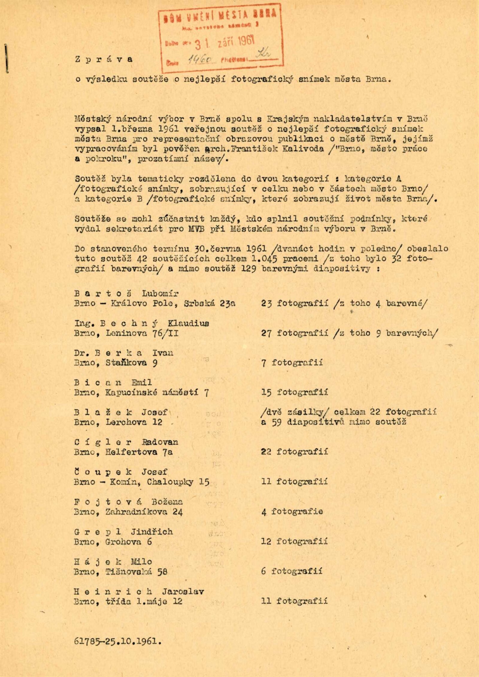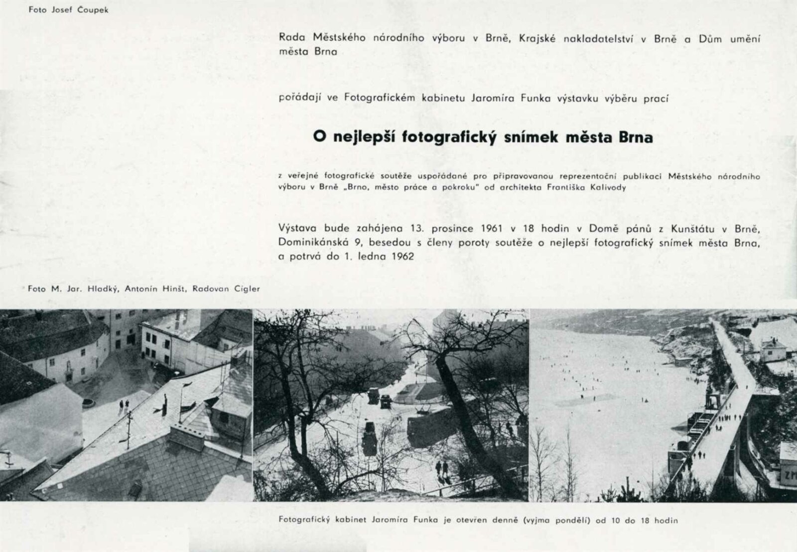 O nejlepší fotografický snímek města Brna: Dům umění města Brna / Dům pánů z Kunštátu, 27. výstava Kabinetu fotografie Jaromíra Funka, 13. 12. 1961 – 1. 1. 1962 / Katalog nebyl vydán. – pozvánka se zprávou o výsledku soutěže, 4 s., obr., DPK 130. – MZK; MG