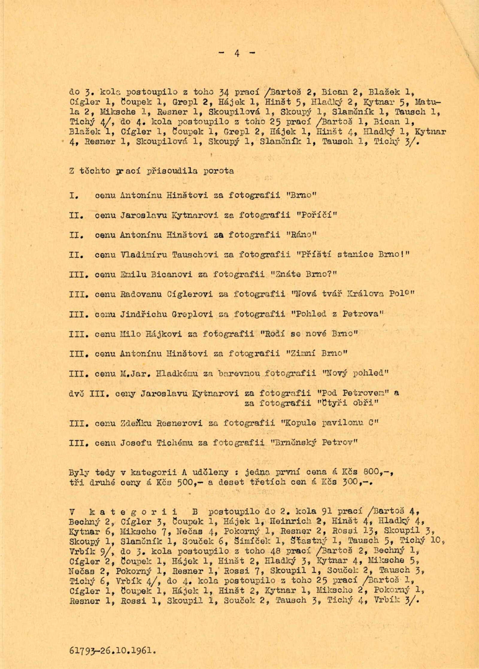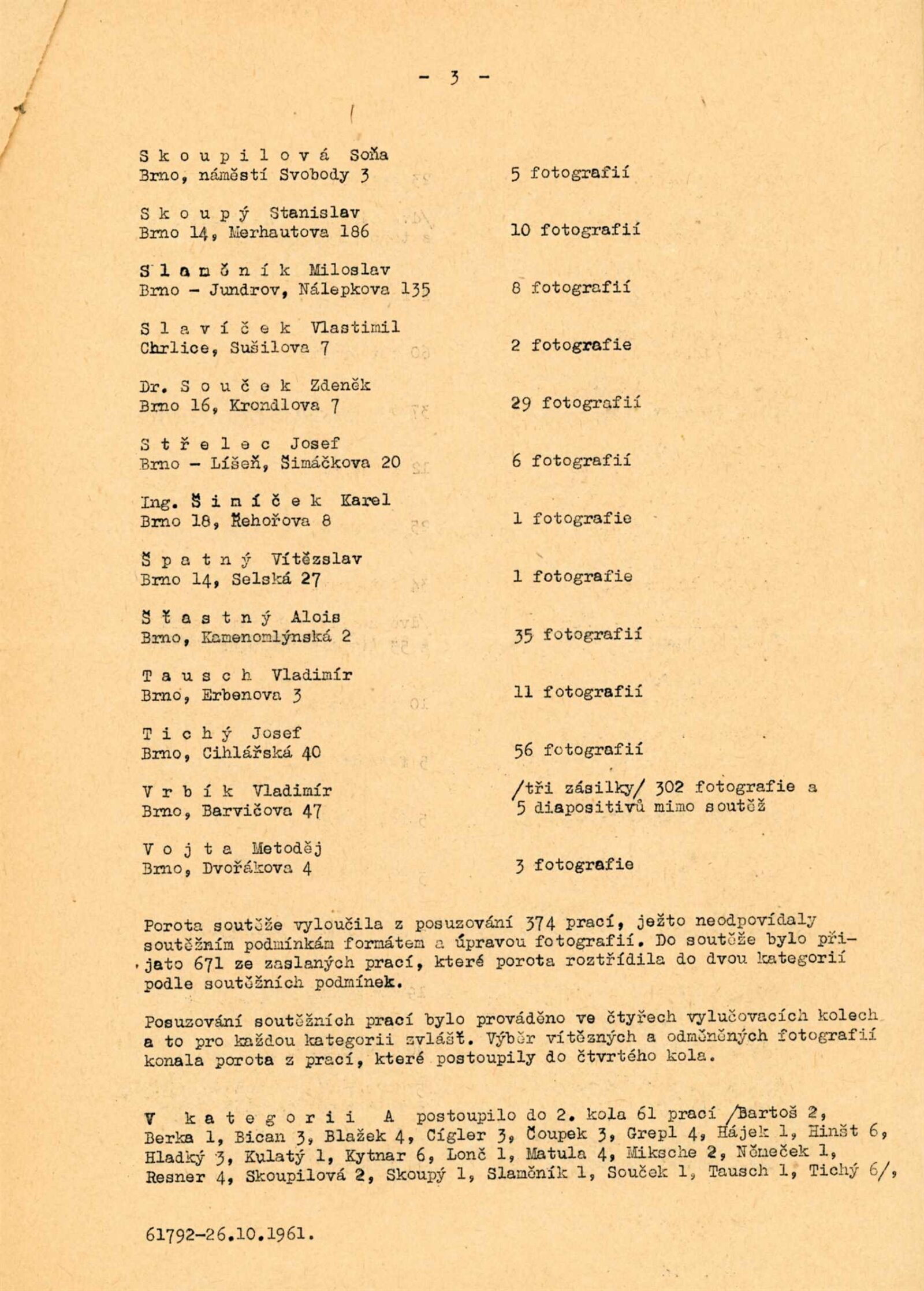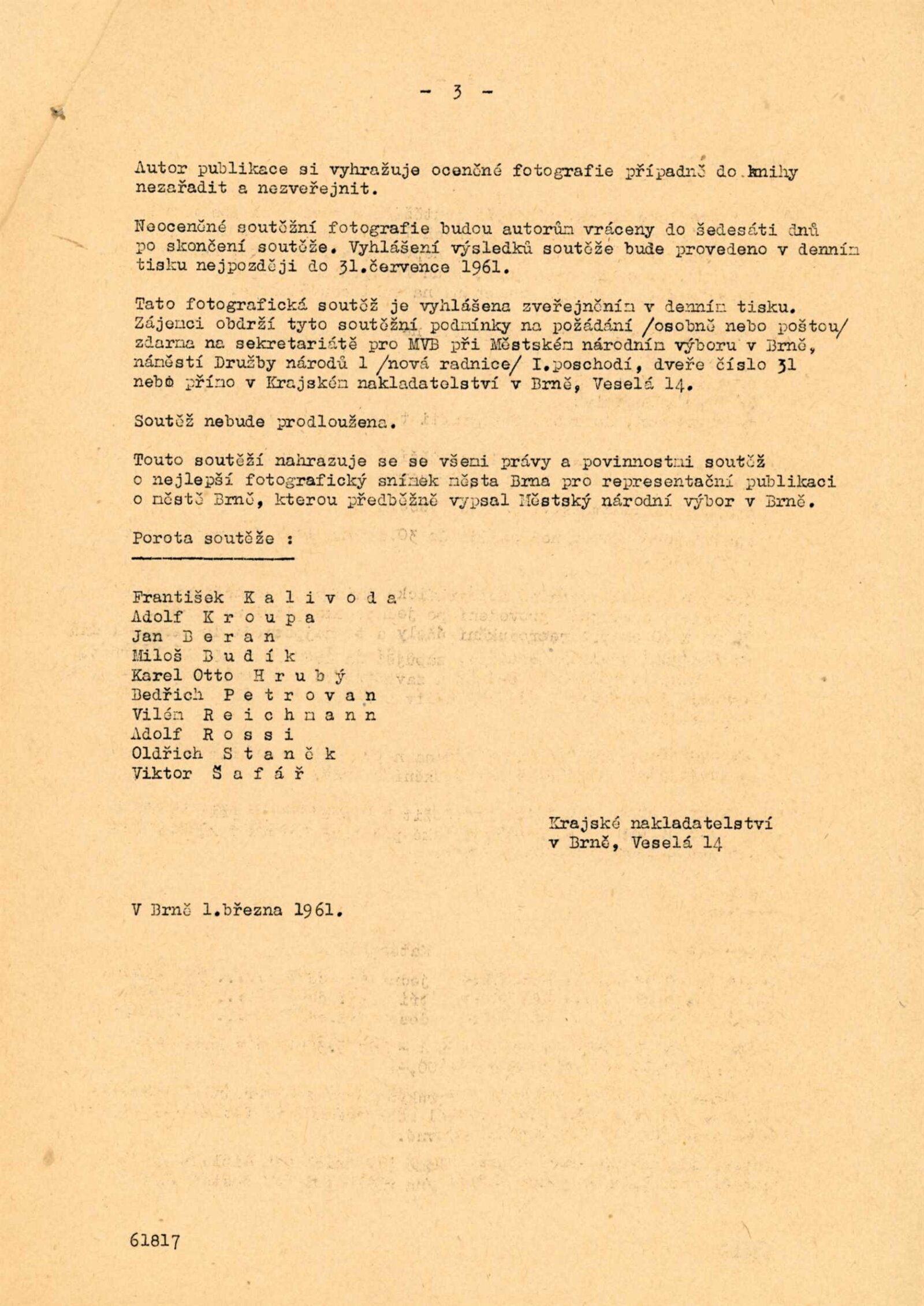 O nejlepší fotografický snímek města Brna: Dům umění města Brna / Dům pánů z Kunštátu, 27. výstava Kabinetu fotografie Jaromíra Funka, 13. 12. 1961 – 1. 1. 1962 / Katalog nebyl vydán. – pozvánka se zprávou o výsledku soutěže, 4 s., obr., DPK 130. – MZK; MG