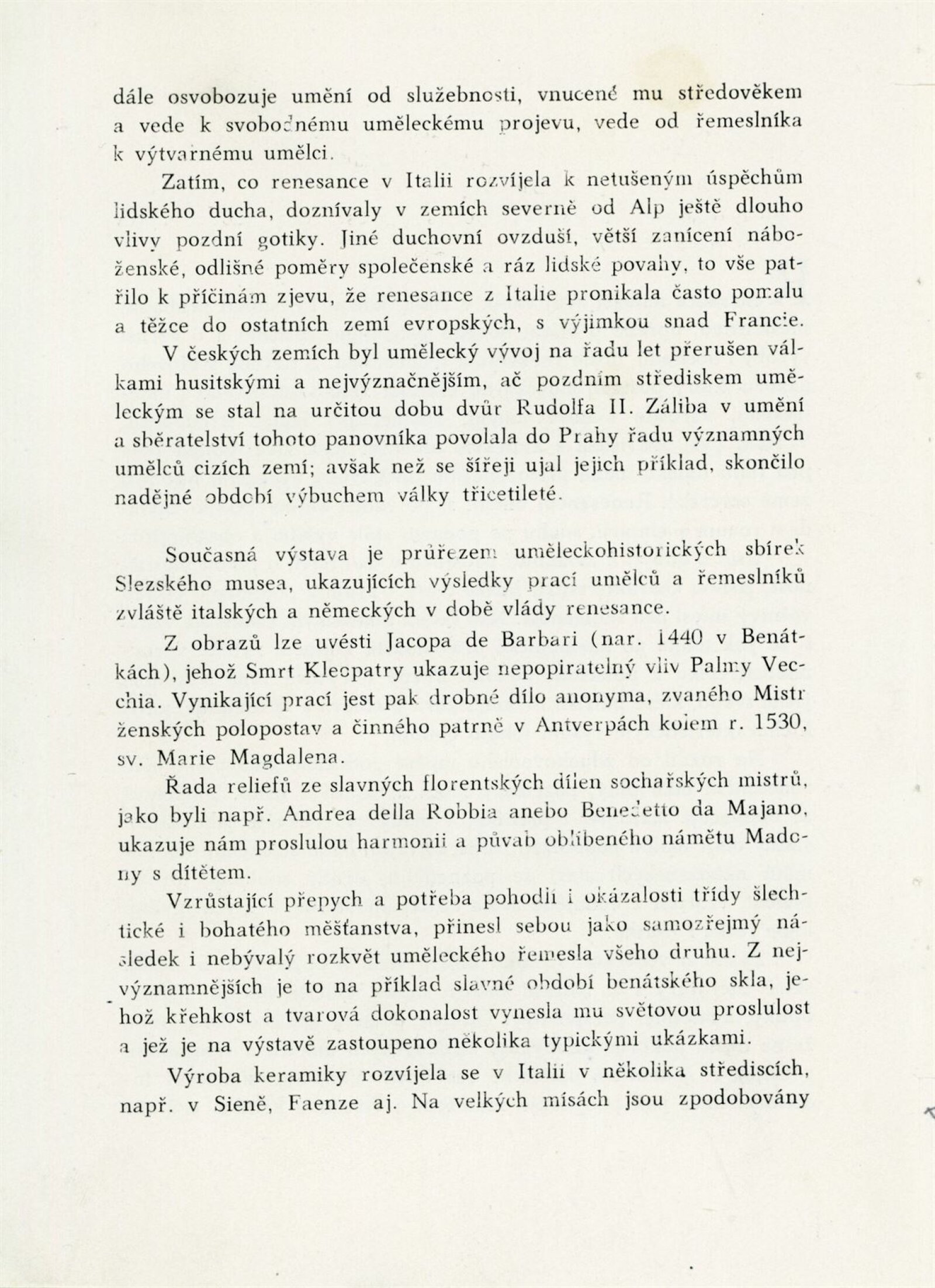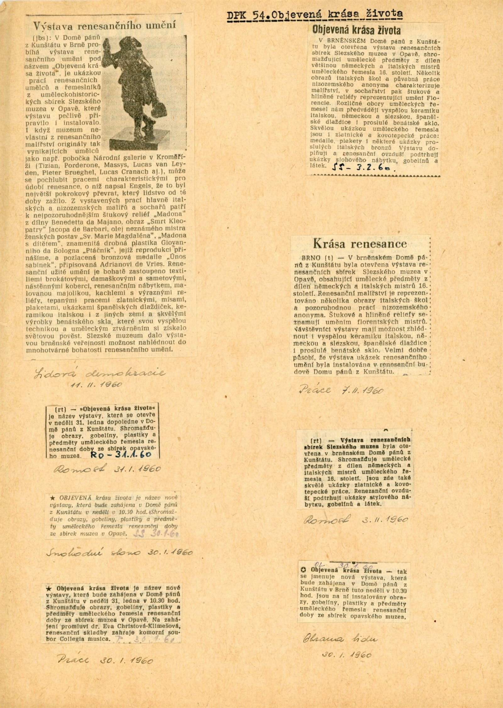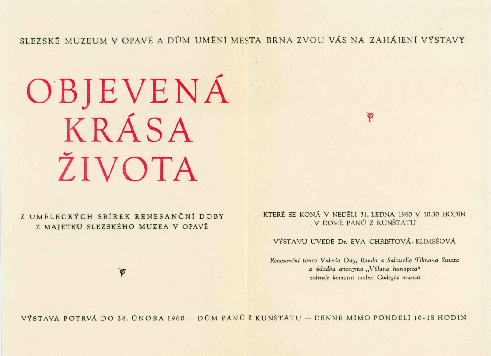 Objevená krása života. Výstava uměleckých sbírek renesanční doby z majetku Slezského musea v Opavě: Dům umění města Brna / Dům pánů z Kunštátu, 31. 1. – 28. 2. 1960 / Text: Eva Christová-Klimešová. – Brno: DUmB, 1960. – 8 s., obr., DPK 54. – MG; MMB