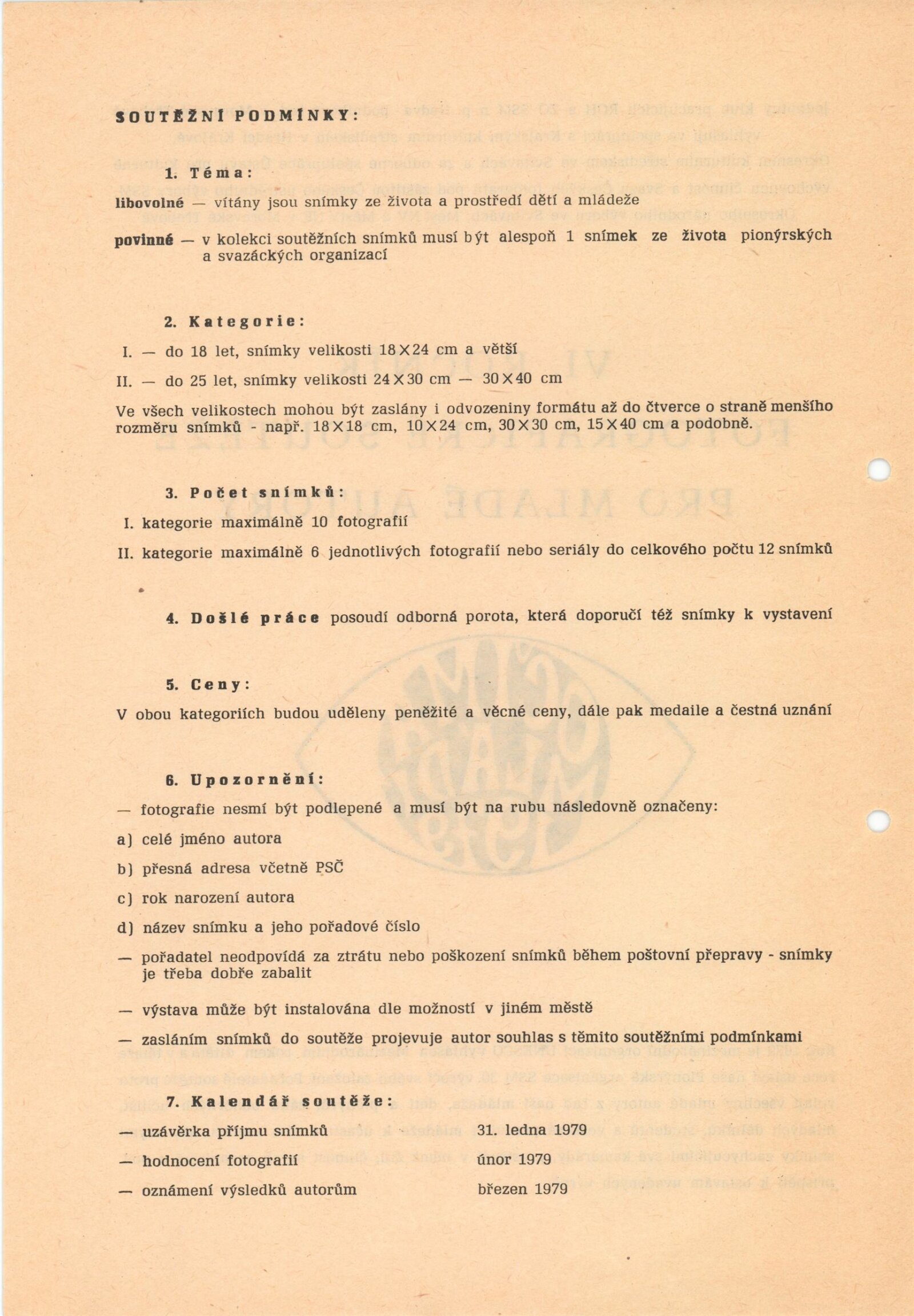 Očima mládí ´79. VI. ročník celostátní fotografické soutěže mladých autorů vyhlašené k Mezinárodnímu roku dítěte a 30. výročí založení Pionýrské organizace SSM: ... Brno, Dům pánů z Kunštátu 20. 7. – 19. 8. 1979 / Text Jaroslav Trojan. - Moravská Třebová: Jednotný klub pracujicích ROH, - 32 s., obr. DPK 711
