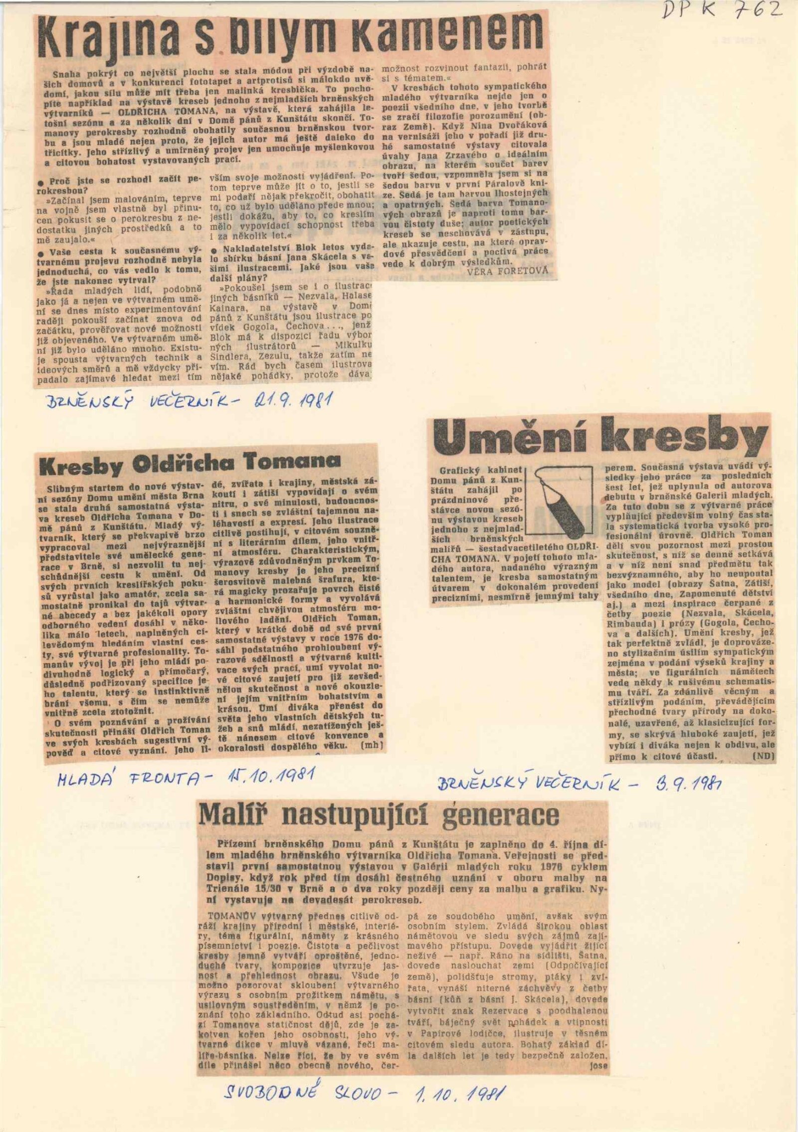 Oldřich Toman. Kresby: Dům umění / Dům pánů z Kunštátu, Kabinet grafiky, 28. 8. – 4. 10. 1981 / Text: Nina Dvořáková. – Brno: DUmB, 1980. – 13 s., obr., životní data, DPK 762. – MZK; MG