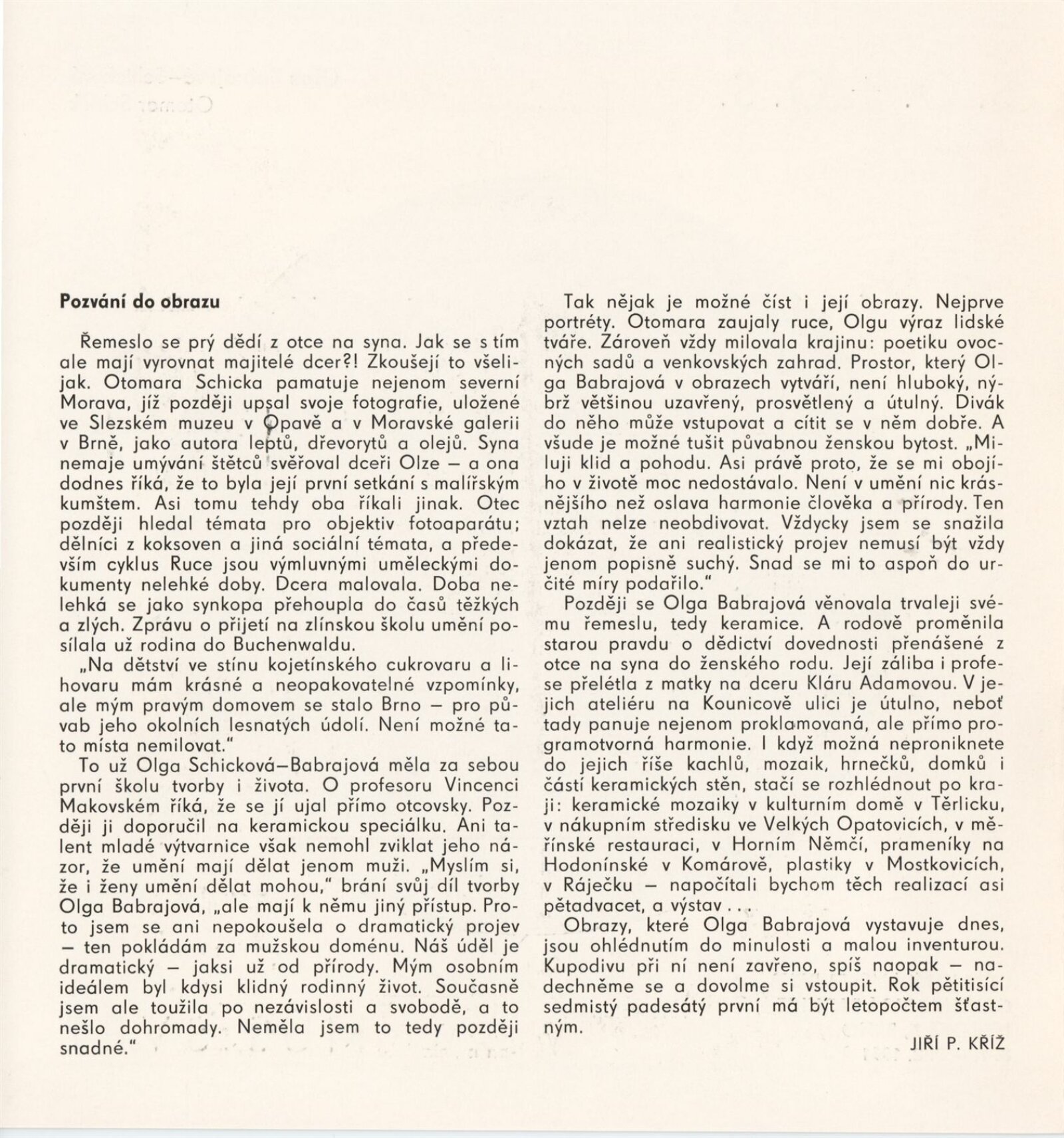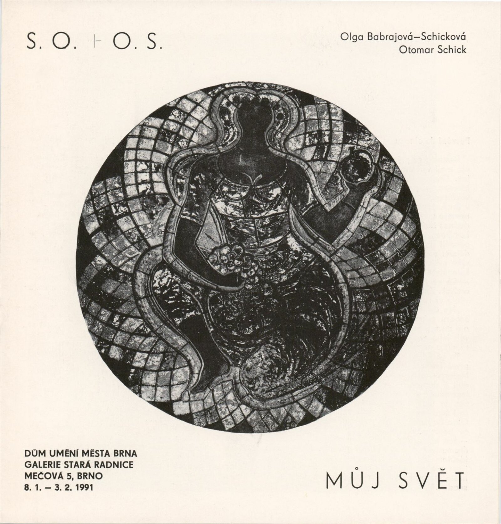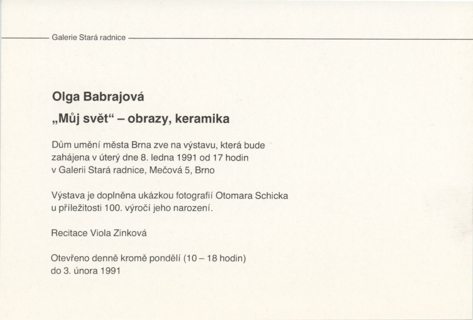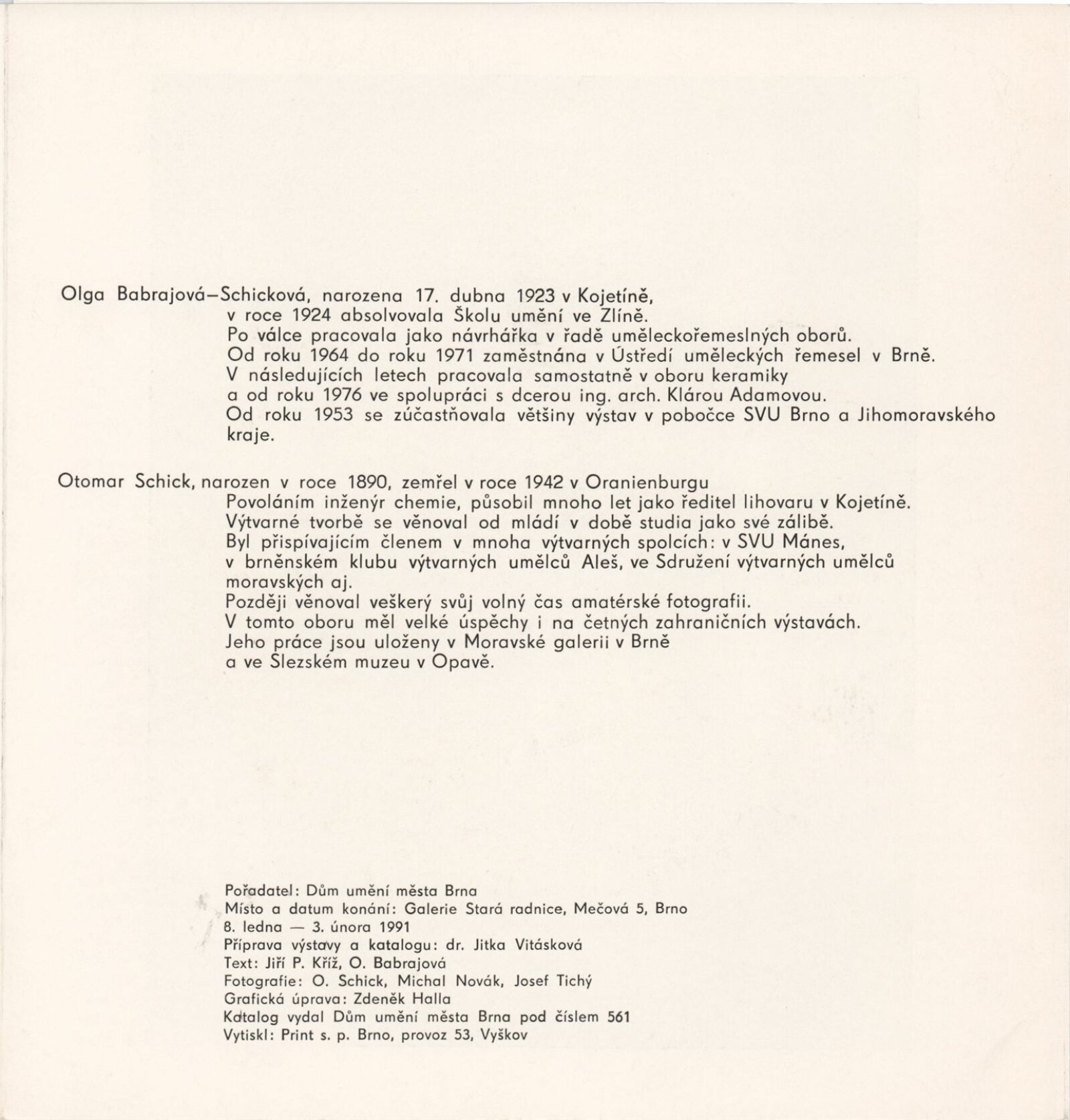 Olga Babrajová-Schicková. Otmar Schick. Můj svět. Obrazy, keramika: Galerie Stará radnice, Síň Vincence Makovského, přízemí, 8. 1. – 3. 2. 1991 / Text: Jiří P. Kříž, Olga Babrajová. – Brno: DUmB, 1991. – skládačka (6 s., obr.), životopisy, GSR 88. – MZK; MG