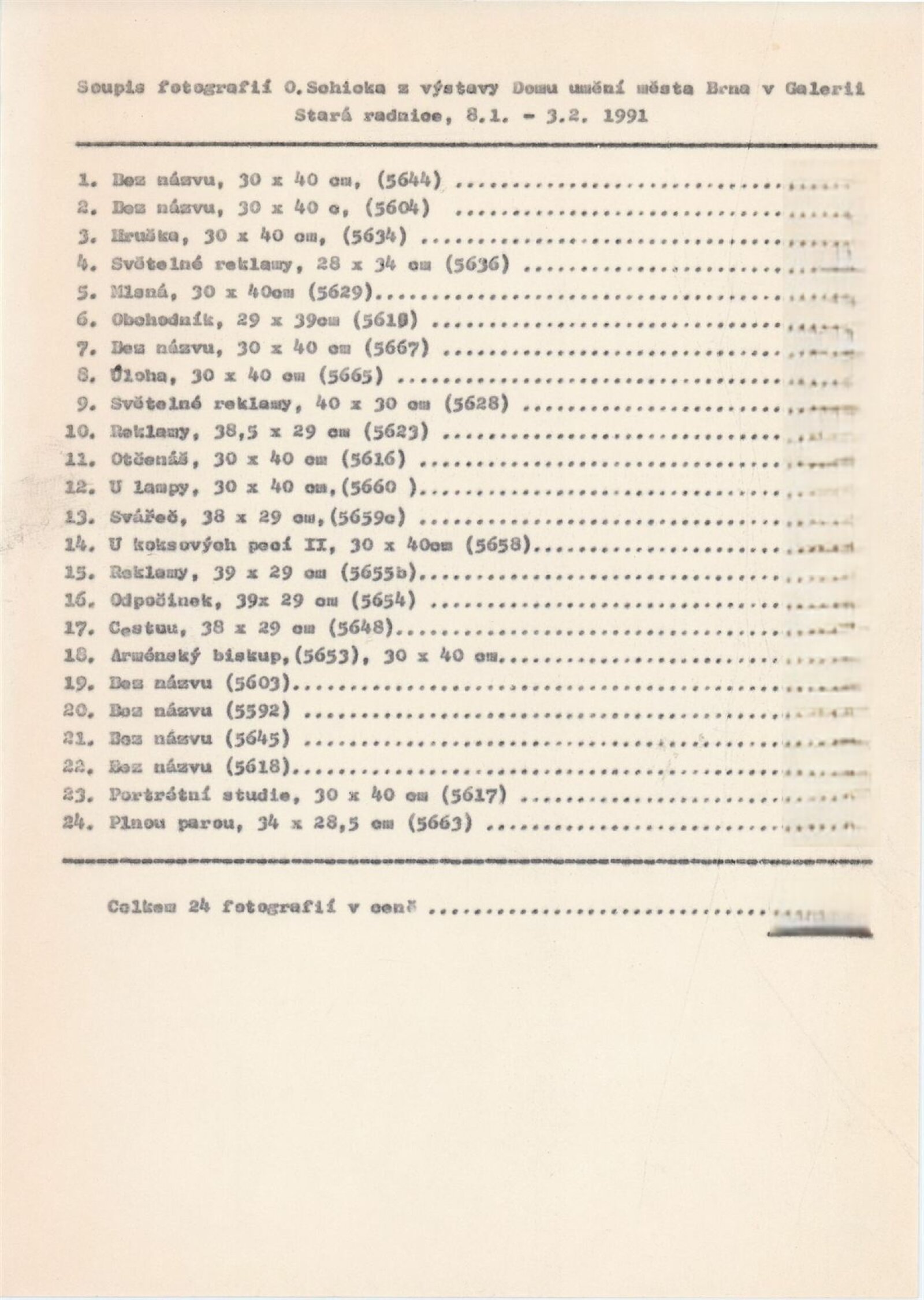 pozvánka, katalog, pozvánka, strojopis, text katalogu, životopis umělkyně, soupis fotografií O. Schicka na výstavě, korespondence, smlouva o zapůjčení s MG, žádost o výstavní termín v GSR