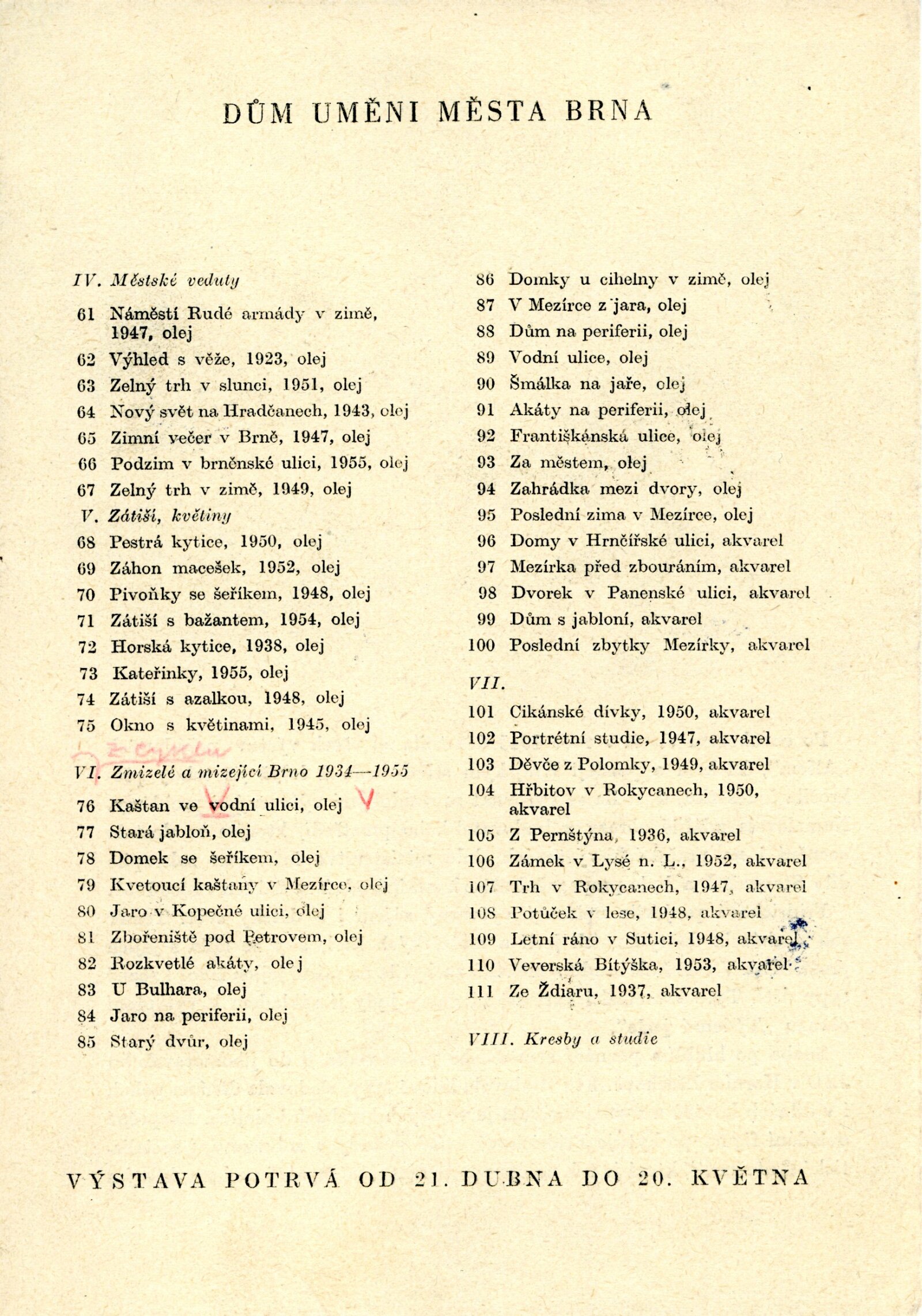 úvodní řeč (Adolf Kroupa), seznam prací, katalog/náhled, báseň (J. Hora), žádost o výstavu