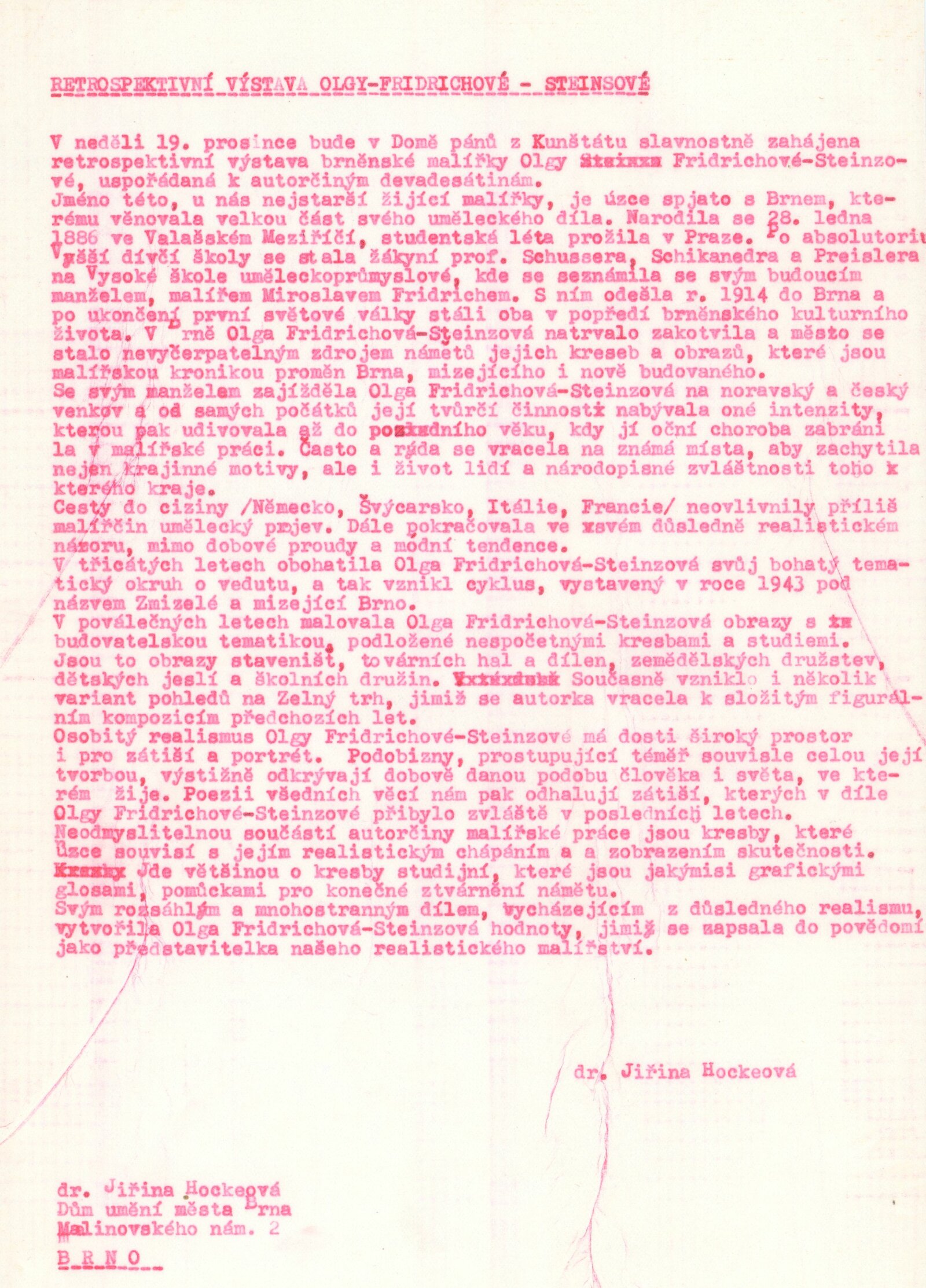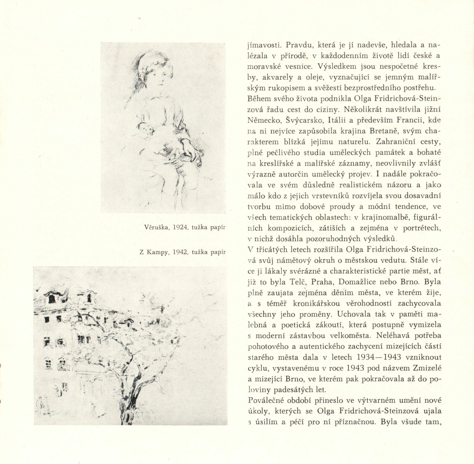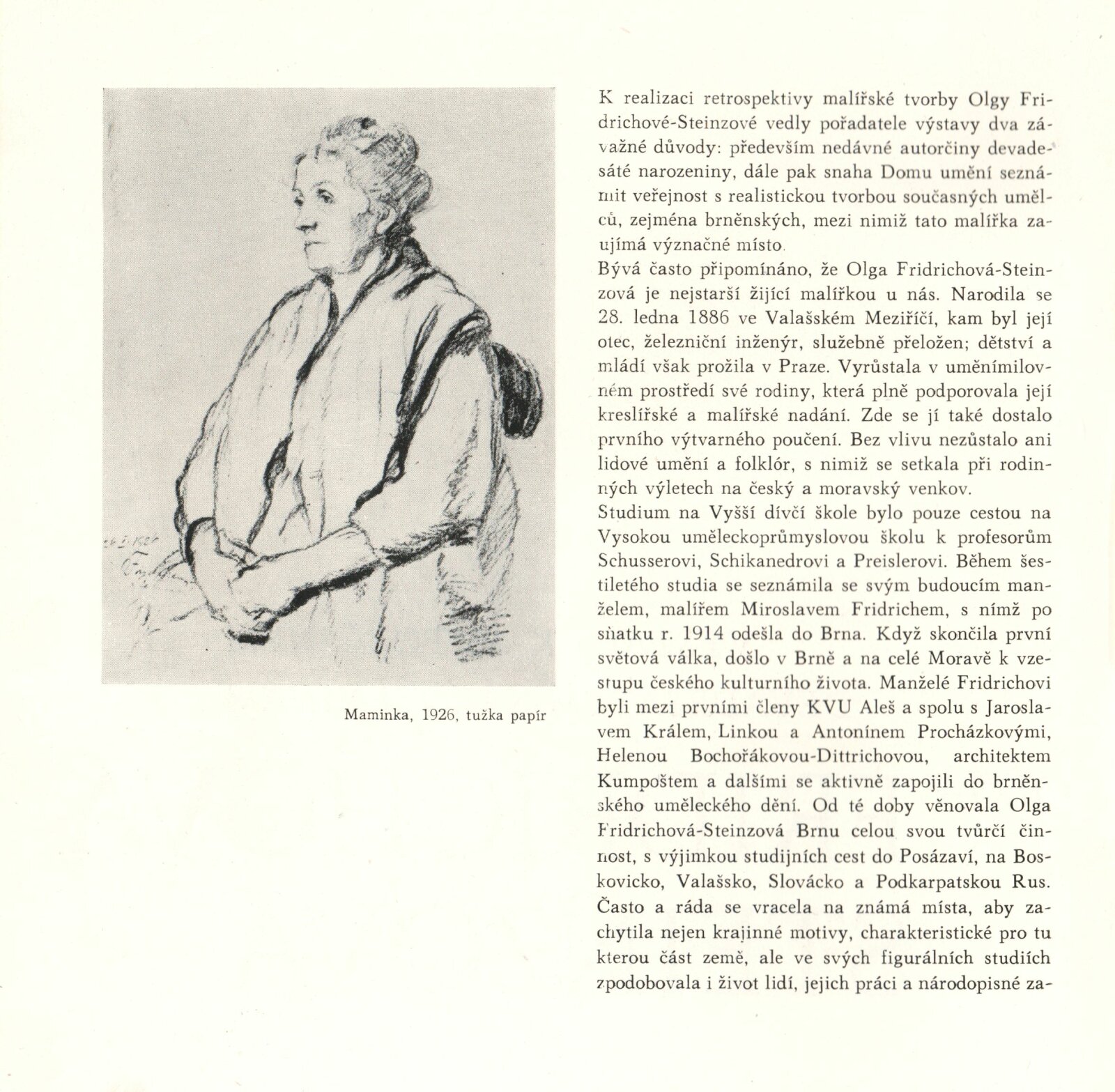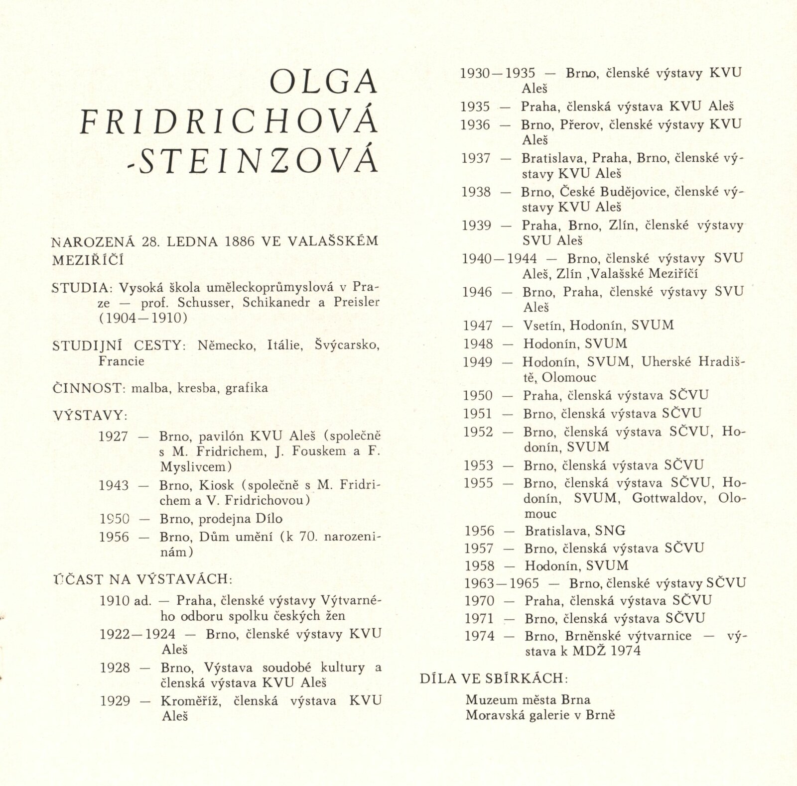 Olga Fridrichová-Steinzová. Výstava k autorčiným devadesátým narozeninám: Dům umění / Dům pánů z Kunštátu, 19. 12. 1976 – 16. 1. 1977 / Text: Jiřina Hockeová. – Brno: DUmB, 1976. – 20 s., obr., životní data, výstavy, díla ve sbírkách, DPK 639. – MZK; MG; MMB