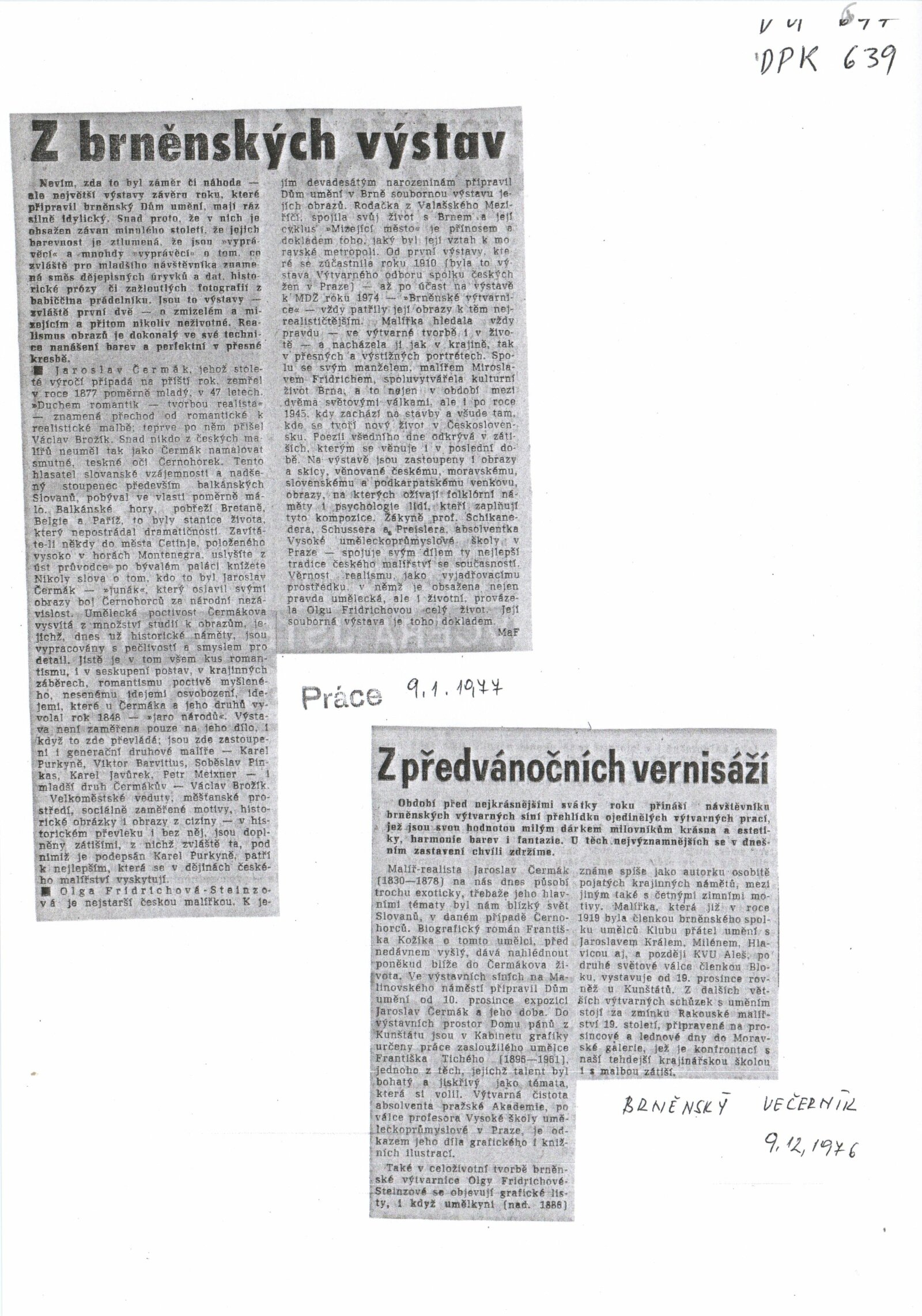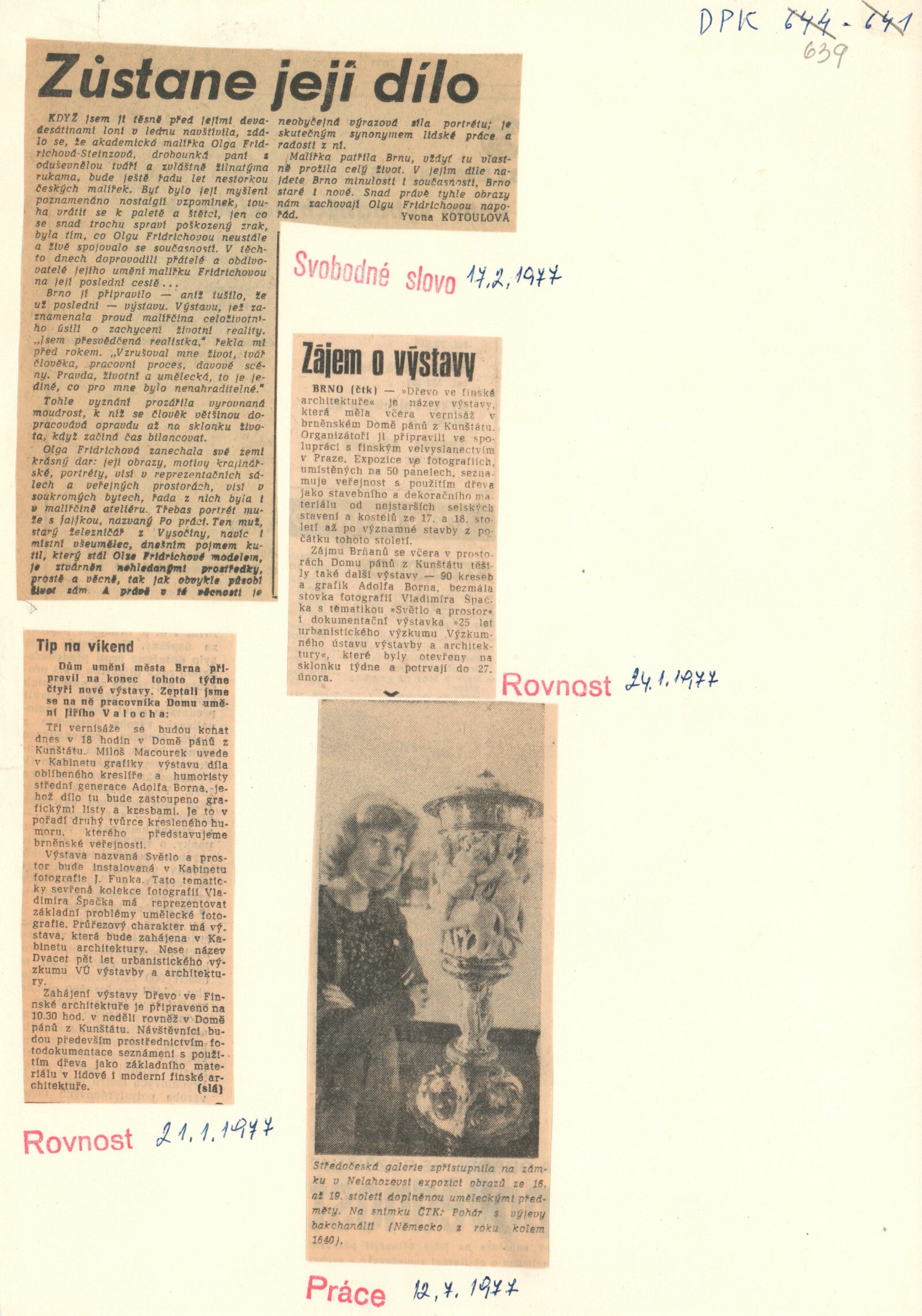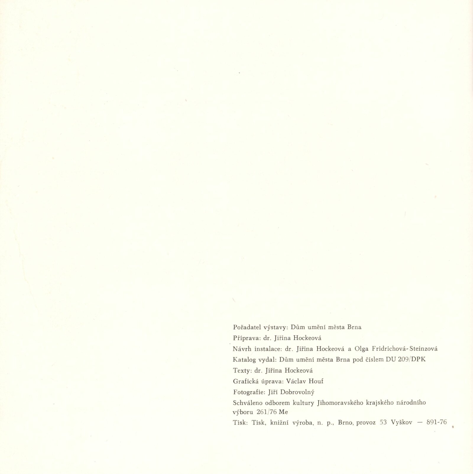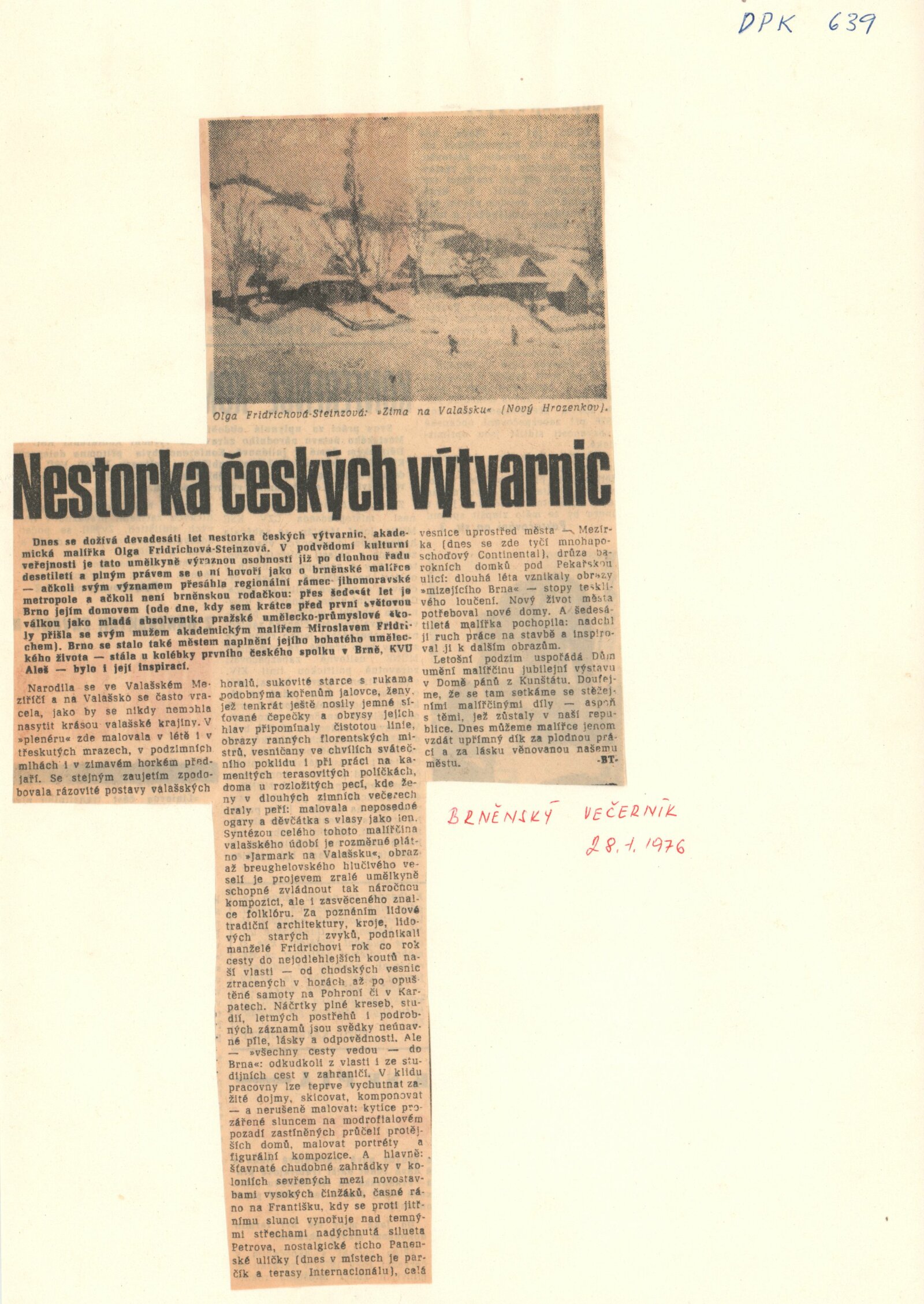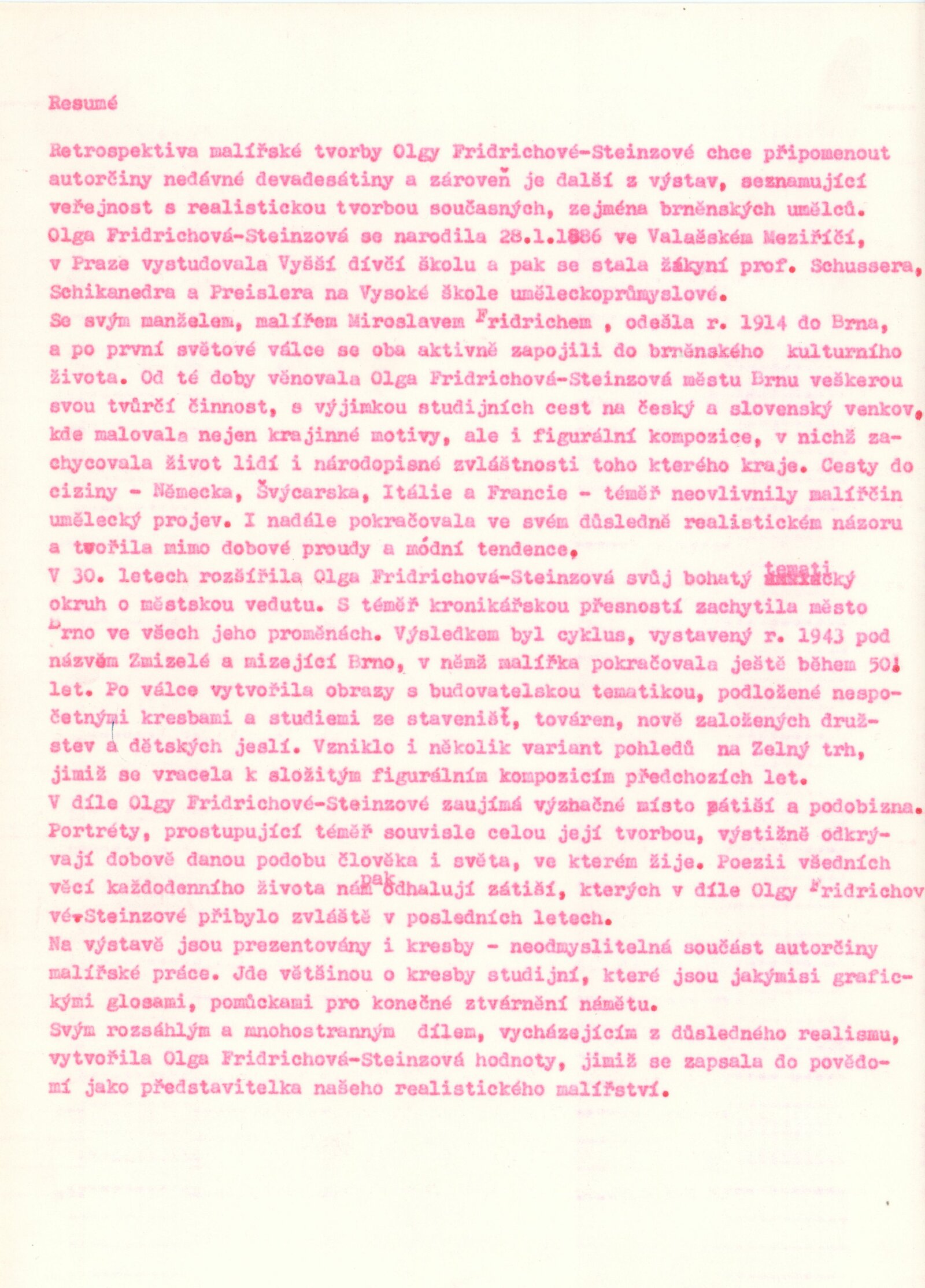 Olga Fridrichová-Steinzová. Výstava k autorčiným devadesátým narozeninám: Dům umění / Dům pánů z Kunštátu, 19. 12. 1976 – 16. 1. 1977 / Text: Jiřina Hockeová. – Brno: DUmB, 1976. – 20 s., obr., životní data, výstavy, díla ve sbírkách, DPK 639. – MZK; MG; MMB
