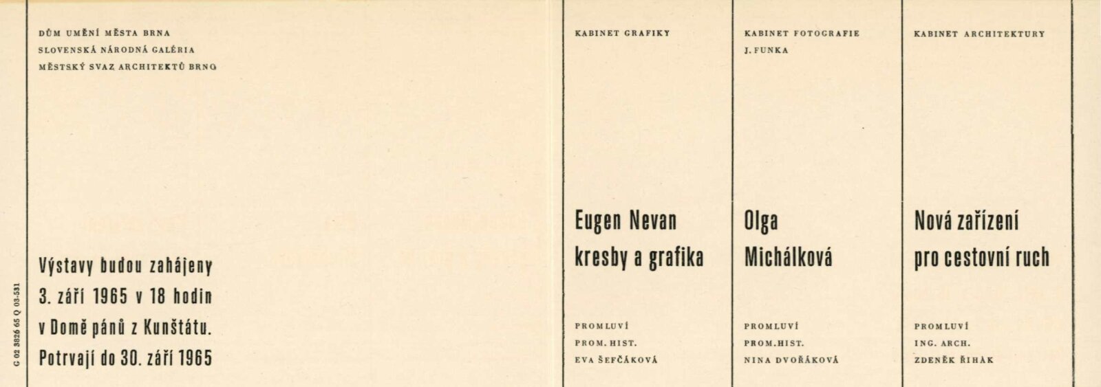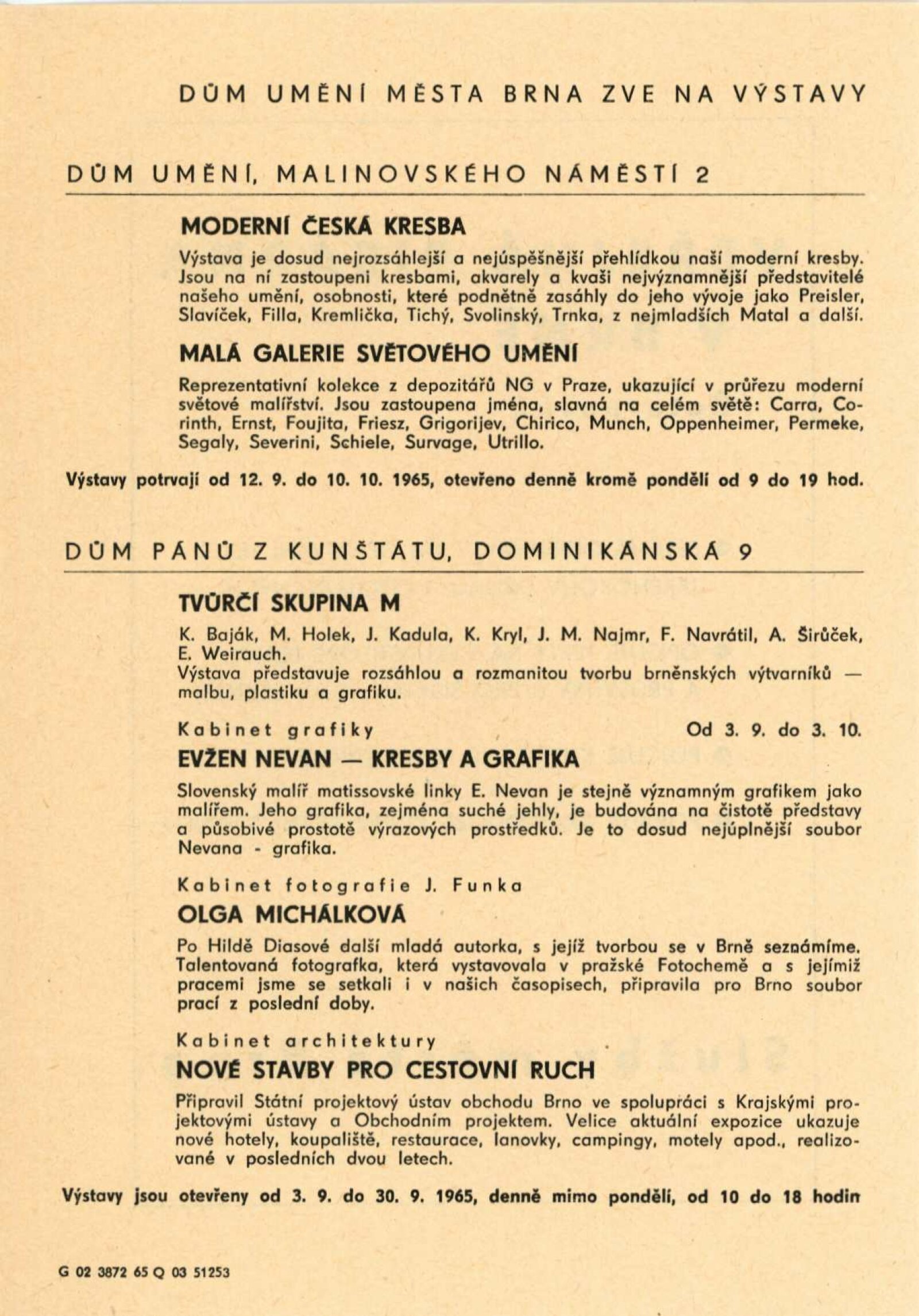 společná pozvánka DPK 277–279, leták výstav DU, korespondence (žádost o výstavu z roku 1959, příprava výstavy pro rok 1965 Olga Michálková/Nina Dvořáková), smlouva k výstavě, recenze v tisku